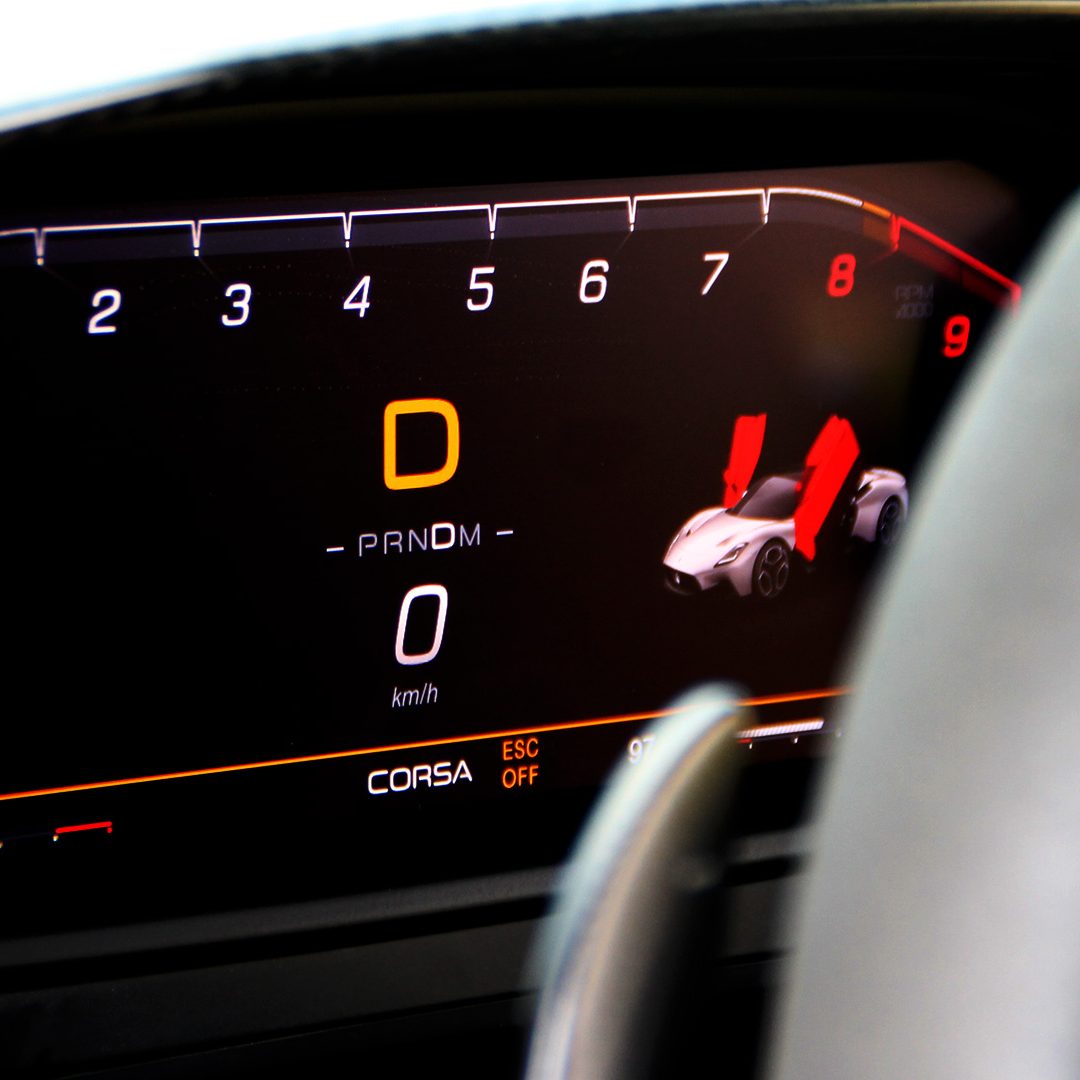 I sensi vengono immediatamente stravolti appena effettuata una breve pressione sul pulsante start. Il sei cilindri Nettuno ha una voce roca e cupa e appena va ad accendersi fa vibrare tutta la macchina al ritmo delle palpitazioni cardiache del guidatore. Si avverte fin dall’inizio su cosa i progettisti Maserati hanno scelto di concentrare l’attenzione. Sono infatti propulsore, ed emozioni alla guida, i protagonisti assoluti di questa vettura: il powertrain italiano è un mostro di potenza e di carattere. La sostanza c’è ed è tantissima: il suo ruggito è dirompente e sordo, ed è accompagnato da una profonda sonorità di scarico, nonché da una estasiante sonorità di compressione delle turbine (si avverte come un fischio profondo e marcato davvero esaltante alla guida). Come dicevamo, l’anima di questa unità può essere declinata in base a cinque diversi driving mode: GT, quello più vocato per l’impiego “quotidiano”; SPORT, nettamente più pensato per esaltare prestazioni e piacere di guida; CORSA, che amplifica all’ennesima potenza le sensazioni trasmesse in SPORT; ESC-OFF, per l’impiego tra i cordoli con assoluto protagonismo di guida e infine WET per l’impiego su fondo bagnato o umido, che restituisce una confidenza davvero esagerata anche con pioggia scrosciante come capitato a noi nel corso del nostro test. Già dalla modalità GT il propulsore fa avvertire immediatamente tutto il suo prepotente carattere: pur essendo perfettamente gestibile, scalpita e fa avvertire chiaramente al pilota che quello che desidera è correre – anche per via di un voluto effetto on-off e per un leggero turbo-lag precisamente studiato per restituire al pilota sensazioni d’altri tempi – ed esplodere in un crescendo emozionale verso la fascia alta del contagiri. Sì, perché su MC20 è la guida, pura e semplice, ad essere messa al centro assoluto dell’esperienza in abitacolo. E appena si ruota il selettore dei driving mode verso le modalità più sportive il sorriso sulla faccia del conducente inizia ad inarcarsi in maniera smisurata. A partire dalla SPORT infatti, le valvole di scarico iniziano ad aprirsi (a partire da 3.500 giri), l’assetto diviene più rigido e preciso (anche se pure in GT è possibile irrigidire le sospensioni senza optare per un propulsore più pronto) e la risposta al pedale del gas nettamente più diretta e rabbiosa. Il cambio diviene ancor più rapido, preciso e diretto per assecondare logiche sportive e l’emozione alla guida nettamente più marcata. MC20 inizia a invitare a spingere forte e il motore fa percepire di essere un mare in burrasca pronto a slanciarsi con veemenza e in maniera ineluttabile contro qualsiasi cosa lungo il suo cammino.