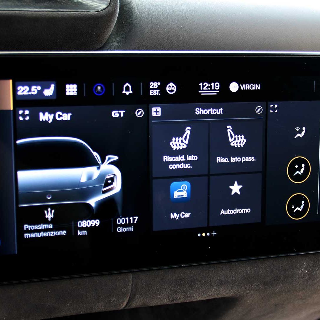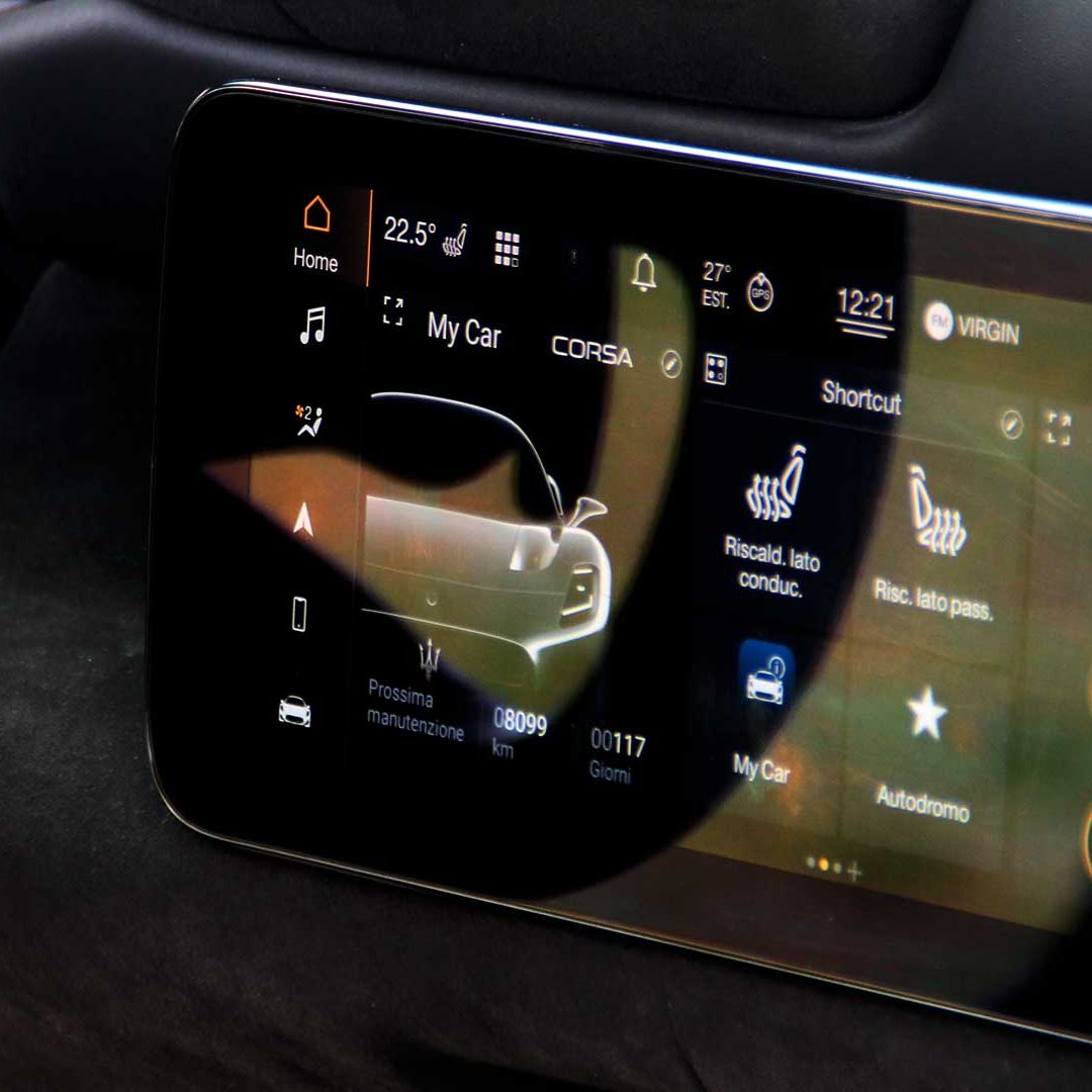 Ma la grande protagonista di questo viaggio, non si può negarlo, è lei: Maserati MC20, ovvero la vettura con cui la Casa modenese torna con prepotenza ad occupare un ruolo di assoluto rilievo nel combattutissimo segmento delle sportivissime a motore posteriore centrale. Fulcro del progetto è l’unità V6 biturbo Nettuno, un powertrain specificatamente progettato internamente per quest’auto – anche se ovviamente verrà ora ceduto al di sotto del cofano di altri modelli (primo tra tutti la nuova GranTurismo) trasportato in declinazioni diverse – e che sfrutta la tecnologia della precamera propria dei propulsori da F1. Un motore che è un trionfo di carattere, di forza bruta e di sostanza. E sono i dati a dichiararlo, prima di ogni cosa: 3.000 cc con tecnologia MTC (acronimo di Maserati Twin Combustion): un sistema di combustione completamente sviluppato internamente dalla Casa del Tridente e basato – come detto poc’anzi – sulla tecnologia della precamera adottata su propulsori di Formula 1. Ma di cosa è capace questa unità? Di impressionare, letteralmente, con semplici ma significativi numeri: 630 CV di potenza a 7.500 giri/min; 730 Nm di coppia tra 3.000 e 5.500 giri/min; oltre 325 km/h di velocità massima e uno 0-100 km/h coperto in 2.8 secondi, mentre lo 0-200 km/h viene “bruciato” in un tempo pari a 8.4 secondi. E tutto questo, su meno di 1.500 kg di peso va a tradursi in un rapporto peso/potenza di 2.33 kg/CV. Anche grazie alla sua scocca integralmente in fibra di carbonio sviluppata – come l’aerodinamica (si parla di oltre 2.000 ore di lavoro in galleria del vento e più di mille simulazioni di fluidodinamica CFD – Computational Fluid Dynamics) – nientemeno che dalla Dallara. L’abitacolo è molto essenziale ed elegantemente sportivo: le soluzioni sono raffinate – questo è a dir poco evidente – in quanto l’ambiente è estremamente curato e mette alla vista impunture a vista, rivestimenti in pelle e Alcantara e tantissimi elementi in fibra di carbonio. Eppure al contempo incredibilmente vocato al racing: c’è solo quello che serve e nulla di più. Tutti i parametri vengono gestiti e illustrati da due display digitali da 10.25”, sia per strumentazione che epr infotainment, il cui cuore di quest’ultima è un sistema multimedia di ultima generazione MIA (acronimo di Maserati Intelligent Assistant) e affiancato dal programma Maserati Connect. In grado di dialogare anche con gli smartphone, Maserati MC20 è dotata di serie di un impianto audio a 6 altoparlanti. Opzionale l’impianto audio Sonus Faber a 12 altoparlanti (che fa davvero egregiamente il suo lavoro per potenza e pulizia del suono) montato sulla vettura da noi provata. Completamente digitale anche lo specchietto retrovisore centrale in abitacolo, che sfrutta una telecamera ad altissima risoluzione per mostrare quel che accade alle spalle della vettura per ovviare alla mancanza di visibilità del motore posteriore-centrale, sia in fase di marcia che di manovra (frangente quest’ultimo in cui il retrovisore viene coadiuvato anche dal display centrale).