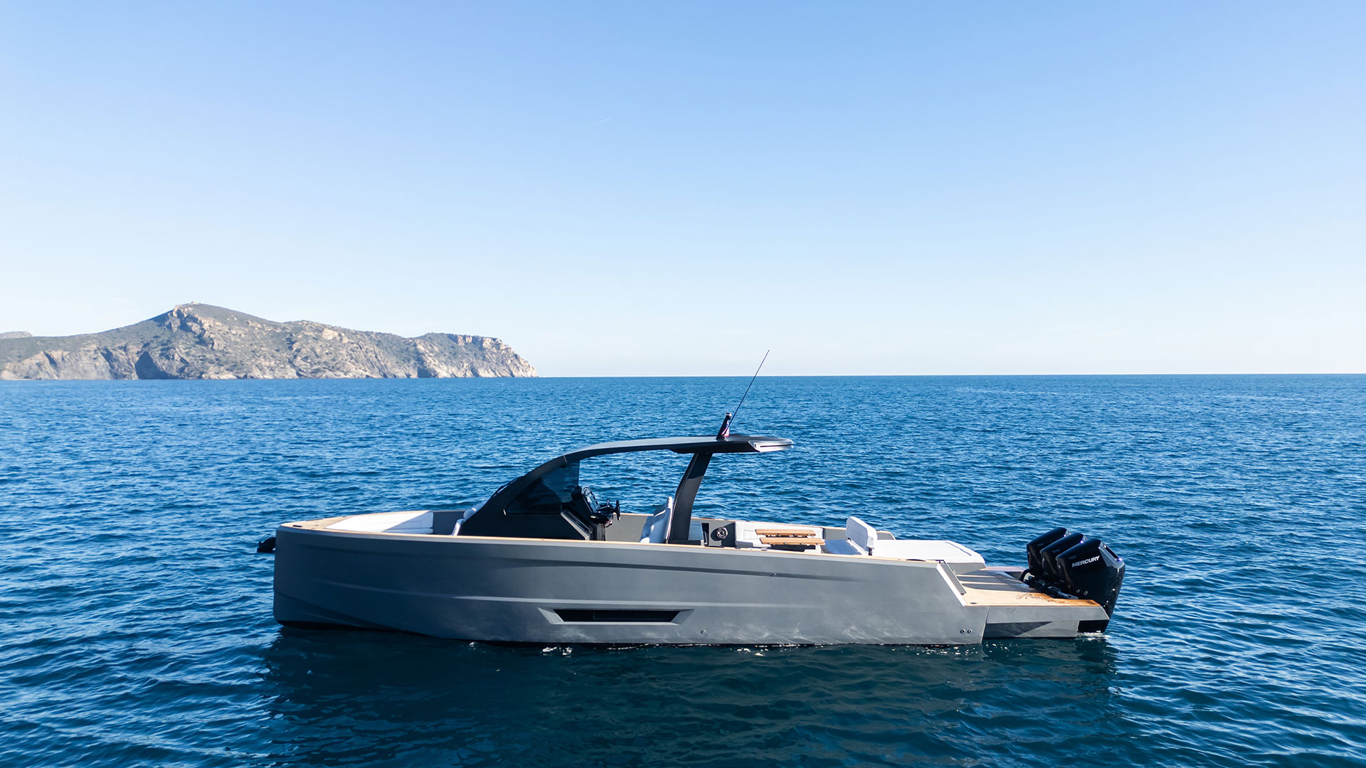 L’hard-top in fibra di carbonio è stato integrato con un sistema audio JL con due altoparlanti sull’hard-top e sei distribuiti intorno all’imbarcazione. Sia a prua che a poppa c’è un’area prendisole e la zona poppiera ha un ampio spazio di stivaggio.