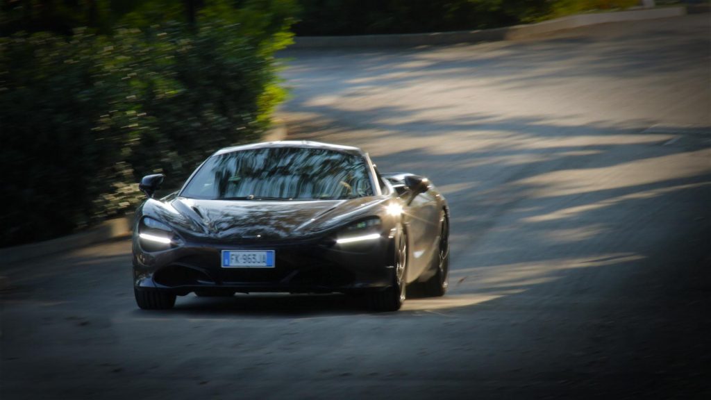 E nonostante la marcata sportività, la seduta risulta essere comoda: le bellissime sellerie non affaticano, anzi, invogliano a macinare km insieme ad una vettura pensata principalmente per trasmettere piacere di guida. Un concetto questo che diviene evidente non appena si va a premere il pulsante start per dare vita al motore. La sonorità del V8 biturbo da 4.0 litri inizia a pervadere un abitacolo che trova tra i suoi grandissimi pregi una luminosità mai vista su una supercar con architettura coupé. Un risultato questo dovuto sì ad una sapiente ripartizione delle superfici trasparenti, ma anche legato all’introduzione di inedite soluzioni per le stesse, come la presenza di queste all’interno della parte alta delle portiere e che dalla linea del montante sconfinano verso il top, manifestandosi così come un vero e proprio inserto piuttosto che come un vero e proprio tetto in vetro, oppure come l’inserimento di elementi del lunotto nei montanti posteriori, dotati di cavità, allo scopo di far permeare una maggior quantità di luce all’interno del cockpit: una soluzione a sua volta mai vista prima d’ora su una vettura di questo segmento e con propulsore posteriore centrale. Una leggera pressione sul gas e la McLaren 720S inizia a scattare in avanti indirizzandola tra le prime curve tramite un volante che è un piacere impugnare: lo sterzo conferma infatti precisione e reattività già apprezzati su 570S e 570S Spider, introducendo però una sagomatura ancor più pensata a favorire ergonomia ed efficacia di guida grazie a delle piacevoli scanalature poste in corrispondenza delle 9:15. Una componente incredibilmente diretta e che fa il paio a sospensioni pensate tanto per assecondare la guida sportiva quanto per garantire il comfort su strada: nonostante la marcata inclinazione racing, la 720S assorbe molto bene le imperfezioni del manto stradale, demarcando così con forza tutta la sua bontà progettuale. Per quanto pensata per garantire efficacia di guida e precisione in curva, la supercar di Woking non dimentica di dover essere impiegata anche su strada, consentendo così a due anime contrapposte tra loro come il Diavolo e l’Acqua Santa (ovvero vocazione racing e fruibilità quotidiana) di coesistere in armonia in un unico corpo.