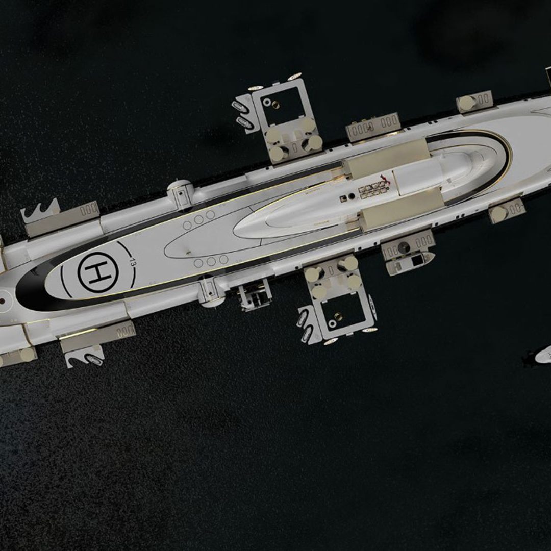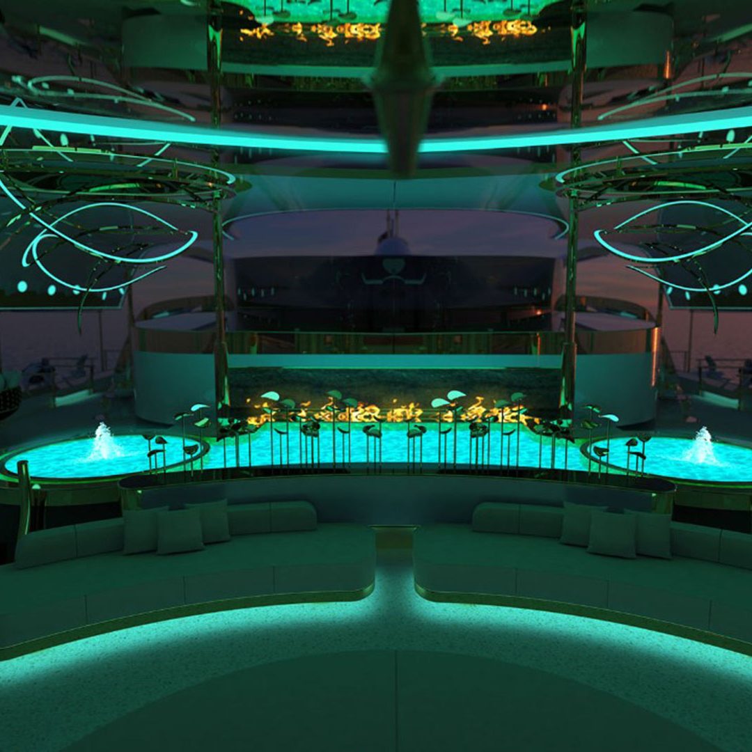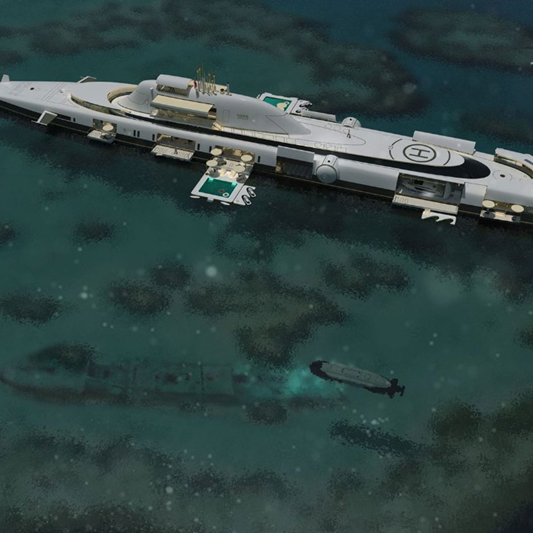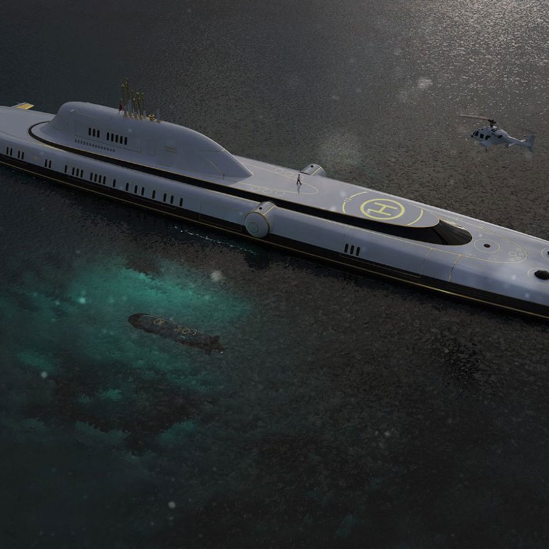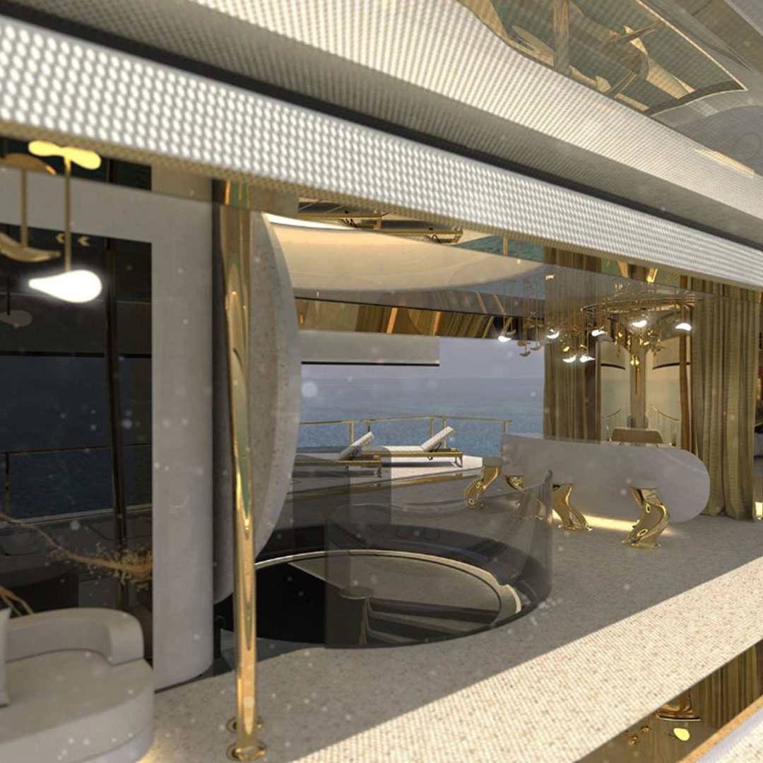 Tra le varie chicche troviamo infatti delle superfici panoramiche in vetro per poter godere di una vista unica in immersione (ma anche a filo d’acqua) e immancabili comfort come cinema e area gym. E a quanto elencato si aggiungono anche le piscine (che sono due e simmetriche nonché disposte sui lati dello scafo) e l’eliporto per l’atterraggio dell’elicottero.