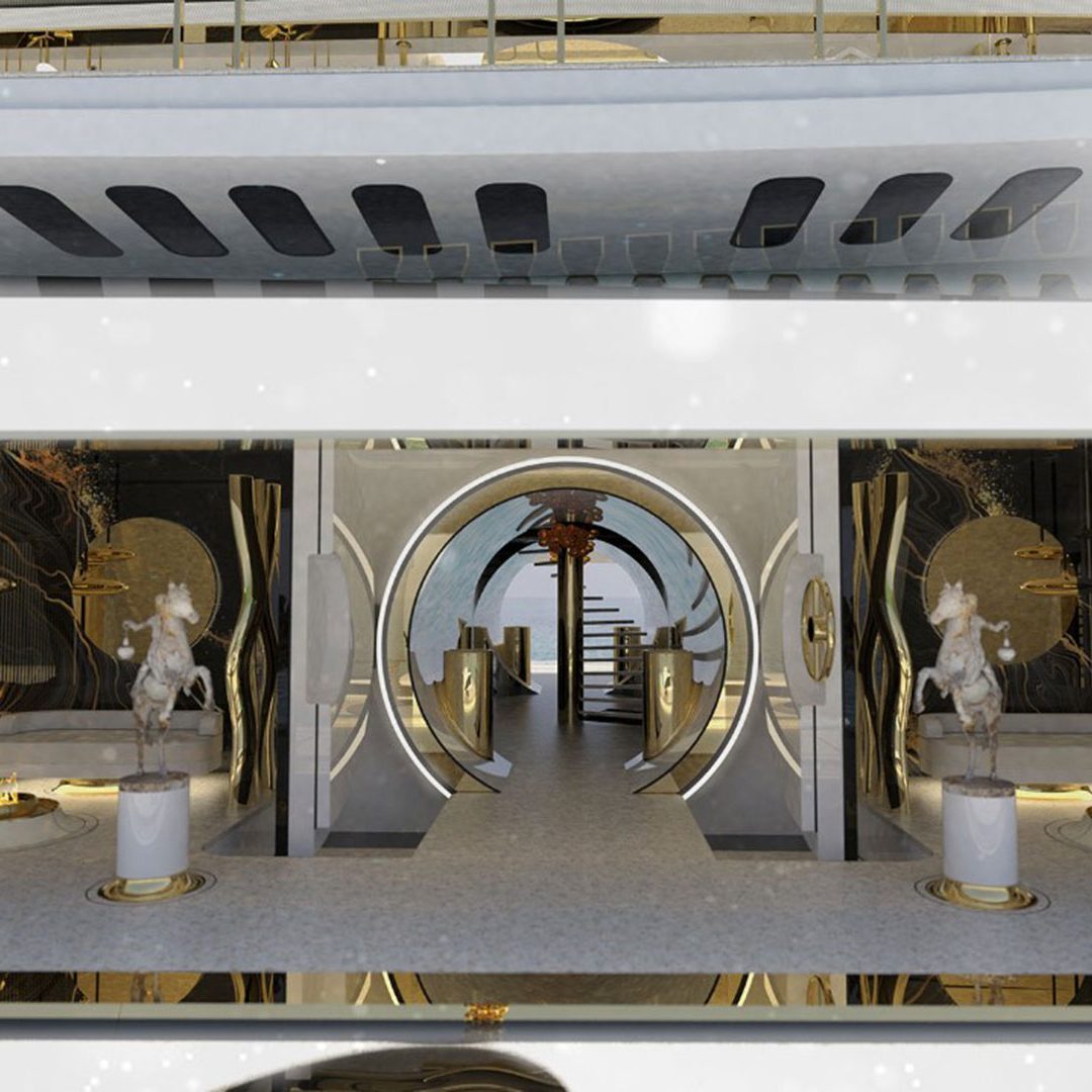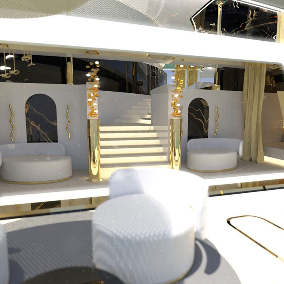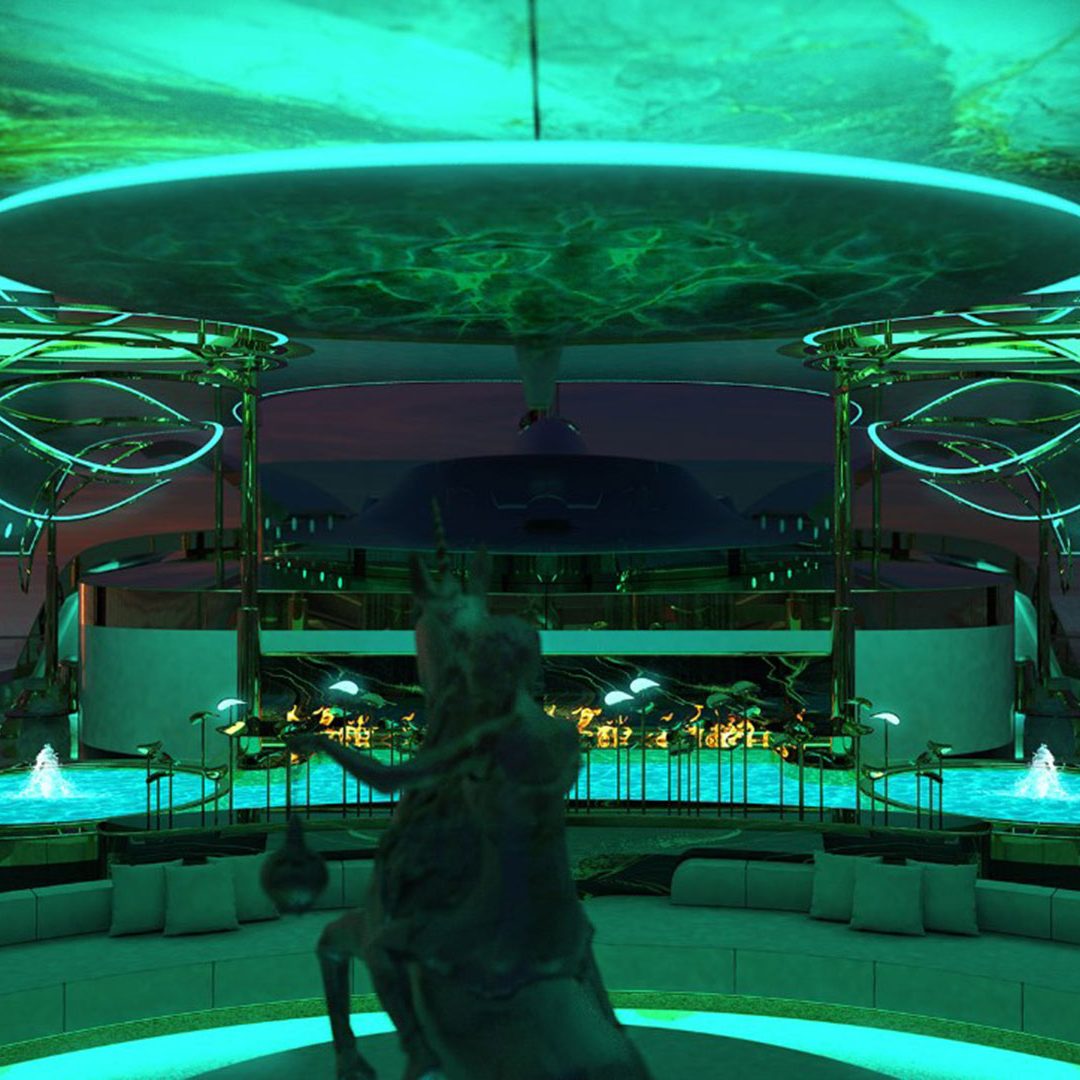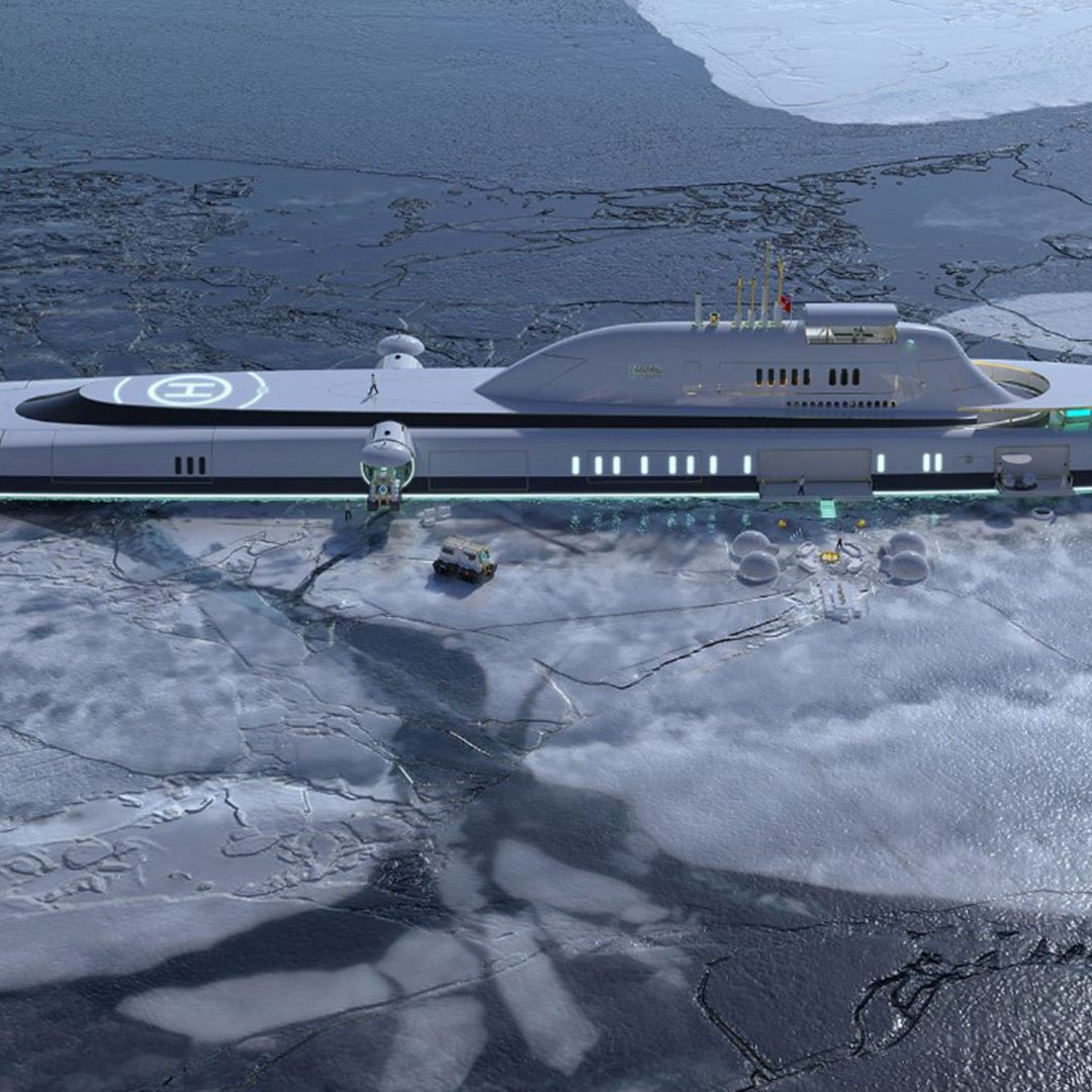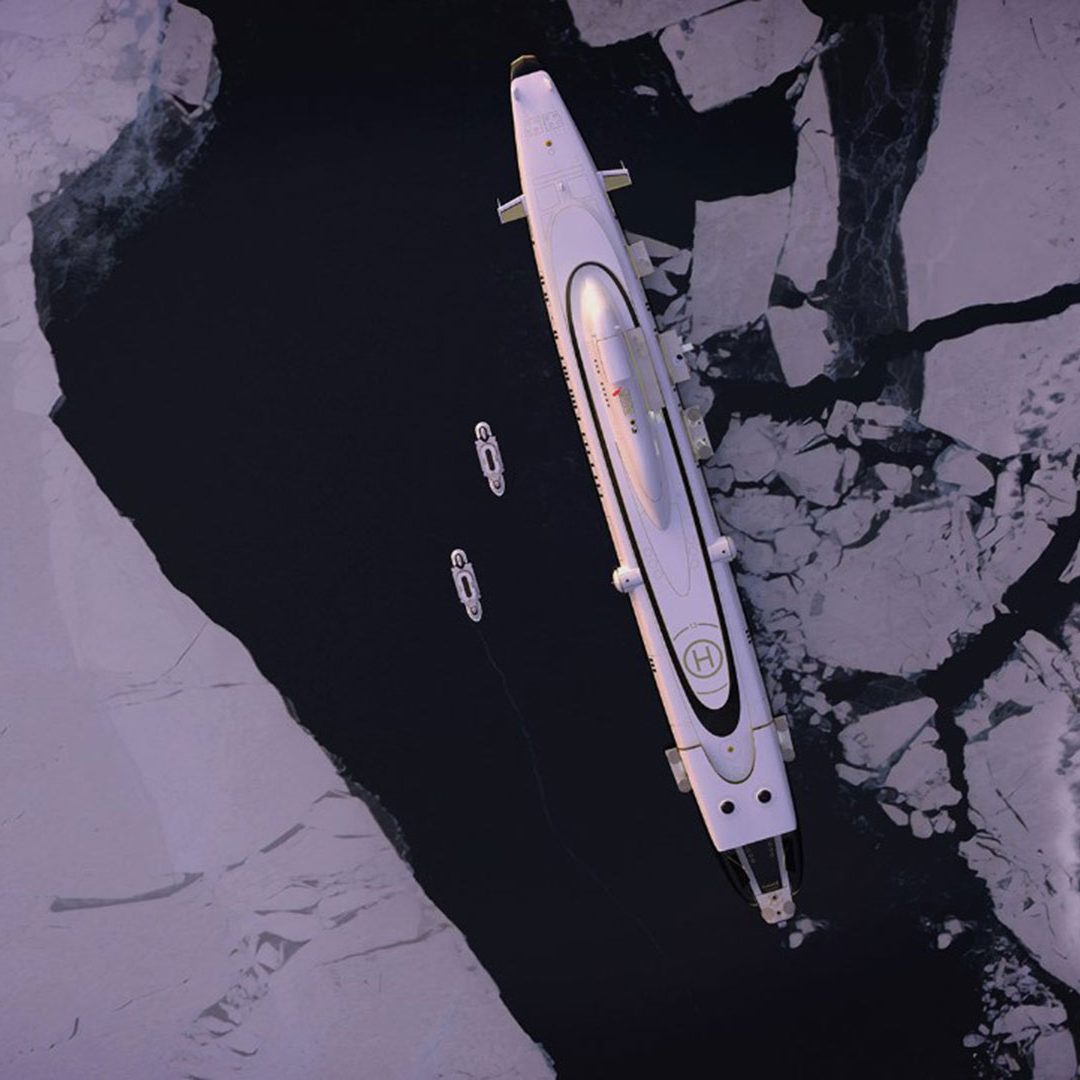 Tra le varie chicche troviamo infatti delle superfici panoramiche in vetro per poter godere di una vista unica in immersione (ma anche a filo d’acqua) e immancabili comfort come cinema e area gym. E a quanto elencato si aggiungono anche le piscine (che sono due e simmetriche nonché disposte sui lati dello scafo) e l’eliporto per l’atterraggio dell’elicottero.