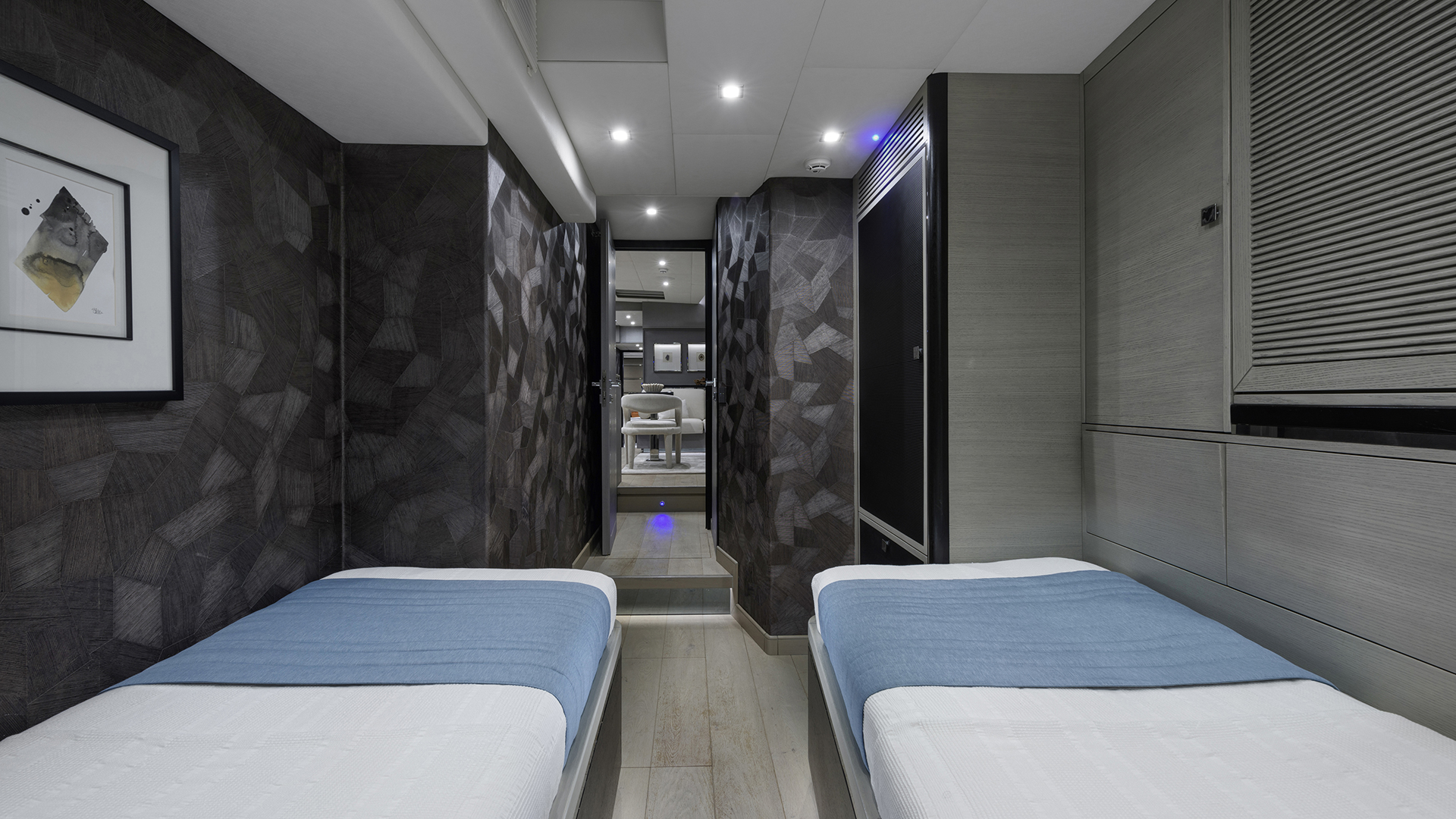 Famiglia e ospiti vengono accolti in una suite armatoriale a prua e in due cabine doppie/matrimoniali flessibili a poppa, oltre che in una cabina a centro barca e dotata di cuccette. Tutte e quattro le cabine sono dotate di bagno privato. Naturalmente, la cabina armatoriale è la più grande, con un letto king size posizionato sulla linea centrale e con spazi di stivaggio più grandi. A prua troviamo inoltre delle cuccette a castello per i due membri dell’equipaggio.