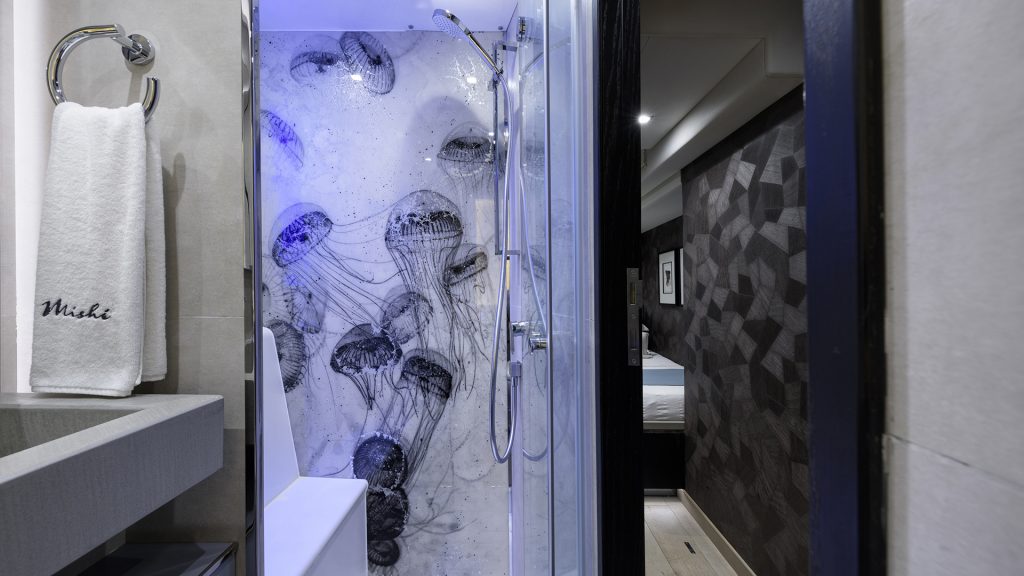 Un ampio corridoio porta ad un salone rialzato che offre posti a sedere per un gruppo di 12 o più ospiti. Qui trovano posto opere d’arte e due grandi televisori a schermo piatto, che possono essere nascosti da delle tendine. Si tratta di un’area inondata di luce naturale, grazie alle finestre sulla tuga e ai numerosi portelli soprastanti. A pochi gradini di distanza troviamo una cucina attrezzata, con frigorifero, congelatore ed elettrodomestici di alta qualità. Nella prima versione del Mishi 88, il salone è stato mantenuto aperto in modo che l’armatore possa preparare il cibo per la famiglia o per gli ospiti senza dover abbandonare la conversazione, ma chi lo desidera può richiuderlo. Questo spazio misura oltre 20 metri quadrati.