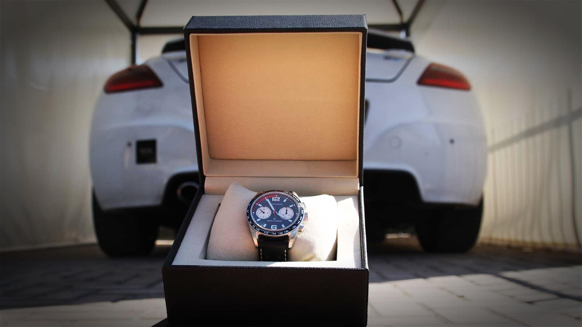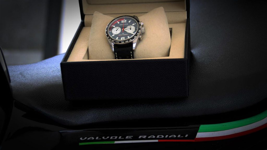 E non manca un ottimo packaging a coronare l’esperienza di acquisto del prodotto: il box è estremamente curato ed è nero con lettering e logo bianchi, nonché dotato di duplice apertura, ovvero dall’alto e dal davanti. Il tutto viene accompagnato da una busta da lettere nera sigillata pregevolmente in ceralacca e che contiene tesserino e certificato di proprietà che accompagnano l’orologio. All’interno dell’involucro troviamo due schede plastificate: una con i ringraziamenti del fondatore e i contatti dell’assistenza e l’altra con la scheda tecnica del cronografo. Nonché, ovviamente, il cofanetto dell’orologio, realizzato in pelle nera martellata e con apertura a scrigno al cui centro svetta il Gran Turismo su un fondo crema a contrasto con il nero del resto della confezione. Sotto al cronografo trova posto il panno in microfibra nero per pulire lo stesso.