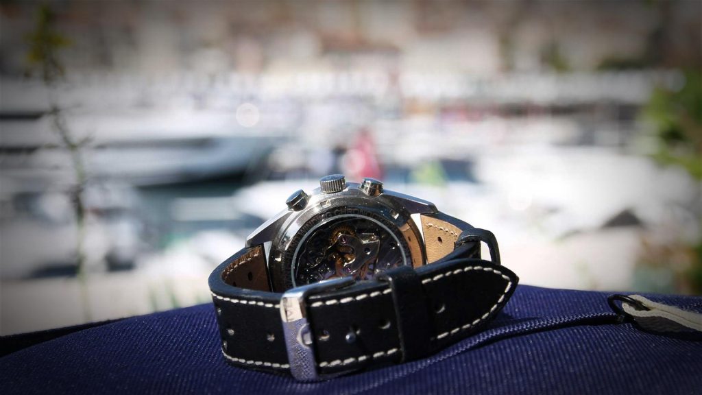 La corona centrale permette invece la regolazione dell’ora, nonché la carica manuale del movimento: meccanico Seagull ST1901 (derivato dallo Swiss Venus 175 e specificamente regolato dagli orologiai di Monturve) da 48 ore di riserva di carica e lasciato libero alla vista (con tutti i sui bellissimi cromatismi in alternanza) da un fondello in vetro minerale antiriflesso. Una soluzione adottata anche sul quadrante e pensata per portare con sé i segni del tempo allo scopo di raccontare il viaggio di ogni singolo proprietario, oltre che ispirata dai gruppi ottici delle vetture del passato.
