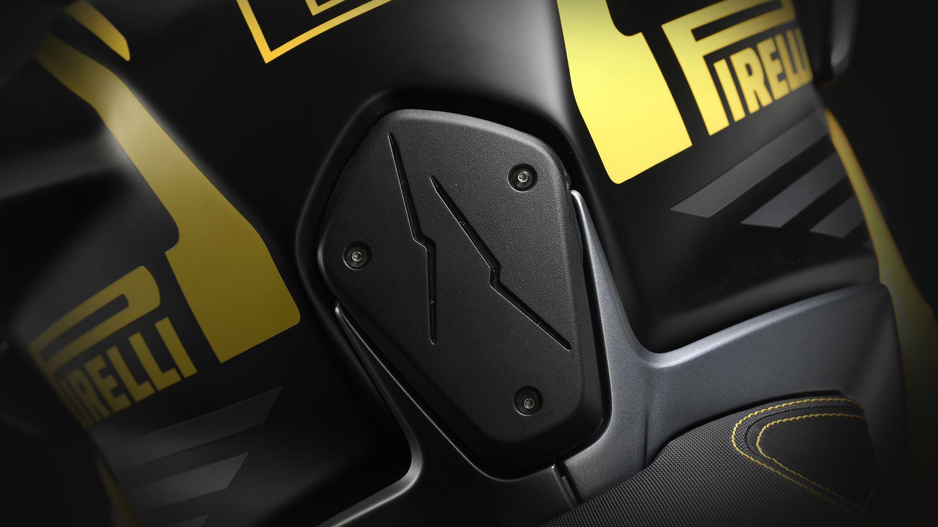 Doppia texture con impunture a contrasto e per il “flash” distintivo del logo Diablo (ricamato) impreziosiscono il codino firmato Pirelli Design e completano la caratterizzazione estetica della MV Agusta Dragster 800 RR Pirelli, che aggiunge a quanto elencato anche una finitura specifica dei terminali di scarico (ottenuta attraverso l’applicazione di una speciale vernice a base ceramica) e una grafica dedicata per i pneumatici opzionali Diablo Supercorsa SP.