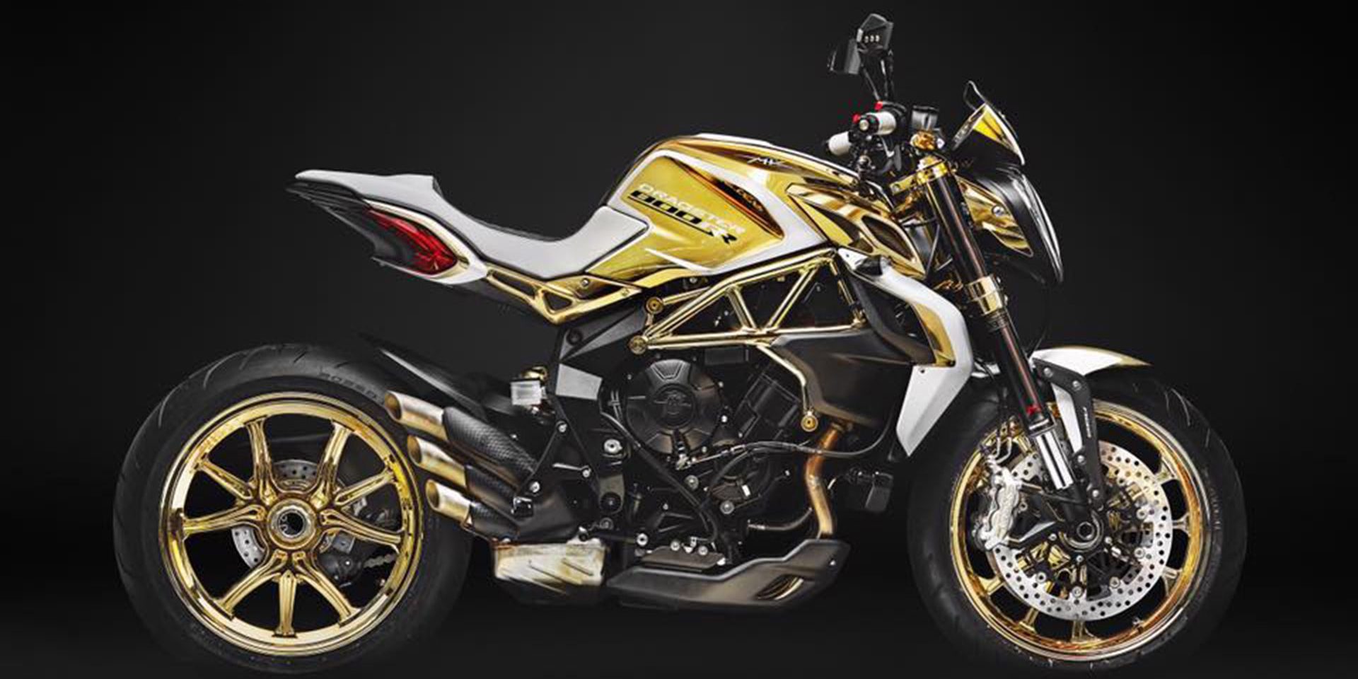 Connotata da un cromatismo in oro lucido “spezzato” unicamente da dettagli bianchi e neri, questa MV Agusta Dragster 800 RR one-off presenta inoltre alcuni elementi in fibra di carbonio volti a conferire ancor più esclusività a questa moto (come ad esempio la paratia anticalore posta dinnanzi all’impianto di scarico), nonché una sella bicromatica rivestita in Alcantara con impunture a vista e un inedito ammortizzatore di sterzo posto alle spalle dei semi-manubri regolabili.