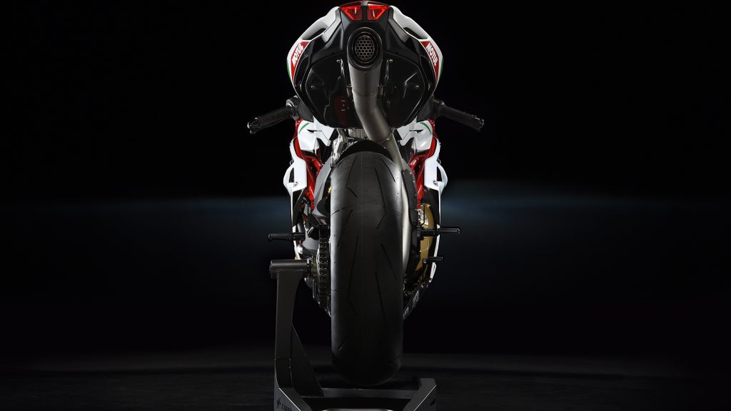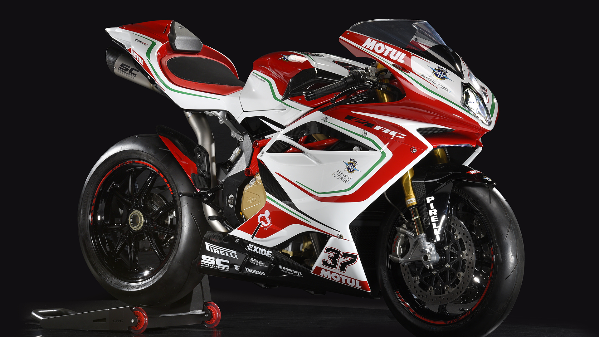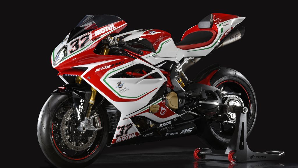 Immediatamente riconoscibile per via di una colorazione dedicata, la MV Agusta F4 RC M.Y. 2017 presenta una grafica con base bianca e rossa impreziosita dalla presenza dei loghi degli sponsor, oltre che dal “37” sulle tabelle porta numero che rende omaggio ai titoli mondiali costruttori conquistati da MV Agusta.