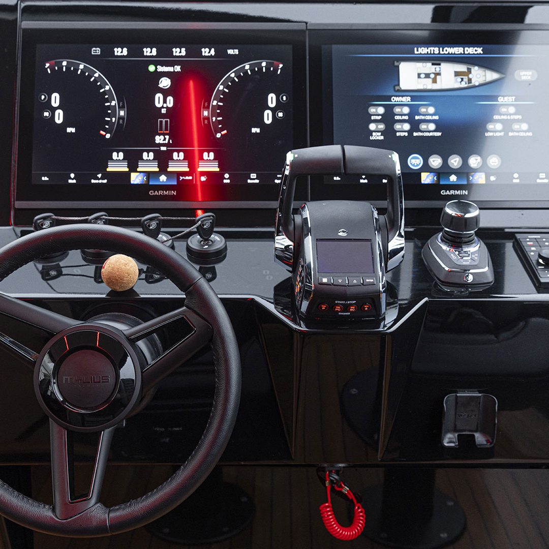 Cuore nevralgico dell’M47P è la consolle di comando con sedute ergonomiche Besenzoni (personalizzabili nei colori e nelle cuciture) e due display Garmin da 19’’ integrati con il sistema input / output Empirebus, attraverso i quali si monitorano tutti gli impianti, gli strumenti e le principali utenze. Oltre al timone e alla manetta motori dotata di display, è presente un joystick per le manovre di ormeggio. Dalla plancia di comando si gestiscono anche l’autopilota, i tergicristalli, l’ancora dotata di sistema telescopico a scomparsa sulla prua e l’infotainment – collegato alla rete Garmin – che prevede quattro diverse zone musica: cabina armatore, cabina ospiti, zona plancia e zona poppa.