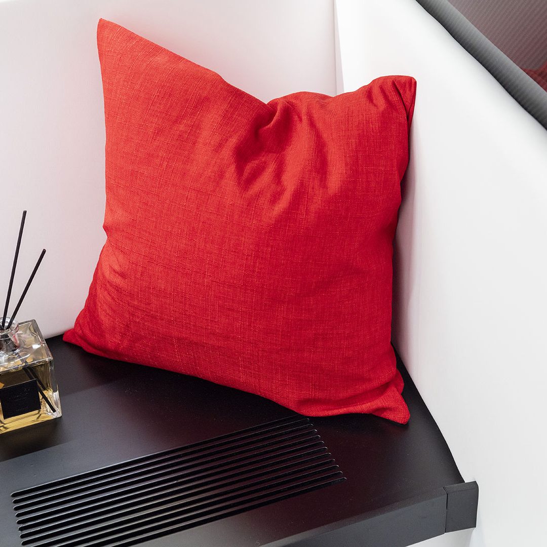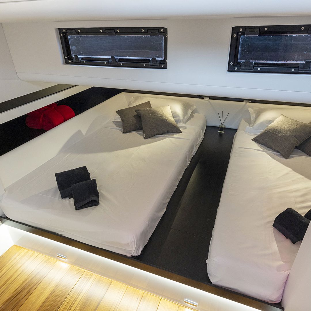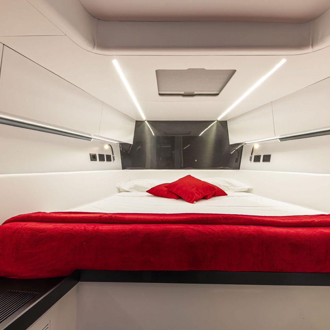 All’interno troviamo due cabine per 4 ospiti: la versione standard prevede a prua quella armatoriale, dotata di letto matrimoniale king size, bagno con doccia separata, armadi e spazi per lo stivaggio e a poppa – con accesso dal pozzetto – quella ospiti con due letti singoli e bagno privato, ma è possibile avere il layout con la padronale a poppa. Il cliente potrà scegliere tra un’ampia gamma di colori, materiali e finiture che comprende laminati di teak, rovere chiaro o naturale, laccati e carbon look e rivestimenti in eco pelle o varie texture. È comunque sempre possibile personalizzare la propria barca, partendo dal colore dello scafo, o scegliendo tra altri tessuti messi a disposizione dal cantiere, come Loro Piana o Maria Flora.