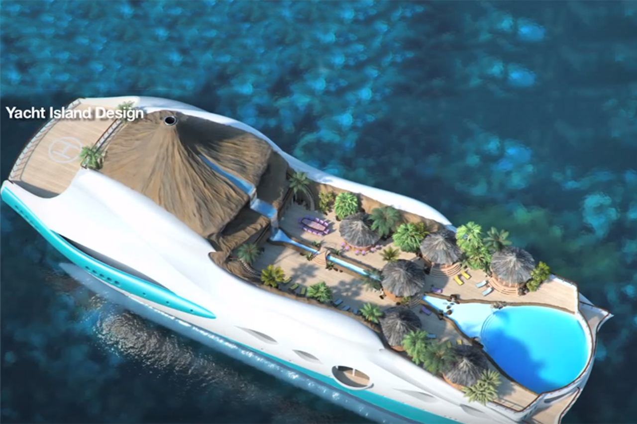 Un’azienda britannica immagina lo yacht del futuro come sempre più simile ad una vera e propria isola tropicale con palme, bungalow ed un vulcano artificiale