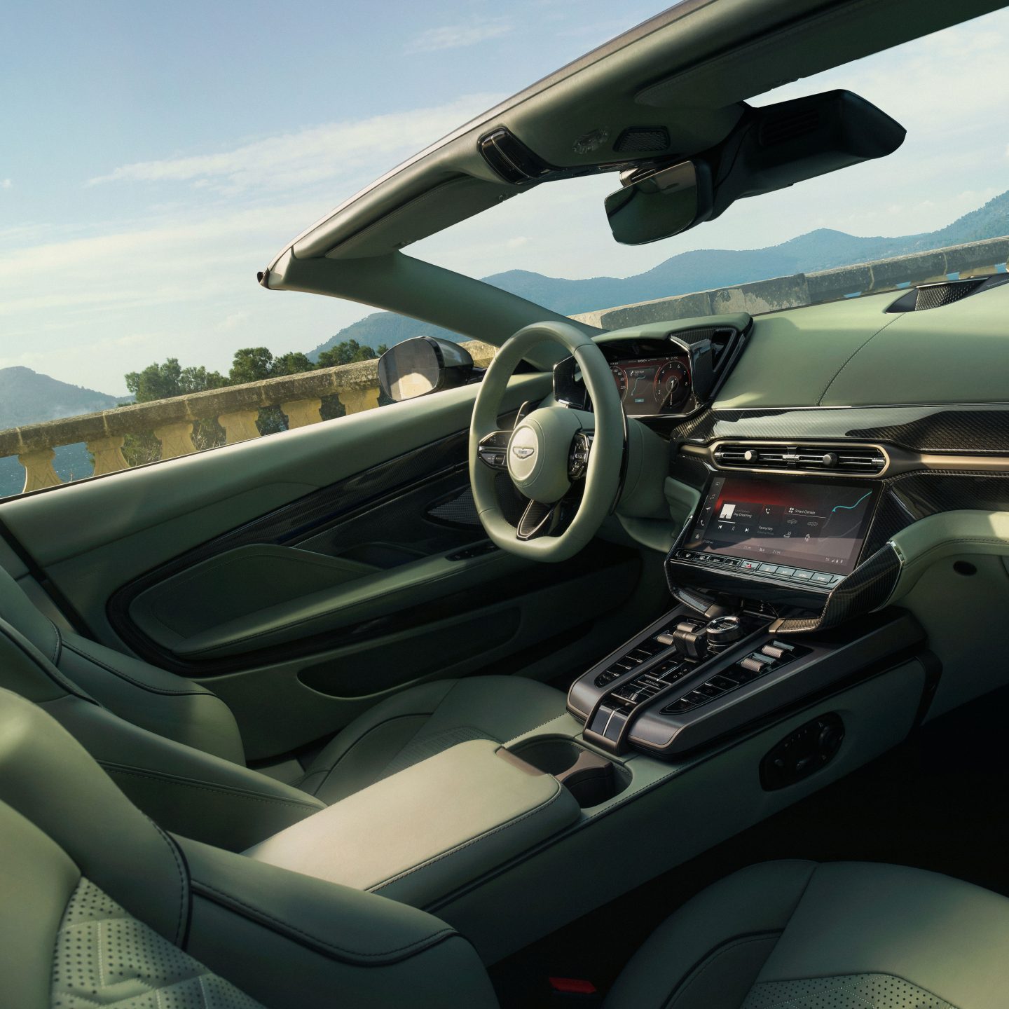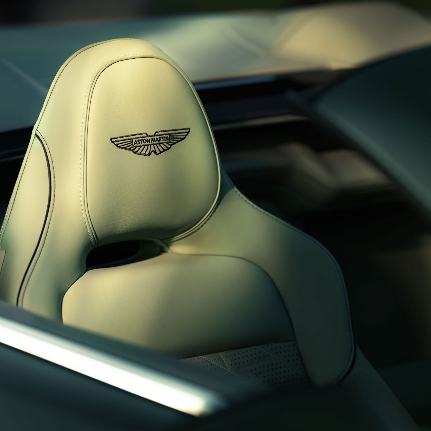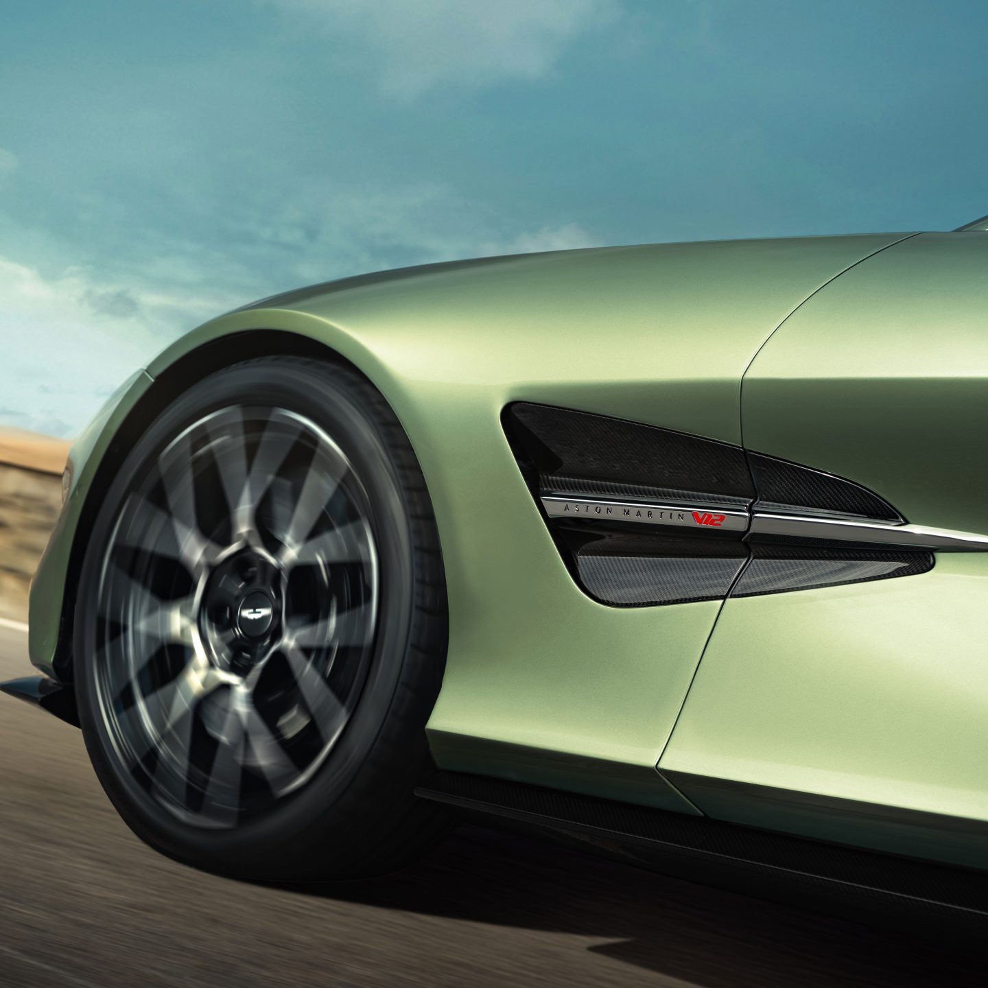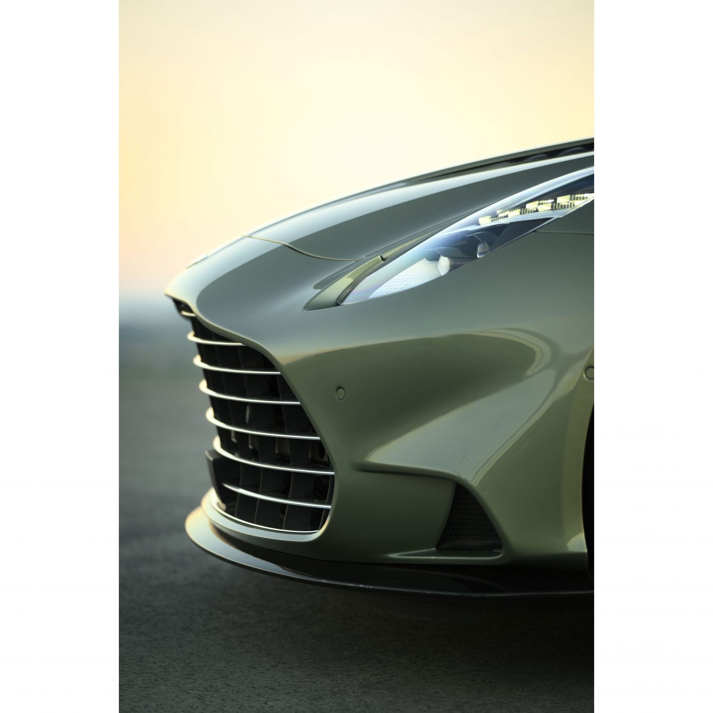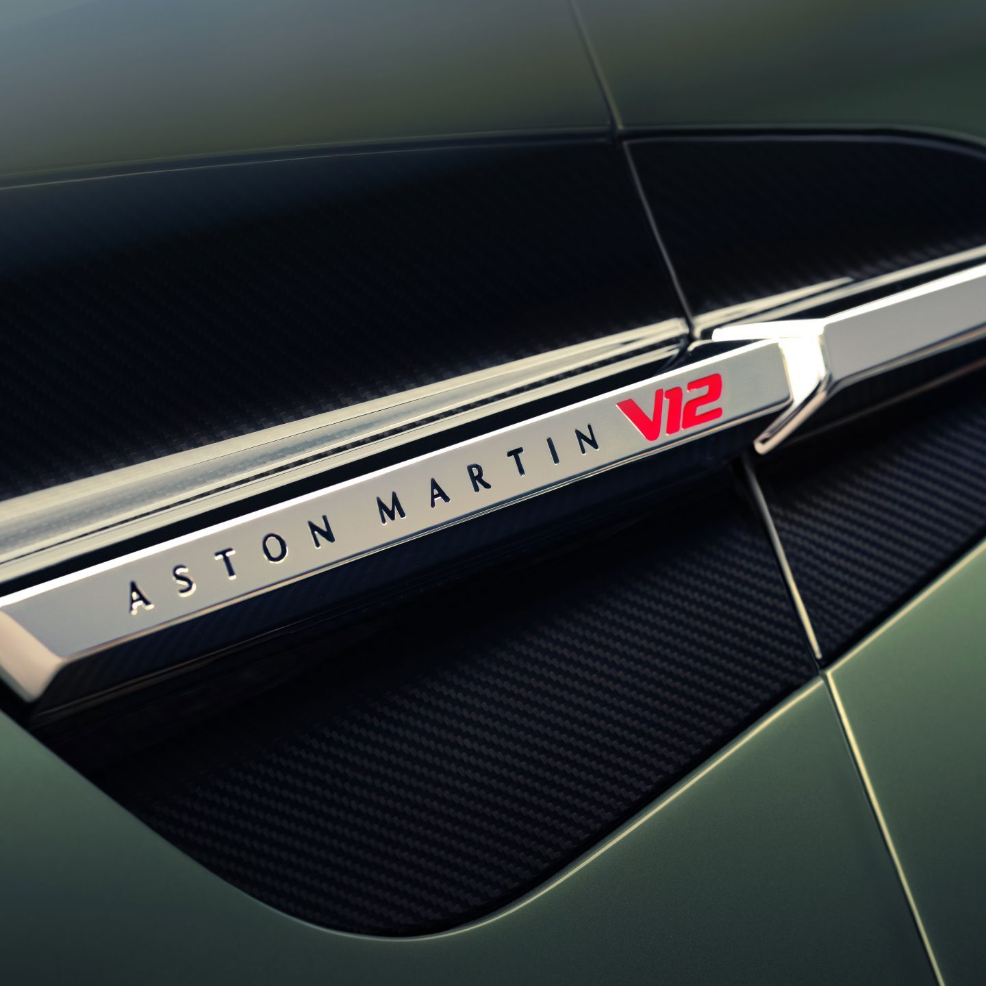 L’uso di elementi stilistici come la griglia anteriore ampliata del 13% rispetto ai modelli precedenti migliora il raffreddamento del motore, mentre le prese d’aria laterali favoriscono la dissipazione del calore dai freni. I fari Matrix LED con firma luminosa integrata e i dettagli come il logo Aston Martin e il motivo rosso “V12” arricchiscono il design. Gli specchietti retrovisori, più piccoli e senza cornice, riducono la resistenza aerodinamica e le maniglie delle portiere a filo, estensibili elettronicamente, mantengono le linee morbide del profilo laterale.