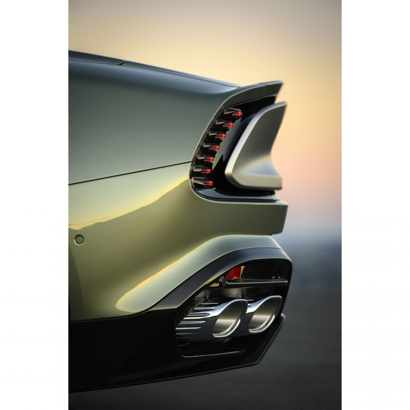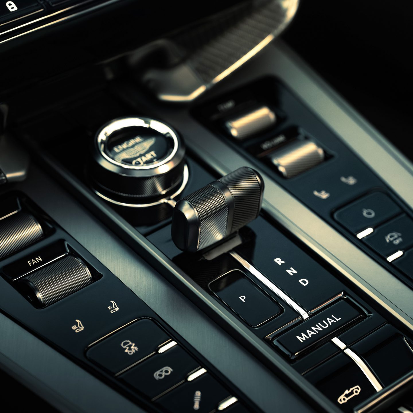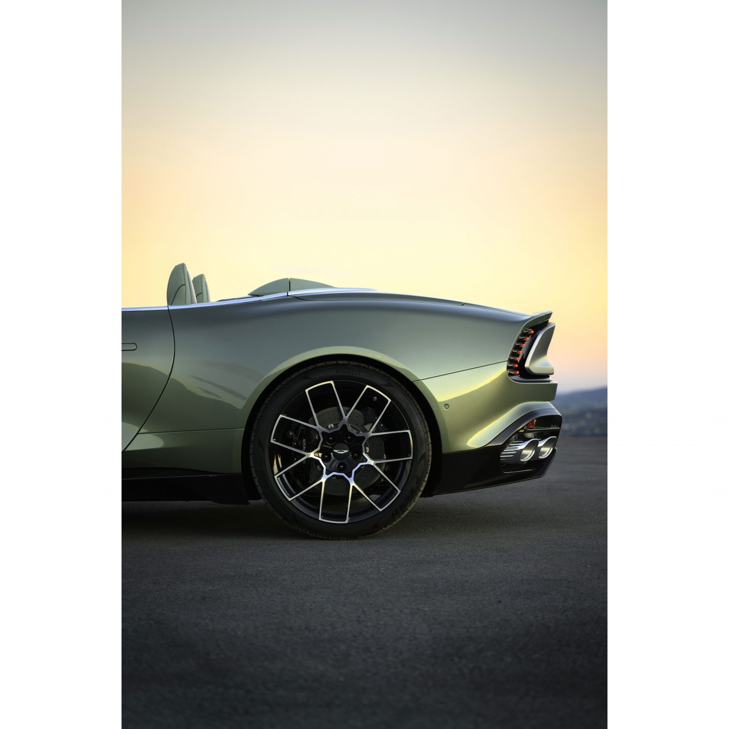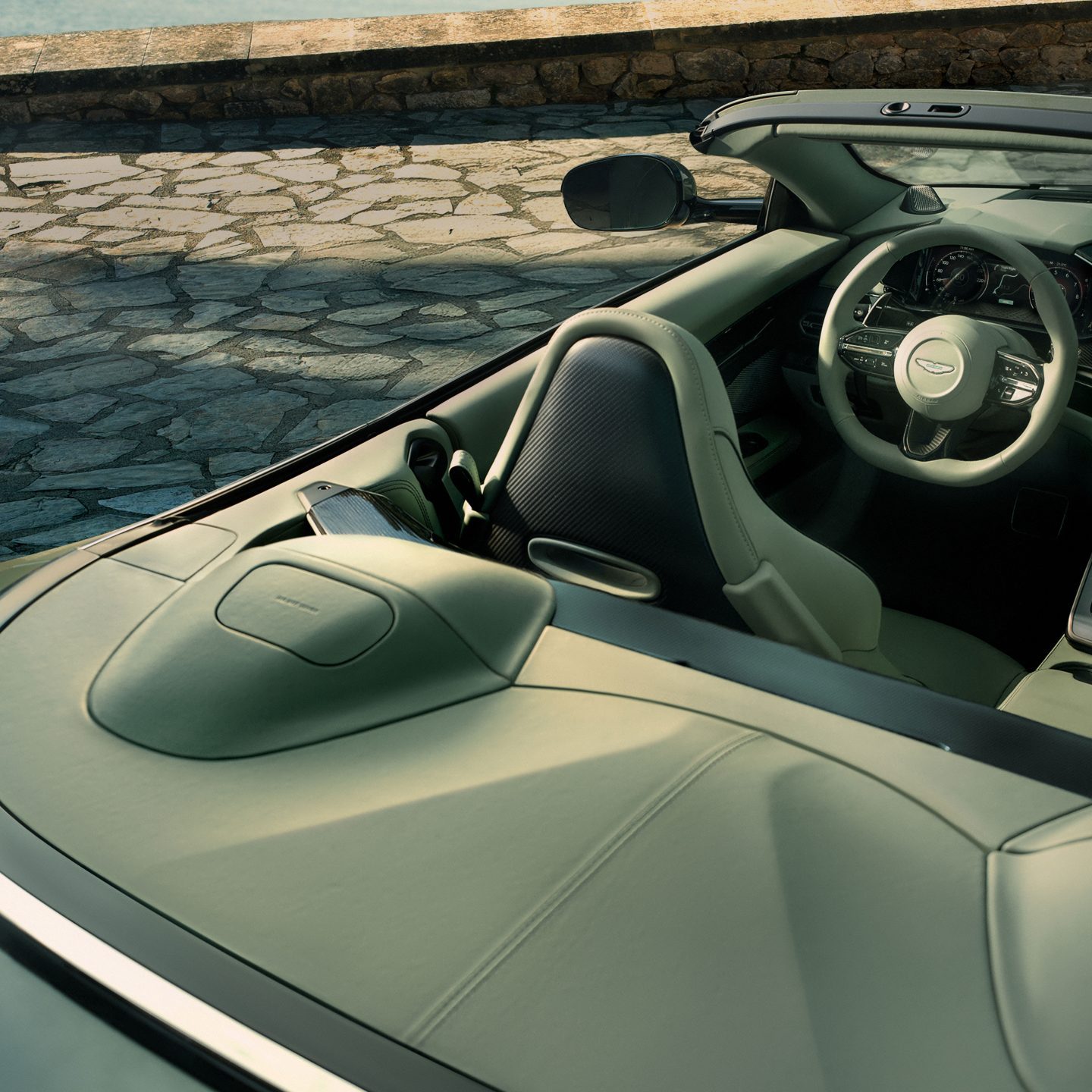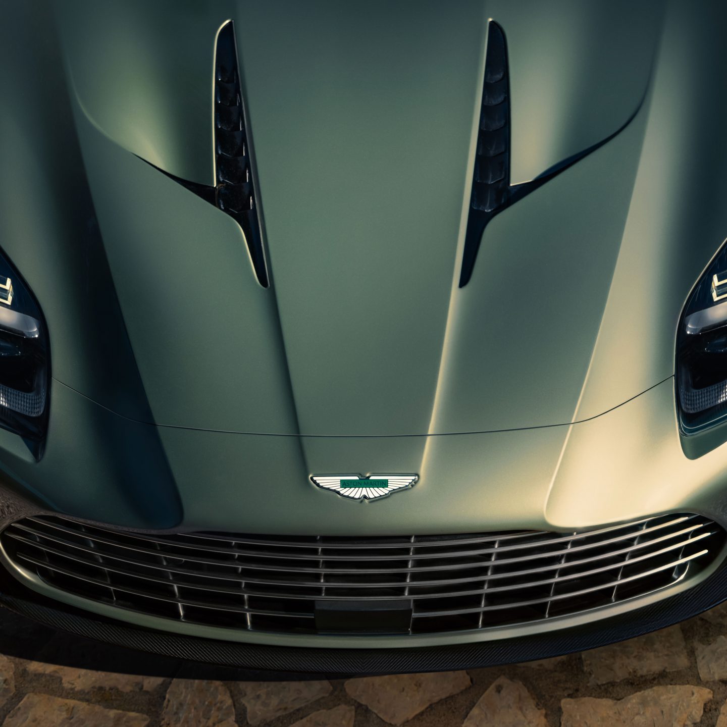 L’uso di elementi stilistici come la griglia anteriore ampliata del 13% rispetto ai modelli precedenti migliora il raffreddamento del motore, mentre le prese d’aria laterali favoriscono la dissipazione del calore dai freni. I fari Matrix LED con firma luminosa integrata e i dettagli come il logo Aston Martin e il motivo rosso “V12” arricchiscono il design. Gli specchietti retrovisori, più piccoli e senza cornice, riducono la resistenza aerodinamica e le maniglie delle portiere a filo, estensibili elettronicamente, mantengono le linee morbide del profilo laterale.
