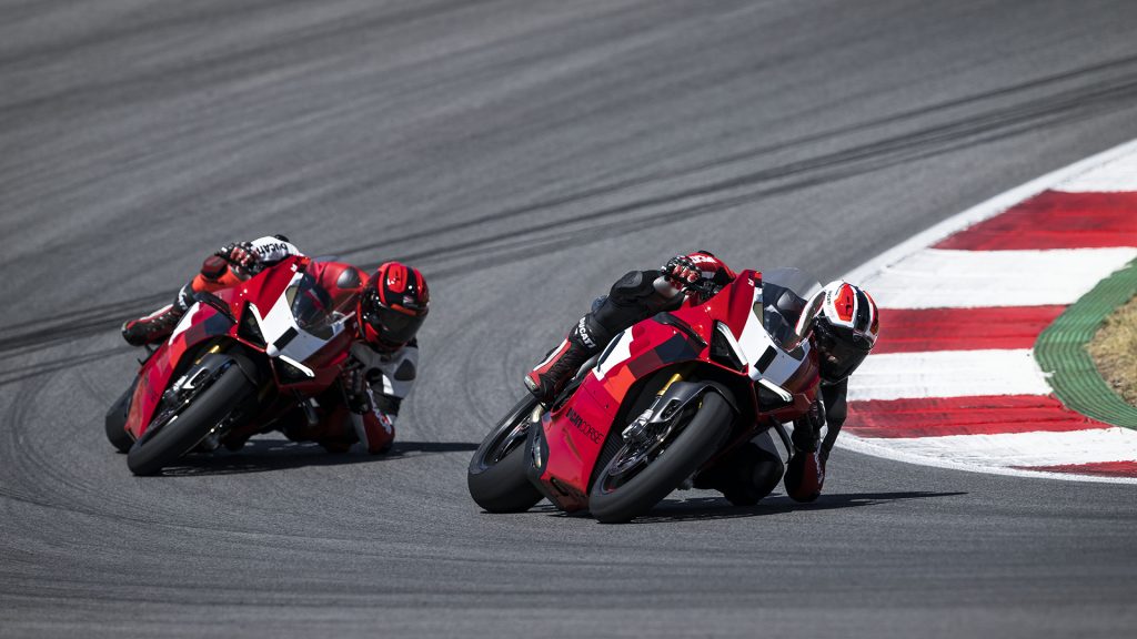 Il cuore della Panigale V4 R 2023 è il Desmosedici Stradale R da 998 cc, un motore in grado di raggiungere un regime di rotazione massima pari a 16.500 giri al minuto in sesta marcia (16.000 negli altri rapporti) ed erogare una potenza massima di 218 CV a 15.500 giri/minuto (in configurazione Euro-5). Il nuovo Desmosedici Stradale R fornisce prestazioni leggermente ridotte rispetto al predecessore per effetto della limitazione generata dall’impianto di scarico conforme alla severa omologazione Euro-5. Tutto il potenziale di questo motore, però, si esprime in pista montando lo scarico racing, che gli consente di raggiungere i 237 CV, tre in più rispetto alla precedente versione.