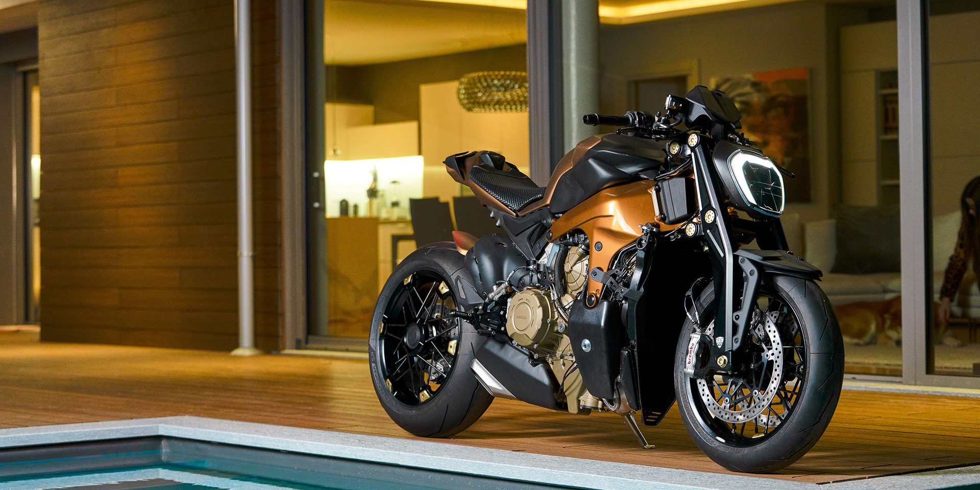 Tinta in bronzo texturizzata (con scaglie ramate) e deflettori di derivazione sportiva chiudono il cerchio della Officine GP Design Ducati V4 Penta insieme ad una sella in pelle intrecciata a mano da Foglizzo Leather, al kit serbatoio, al tappo della benzina e a leveraggi e pedane Rizoma. Il prezzo? Si parte da 100.000 euro, personalizzazioni escluse e verrà consegnata insieme a un cofanetto che ne racconterà storia ed esclusività.