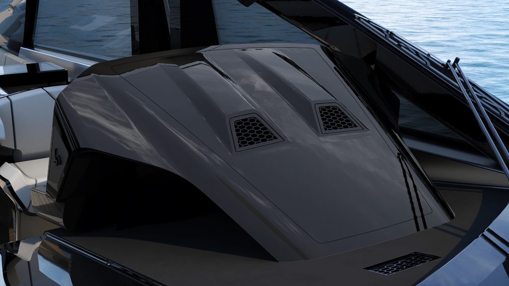 L’imbarcazione è frutto della collaborazione tra il Cantiere del Belpaese e Giuseppe Bagnardi dello studio BG Design Firm. La consolle di guida si ispira al mondo delle auto da competizione, con una struttura in fibra di carbonio che ricorda il sistema protettivo “halo” utilizzato dalle vetture di Formula 1 e da altre macchine da corsa. La stessa struttura dispone inoltre di un sistema di raffreddamento integrato ed indipendente per mantenere sempre l’elettronica della consolle a temperatura costante. Le prese d’aria sulla parte anteriore dello yacht e lo “snorkel” sull’hardtop ricordano il cofano e i condotti sul tetto delle auto più esclusive.