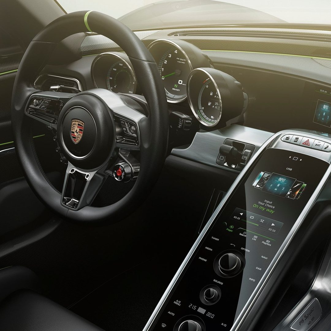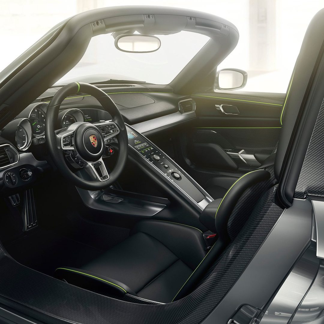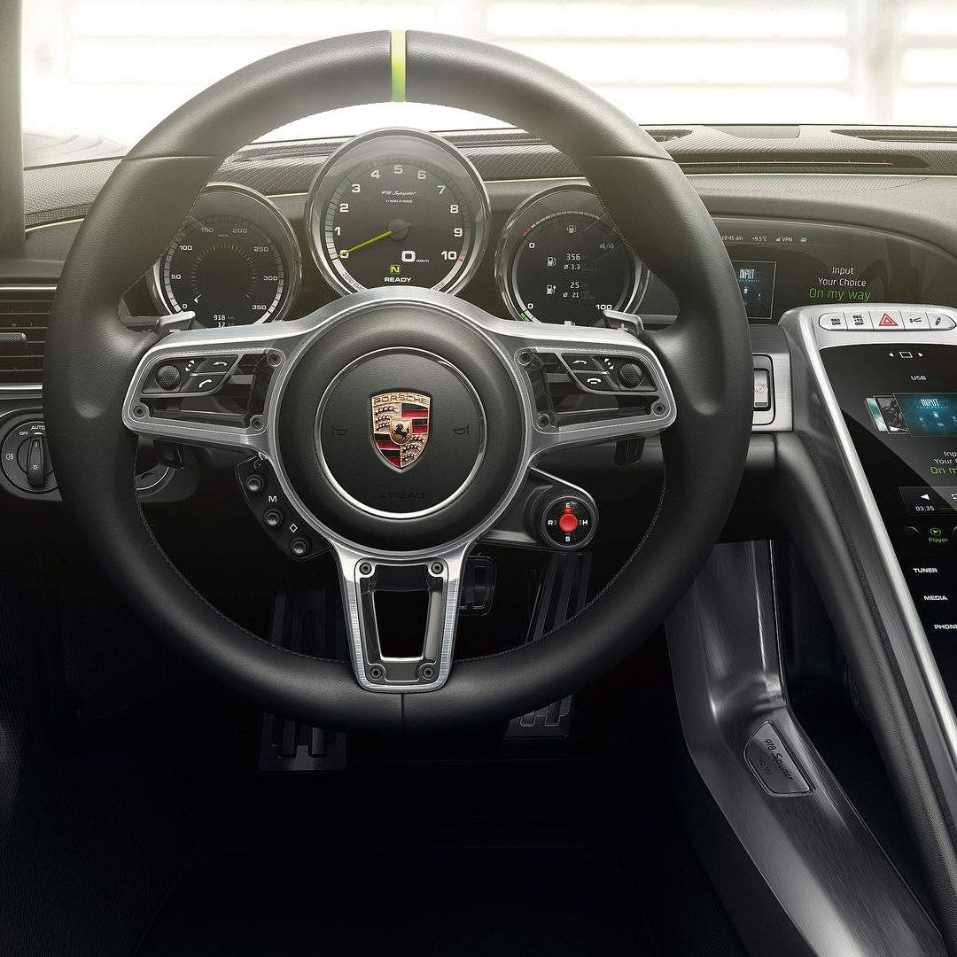Impossibile però parlare di una vettura di questo calibro senza considerare anche l’attenzione rivolta al comparto aerodinamico. Porsche Active Aerodynamic (PAA, per gli amanti degli acronimi). Dietro a questa definizione si nasconde tutto il core dell’efficienza aerodinamica della Porsche 918 Spyder, ovvero un insieme di elementi regolabili per restituire una risposta variabile in base alle condizioni di guida. Il sistema lavora su tre fasi, passando automaticamente dall’efficienza ottimale alla massima deportanza e interagendo con le modalità operative della trazione ibrida. In modalità “Race”, l’alettone posteriore retrattile si imposta su un angolo di incidenza elevato per generare elevata downforce sull’asse posteriore. Anche lo spoiler – collocato tra i due supporti dell’alettone sul bordo di uscita – si estende. Due alette regolabili si aprono nel sottoscocca davanti all’asse anteriore, indirizzando parte dell’aria nei canali del diffusore per generare effetto suolo e sviluppare quindi carico verticale davanti. In modalità “Sport” il sistema riduce leggermente l’angolo di attacco dell’alettone posteriore, consentendo una maggiore velocità massima. Lo spoiler rimane esteso, ma le alette aerodinamiche nel sottoscocca si chiudono, riducendo la resistenza aerodinamica e aumentando così la top speed. In modalità “E” invece, il sistema si concentra esclusivamente sulla riduzione della resistenza aerodinamica: l’alettone posteriore e lo spoiler sono retratti e i flap sottoscocca sono chiusi. Le prese d’aria regolabili sotto i fari principali completano l’aerodinamica attiva. A vettura ferma e in modalità “Race” o “Sport”, le prese d’aria vengono aperte per consentire il massimo raffreddamento. In modalità “E-Power” e “Hybrid”, le prese d’aria si chiudono non appena la vettura si mette in marcia per ridurre al minimo la resistenza aerodinamica e non vengono riaperte fino a quando la vettura non raggiunge una velocità di circa 130 km/h o quando le esigenze di raffreddamento sono maggiori. Compresi a questo punto messa a punto, powertrain e dotazione aerodinamica (che ne ha ovviamente influenzato il design esterno), è il momento di fare un salto a bordo. Come facile immaginare, è il guidatore ad essere messo al centro dell’esperienza in abitacolo, che viene quindi suddiviso in due sezioni principali: la prima comprende i comandi importanti per la guida e sono ovviamente raggruppati intorno al volante e combinati alle informazioni dedicate al conducente, che vengono mostrate sulla strumentazione a tre indicatori tondi. La seconda comprende il blocco infotainment alloggiato nella consolle centrale rialzata, originariamente introdotta sulla Carrera GT. Sistemi come il climatizzatore, la regolazione degli spoiler, l’illuminazione e il Porsche Communication Management (PCM), insieme all’impianto audio Burmester High-End, possono essere gestiti tramite le funzioni di controllo multi-touch presenti sul display Black Panel. E come il nome Spyder lascia immediatamente intuire, anche l’emozione di avere il vento tra i capelli è stata messa tra gli elementi centrali a cui riservare attenzione nell’esperienza di guida di questa vettura. E per goderne appieno è sufficiente rimuovere i due pannelli in plastica rinforzata con fibra di carbonio (CFRP) che costituiscono il tetto per godere dell’emozione en plein air. Questi, possono essere riposti nel vano bagagli da 100 litri situato nella parte anteriore dell’auto.