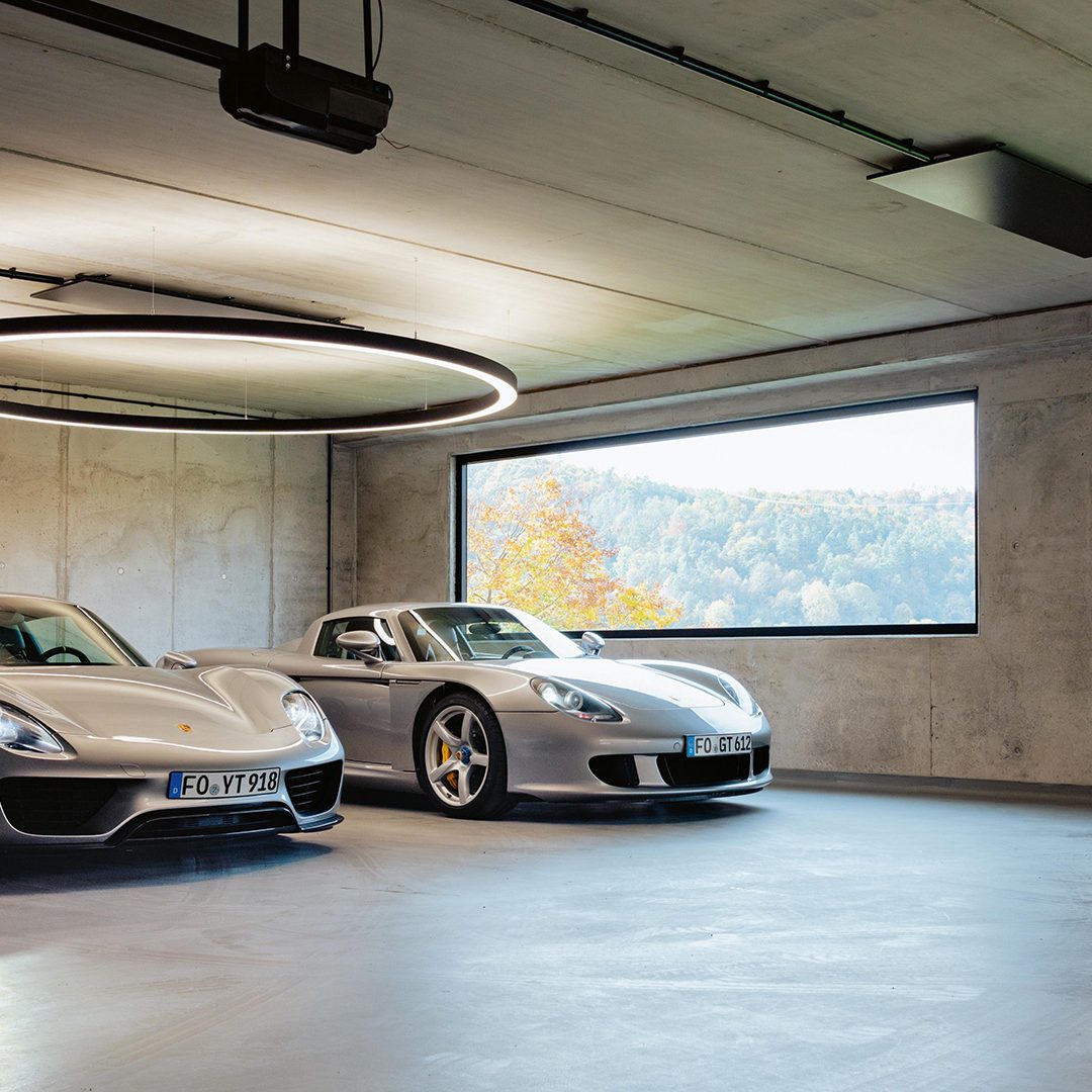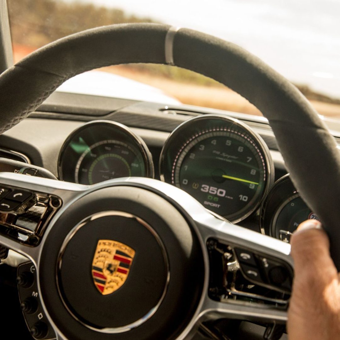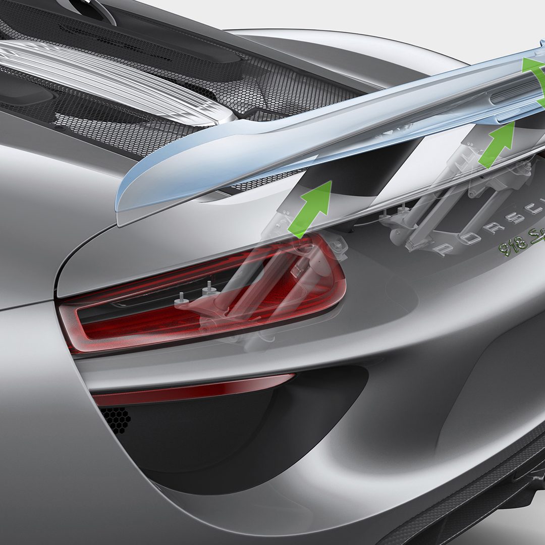 Impossibile però parlare di una vettura di questo calibro senza considerare anche l’attenzione rivolta al comparto aerodinamico. Porsche Active Aerodynamic (PAA, per gli amanti degli acronimi). Dietro a questa definizione si nasconde tutto il core dell’efficienza aerodinamica della Porsche 918 Spyder, ovvero un insieme di elementi regolabili per restituire una risposta variabile in base alle condizioni di guida. Il sistema lavora su tre fasi, passando automaticamente dall’efficienza ottimale alla massima deportanza e interagendo con le modalità operative della trazione ibrida. In modalità “Race”, l’alettone posteriore retrattile si imposta su un angolo di incidenza elevato per generare elevata downforce sull’asse posteriore. Anche lo spoiler – collocato tra i due supporti dell’alettone sul bordo di uscita – si estende. Due alette regolabili si aprono nel sottoscocca davanti all’asse anteriore, indirizzando parte dell’aria nei canali del diffusore per generare effetto suolo e sviluppare quindi carico verticale davanti. In modalità “Sport” il sistema riduce leggermente l’angolo di attacco dell’alettone posteriore, consentendo una maggiore velocità massima. Lo spoiler rimane esteso, ma le alette aerodinamiche nel sottoscocca si chiudono, riducendo la resistenza aerodinamica e aumentando così la top speed. In modalità “E” invece, il sistema si concentra esclusivamente sulla riduzione della resistenza aerodinamica: l’alettone posteriore e lo spoiler sono retratti e i flap sottoscocca sono chiusi. Le prese d’aria regolabili sotto i fari principali completano l’aerodinamica attiva. A vettura ferma e in modalità “Race” o “Sport”, le prese d’aria vengono aperte per consentire il massimo raffreddamento. In modalità “E-Power” e “Hybrid”, le prese d’aria si chiudono non appena la vettura si mette in marcia per ridurre al minimo la resistenza aerodinamica e non vengono riaperte fino a quando la vettura non raggiunge una velocità di circa 130 km/h o quando le esigenze di raffreddamento sono maggiori. Compresi a questo punto messa a punto, powertrain e dotazione aerodinamica (che ne ha ovviamente influenzato il design esterno), è il momento di fare un salto a bordo. Come facile immaginare, è il guidatore ad essere messo al centro dell’esperienza in abitacolo, che viene quindi suddiviso in due sezioni principali: la prima comprende i comandi importanti per la guida e sono ovviamente raggruppati intorno al volante e combinati alle informazioni dedicate al conducente, che vengono mostrate sulla strumentazione a tre indicatori tondi. La seconda comprende il blocco infotainment alloggiato nella consolle centrale rialzata, originariamente introdotta sulla Carrera GT. Sistemi come il climatizzatore, la regolazione degli spoiler, l’illuminazione e il Porsche Communication Management (PCM), insieme all’impianto audio Burmester High-End, possono essere gestiti tramite le funzioni di controllo multi-touch presenti sul display Black Panel. E come il nome Spyder lascia immediatamente intuire, anche l’emozione di avere il vento tra i capelli è stata messa tra gli elementi centrali a cui riservare attenzione nell’esperienza di guida di questa vettura. E per goderne appieno è sufficiente rimuovere i due pannelli in plastica rinforzata con fibra di carbonio (CFRP) che costituiscono il tetto per godere dell’emozione en plein air. Questi, possono essere riposti nel vano bagagli da 100 litri situato nella parte anteriore dell’auto.