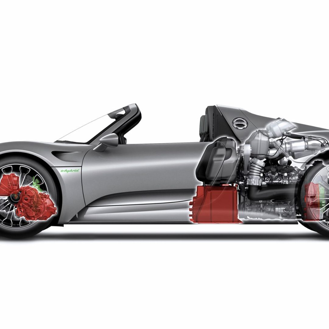 Ovviamente il protagonista assoluto, anche sulla Porsche 918 Spyder, rimane l’unità termica, costituita da un 8 cilindri a V da 4.6 litri da solo capace di 608 CV di potenza (che trova la sua base concettuale in quello impiegato sulla RS Spyder che fu impegnata nel Campionato Endurance) e capace di un mostruoso regime di rotazione massimo di 9.150 giri/min, nonché di 132 CV/litro (26 CV/litro in più rispetto alla Carrera GT), rendendolo all’epoca il motore Porsche aspirato con la potenza specifica più elevata di sempre. E come sappiamo tutti, anche la sonorità allo scarico concorre nell’esperienza di guida. Ed evidentemente dovevano saperlo molto bene anche a Weissach, dal momento che il costruttore tedesco installò qui i cosiddetti “top pipes”, ovvero dei terminali di scarico che terminano direttamente sopra il motore, nella parte superiore della parte posteriore, proprio per restituire ancora maggior coinvolgimento nella guida a tetto aperto (oltre che per veicolare i flussi d’aria calda direttamente verso il profilo alare). Il motore termico è accoppiato al modulo ibrido, poiché la vettura è progettata come un ibrido parallelo. Il modulo ibrido comprende essenzialmente un motore elettrico da 115 kW e un disaccoppiatore che funge da collegamento con il motore a combustione. Grazie alla sua configurazione ibrida parallela, la 918 Spyder può essere azionata all’asse posteriore sia individualmente dal motore a combustione o da quello elettrico, sia tramite entrambi i motori contemporaneamente. Come tipico delle supersportive Porsche, il gruppo propulsore della 918 Spyder è posizionato davanti all’asse posteriore e non ha un collegamento meccanico diretto con l’asse anteriore. Un cambio a doppia frizione PDK a sette rapporti gestisce invece la trasmissione della potenza sull’asse posteriore. Inoltre è presente un altro motore elettrico indipendente che genera circa 95 kW di potenza sull’asse anteriore. Questo aziona le ruote con un rapporto di trasmissione fisso. Un disaccoppiatore disaccoppia il motore elettrico ad alte velocità per evitare che vada fuori giri e la coppia motrice è controllata in modo indipendente per ciascun asse. L’energia per i motori elettrici viene accumulata da una batteria agli ioni di litio raffreddata a liquido, composta da 312 celle singole con una capacità di circa 7 kilowattora. La batteria è progettata per restituire elevatissime prestazioni sia in termini di ricarica che di potenza, consentendole di soddisfare i requisiti prestazionali del motore elettrico. La capacità di potenza e la durata della batteria agli ioni di litio dipendono da diversi fattori, tra cui le condizioni termiche. Per questo motivo la stessa è raffreddata a liquido tramite un circuito di raffreddamento dedicato. Per la 918 Spyder, Porsche sviluppò un inedito sistema con un’interfaccia di ricarica plug-in e un potenziale di recupero migliorato per la ricarica della batteria. Ad esempio, con la rete elettrica tedesca a 230 Volt, la batteria di trazione può essere ricaricata in 4 ore collegando il caricabatterie in dotazione a una presa di corrente con fusibile da 10 ampere. La stazione di ricarica rapida veniva proposta in via opzionale e consentiva la ricarica completa in poco meno di 25 minuti. Il tutto per dire che la 918 Spyder metteva sul piatto la bellezza di un complessivo di 887 CV di potenza e 1.280 Nm di coppia, il tutto per uno 0-100 km/h in 2.8″ e uno 0-200 km/h in 7.7″ senza il pacchetto Weissach.