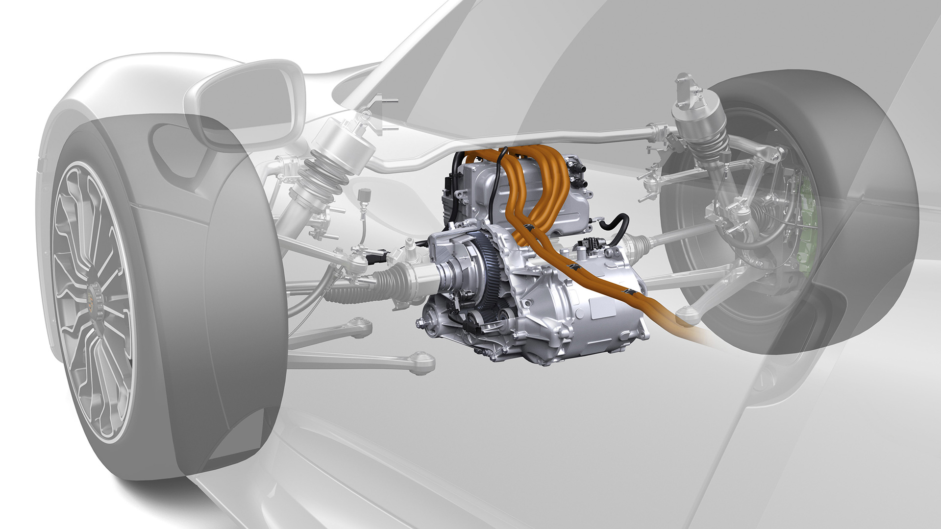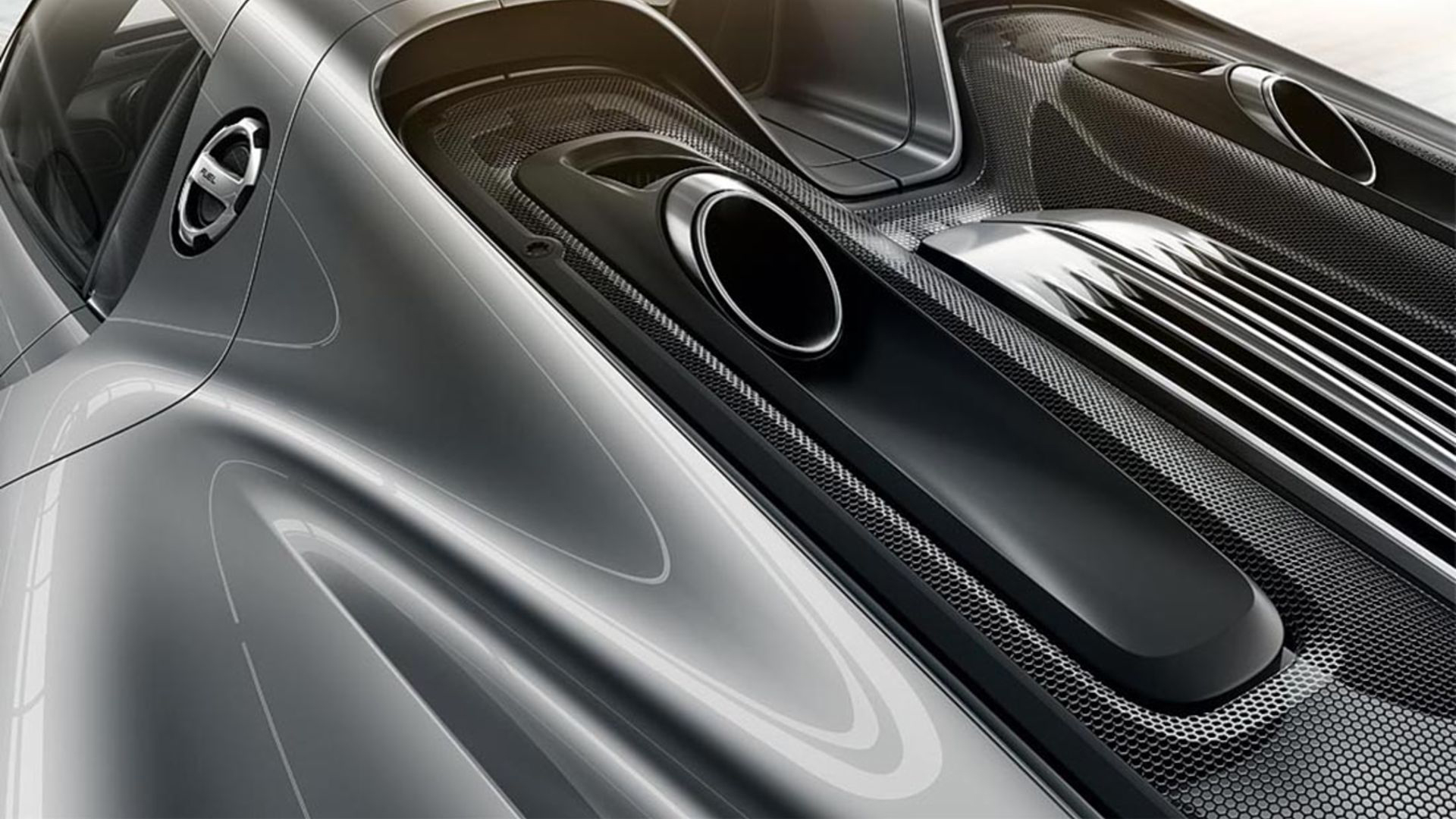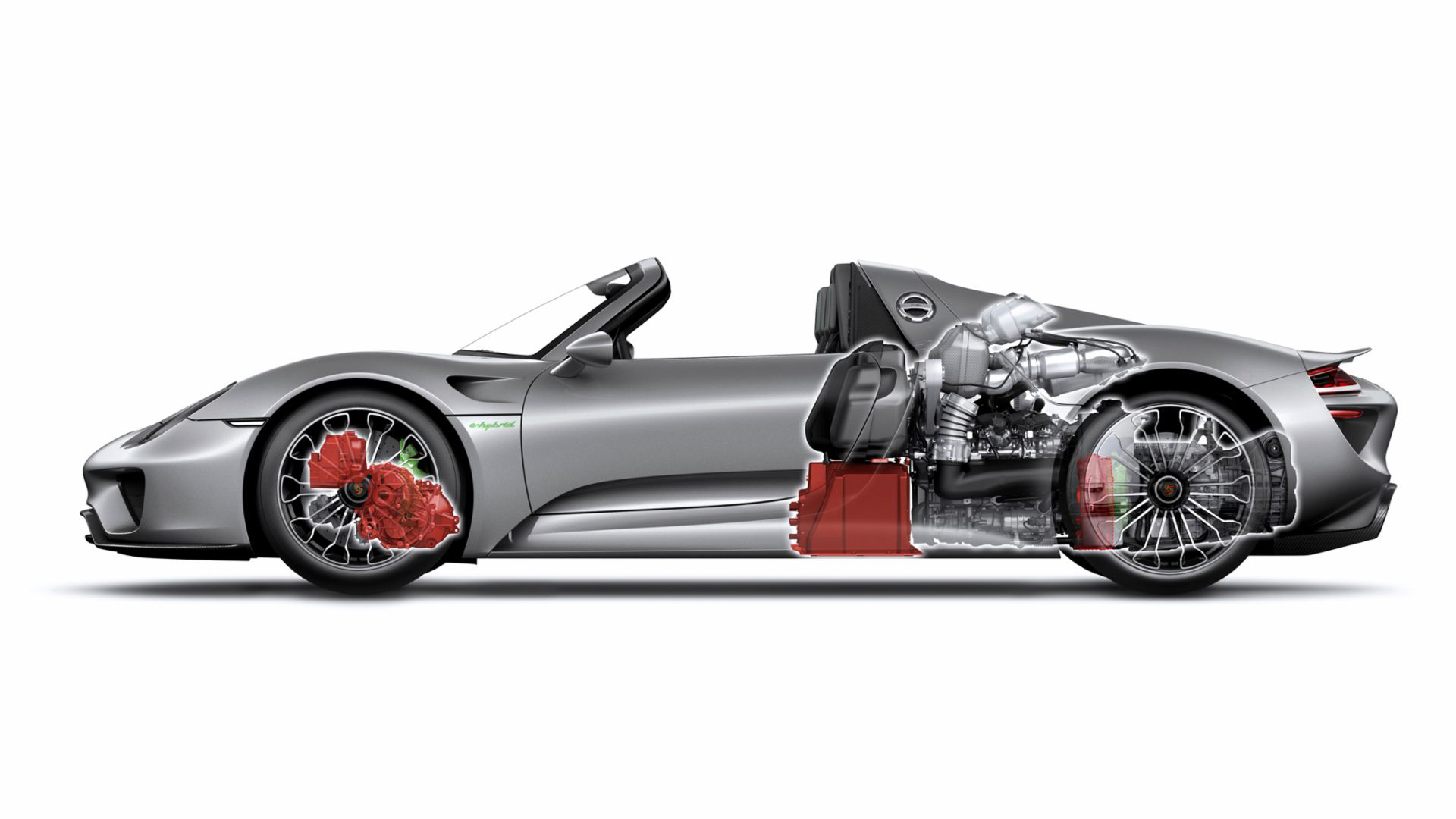 Ovviamente il protagonista assoluto, anche sulla Porsche 918 Spyder, rimane l’unità termica, costituita da un 8 cilindri a V da 4.6 litri da solo capace di 608 CV di potenza (che trova la sua base concettuale in quello impiegato sulla RS Spyder che fu impegnata nel Campionato Endurance) e capace di un mostruoso regime di rotazione massimo di 9.150 giri/min, nonché di 132 CV/litro (26 CV/litro in più rispetto alla Carrera GT), rendendolo all’epoca il motore Porsche aspirato con la potenza specifica più elevata di sempre. E come sappiamo tutti, anche la sonorità allo scarico concorre nell’esperienza di guida. Ed evidentemente dovevano saperlo molto bene anche a Weissach, dal momento che il costruttore tedesco installò qui i cosiddetti “top pipes”, ovvero dei terminali di scarico che terminano direttamente sopra il motore, nella parte superiore della parte posteriore, proprio per restituire ancora maggior coinvolgimento nella guida a tetto aperto (oltre che per veicolare i flussi d’aria calda direttamente verso il profilo alare). Il motore termico è accoppiato al modulo ibrido, poiché la vettura è progettata come un ibrido parallelo. Il modulo ibrido comprende essenzialmente un motore elettrico da 115 kW e un disaccoppiatore che funge da collegamento con il motore a combustione. Grazie alla sua configurazione ibrida parallela, la 918 Spyder può essere azionata all’asse posteriore sia individualmente dal motore a combustione o da quello elettrico, sia tramite entrambi i motori contemporaneamente. Come tipico delle supersportive Porsche, il gruppo propulsore della 918 Spyder è posizionato davanti all’asse posteriore e non ha un collegamento meccanico diretto con l’asse anteriore. Un cambio a doppia frizione PDK a sette rapporti gestisce invece la trasmissione della potenza sull’asse posteriore. Inoltre è presente un altro motore elettrico indipendente che genera circa 95 kW di potenza sull’asse anteriore. Questo aziona le ruote con un rapporto di trasmissione fisso. Un disaccoppiatore disaccoppia il motore elettrico ad alte velocità per evitare che vada fuori giri e la coppia motrice è controllata in modo indipendente per ciascun asse. L’energia per i motori elettrici viene accumulata da una batteria agli ioni di litio raffreddata a liquido, composta da 312 celle singole con una capacità di circa 7 kilowattora. La batteria è progettata per restituire elevatissime prestazioni sia in termini di ricarica che di potenza, consentendole di soddisfare i requisiti prestazionali del motore elettrico. La capacità di potenza e la durata della batteria agli ioni di litio dipendono da diversi fattori, tra cui le condizioni termiche. Per questo motivo la stessa è raffreddata a liquido tramite un circuito di raffreddamento dedicato. Per la 918 Spyder, Porsche sviluppò un inedito sistema con un’interfaccia di ricarica plug-in e un potenziale di recupero migliorato per la ricarica della batteria. Ad esempio, con la rete elettrica tedesca a 230 Volt, la batteria di trazione può essere ricaricata in 4 ore collegando il caricabatterie in dotazione a una presa di corrente con fusibile da 10 ampere. La stazione di ricarica rapida veniva proposta in via opzionale e consentiva la ricarica completa in poco meno di 25 minuti. Il tutto per dire che la 918 Spyder metteva sul piatto la bellezza di un complessivo di 887 CV di potenza e 1.280 Nm di coppia, il tutto per uno 0-100 km/h in 2.8″ e uno 0-200 km/h in 7.7″ senza il pacchetto Weissach.