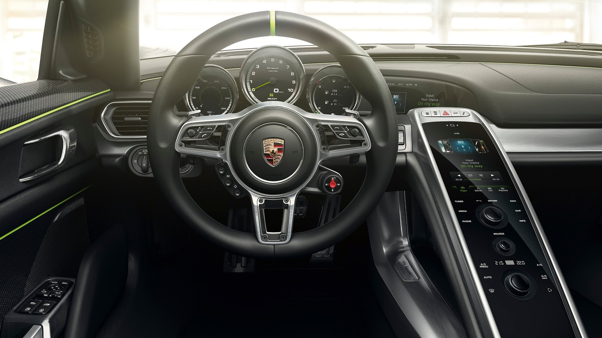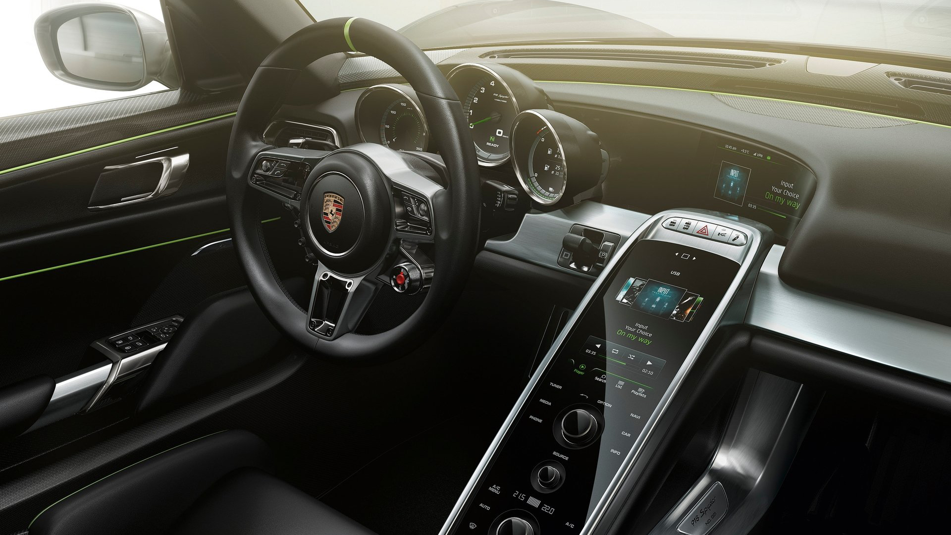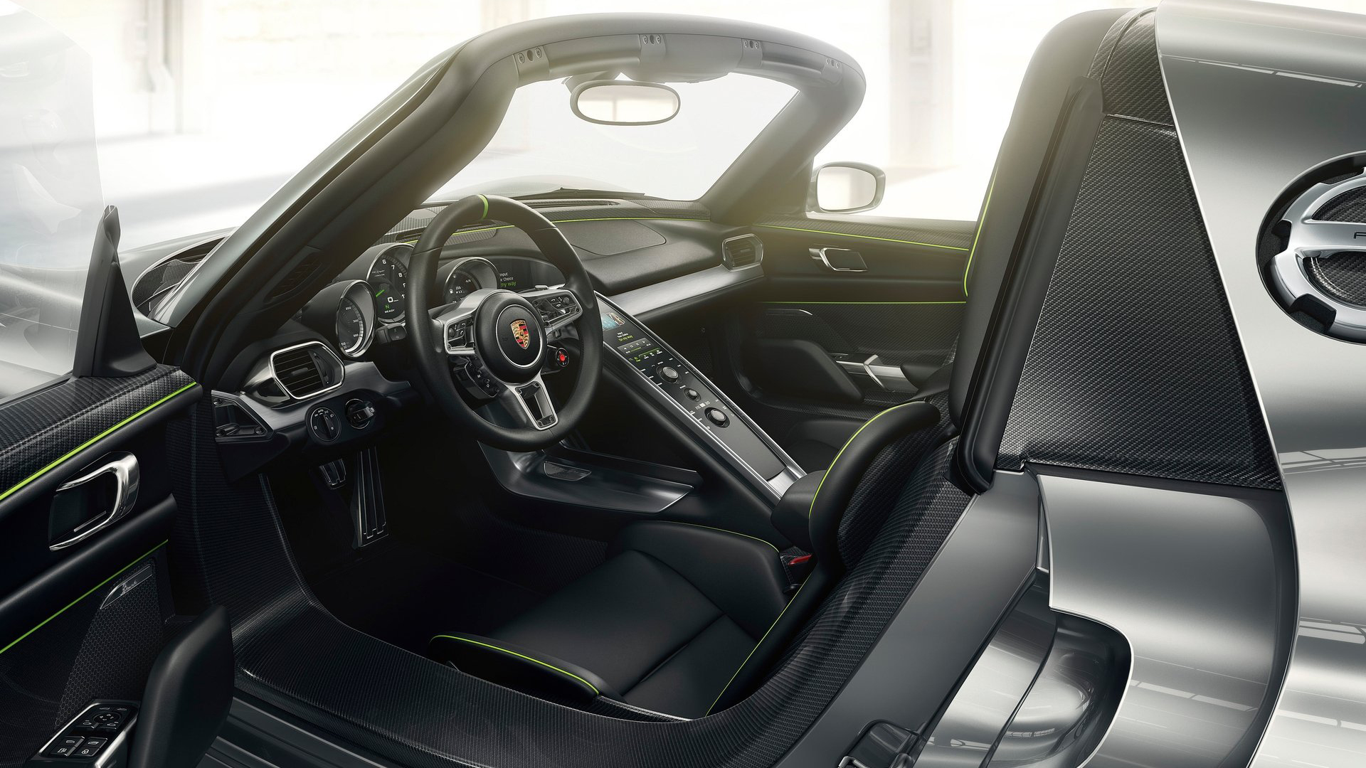 Impossibile però parlare di una vettura di questo calibro senza considerare anche l’attenzione rivolta al comparto aerodinamico. Porsche Active Aerodynamic (PAA, per gli amanti degli acronimi). Dietro a questa definizione si nasconde tutto il core dell’efficienza aerodinamica della Porsche 918 Spyder, ovvero un insieme di elementi regolabili per restituire una risposta variabile in base alle condizioni di guida. Il sistema lavora su tre fasi, passando automaticamente dall’efficienza ottimale alla massima deportanza e interagendo con le modalità operative della trazione ibrida. In modalità “Race”, l’alettone posteriore retrattile si imposta su un angolo di incidenza elevato per generare elevata downforce sull’asse posteriore. Anche lo spoiler – collocato tra i due supporti dell’alettone sul bordo di uscita – si estende. Due alette regolabili si aprono nel sottoscocca davanti all’asse anteriore, indirizzando parte dell’aria nei canali del diffusore per generare effetto suolo e sviluppare quindi carico verticale davanti. In modalità “Sport” il sistema riduce leggermente l’angolo di attacco dell’alettone posteriore, consentendo una maggiore velocità massima. Lo spoiler rimane esteso, ma le alette aerodinamiche nel sottoscocca si chiudono, riducendo la resistenza aerodinamica e aumentando così la top speed. In modalità “E” invece, il sistema si concentra esclusivamente sulla riduzione della resistenza aerodinamica: l’alettone posteriore e lo spoiler sono retratti e i flap sottoscocca sono chiusi. Le prese d’aria regolabili sotto i fari principali completano l’aerodinamica attiva. A vettura ferma e in modalità “Race” o “Sport”, le prese d’aria vengono aperte per consentire il massimo raffreddamento. In modalità “E-Power” e “Hybrid”, le prese d’aria si chiudono non appena la vettura si mette in marcia per ridurre al minimo la resistenza aerodinamica e non vengono riaperte fino a quando la vettura non raggiunge una velocità di circa 130 km/h o quando le esigenze di raffreddamento sono maggiori. Compresi a questo punto messa a punto, powertrain e dotazione aerodinamica (che ne ha ovviamente influenzato il design esterno), è il momento di fare un salto a bordo. Come facile immaginare, è il guidatore ad essere messo al centro dell’esperienza in abitacolo, che viene quindi suddiviso in due sezioni principali: la prima comprende i comandi importanti per la guida e sono ovviamente raggruppati intorno al volante e combinati alle informazioni dedicate al conducente, che vengono mostrate sulla strumentazione a tre indicatori tondi. La seconda comprende il blocco infotainment alloggiato nella consolle centrale rialzata, originariamente introdotta sulla Carrera GT. Sistemi come il climatizzatore, la regolazione degli spoiler, l’illuminazione e il Porsche Communication Management (PCM), insieme all’impianto audio Burmester High-End, possono essere gestiti tramite le funzioni di controllo multi-touch presenti sul display Black Panel. E come il nome Spyder lascia immediatamente intuire, anche l’emozione di avere il vento tra i capelli è stata messa tra gli elementi centrali a cui riservare attenzione nell’esperienza di guida di questa vettura. E per goderne appieno è sufficiente rimuovere i due pannelli in plastica rinforzata con fibra di carbonio (CFRP) che costituiscono il tetto per godere dell’emozione en plein air. Questi, possono essere riposti nel vano bagagli da 100 litri situato nella parte anteriore dell’auto.