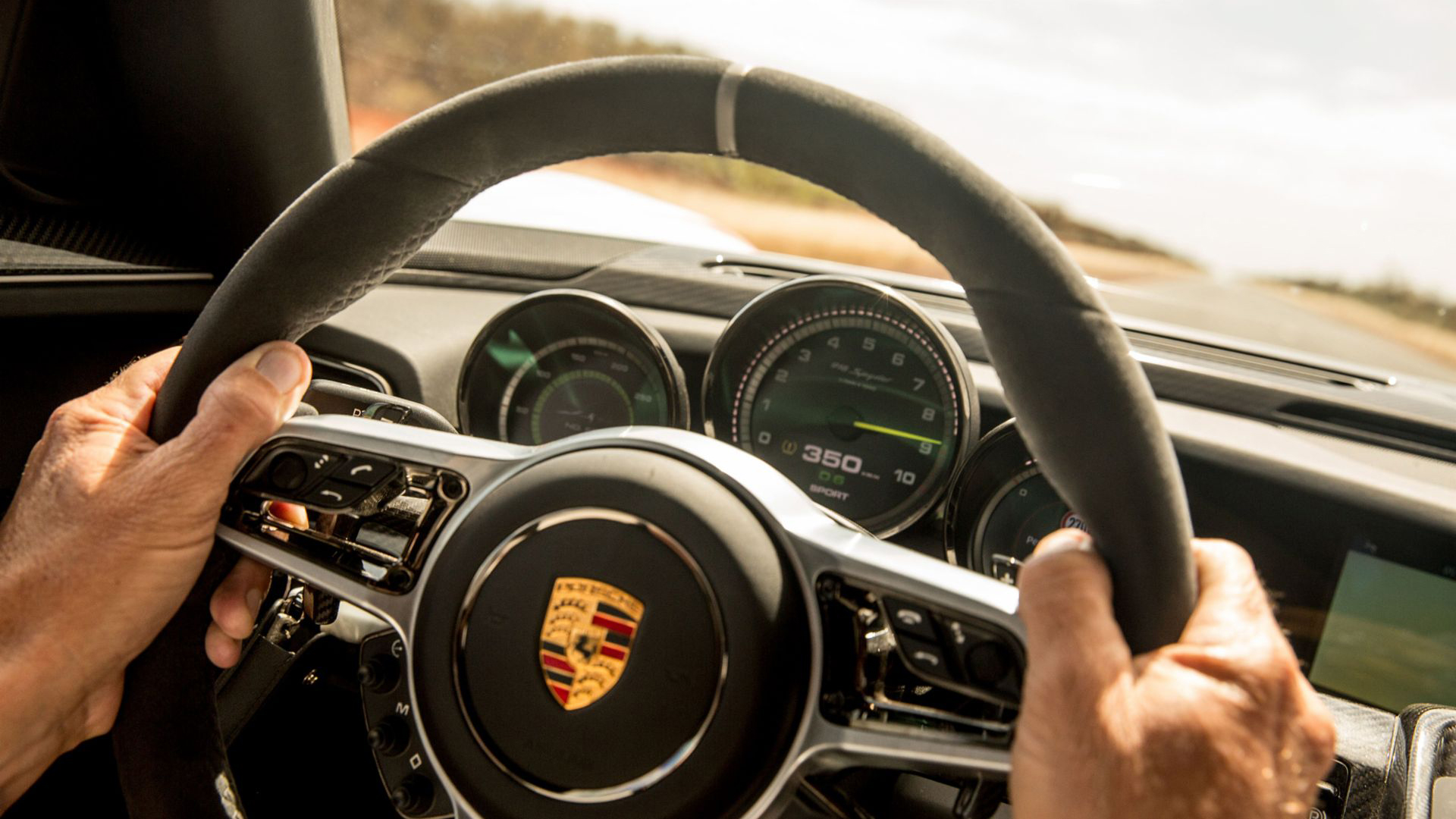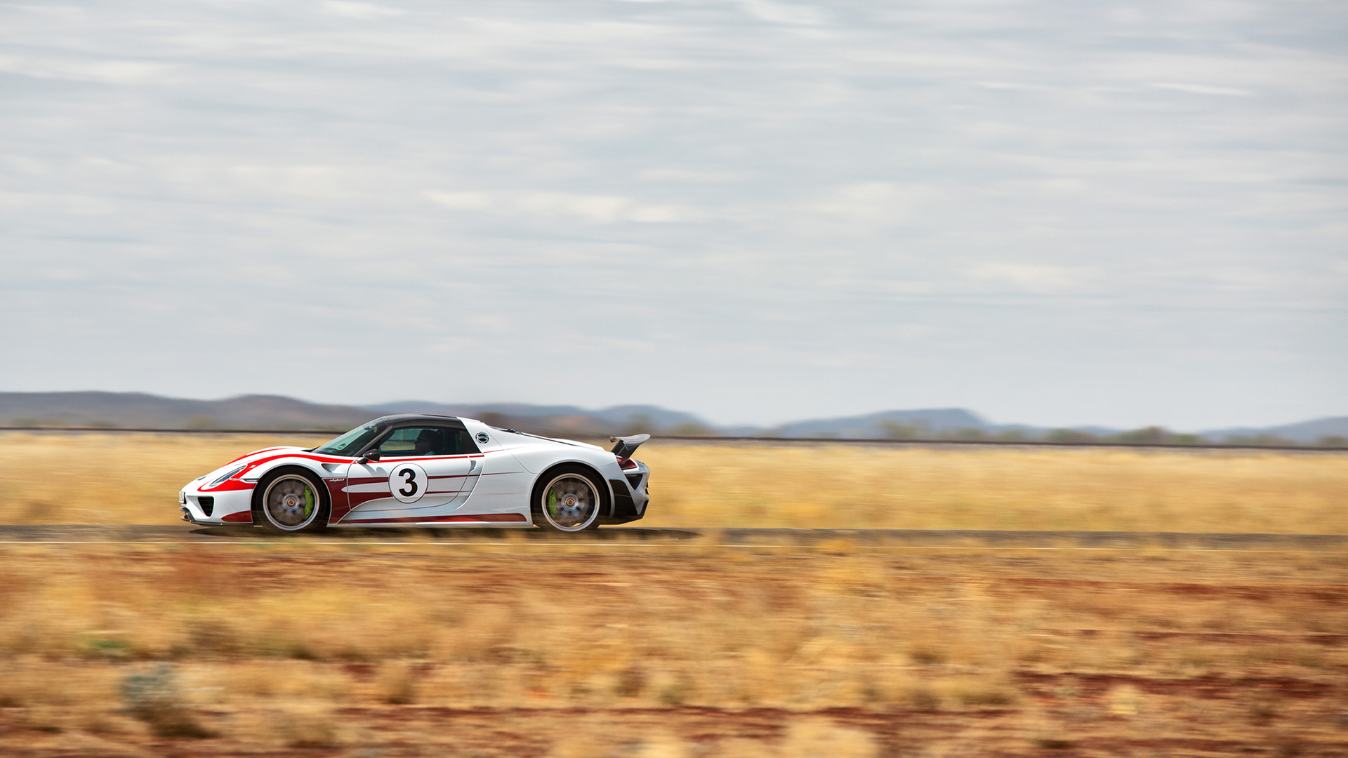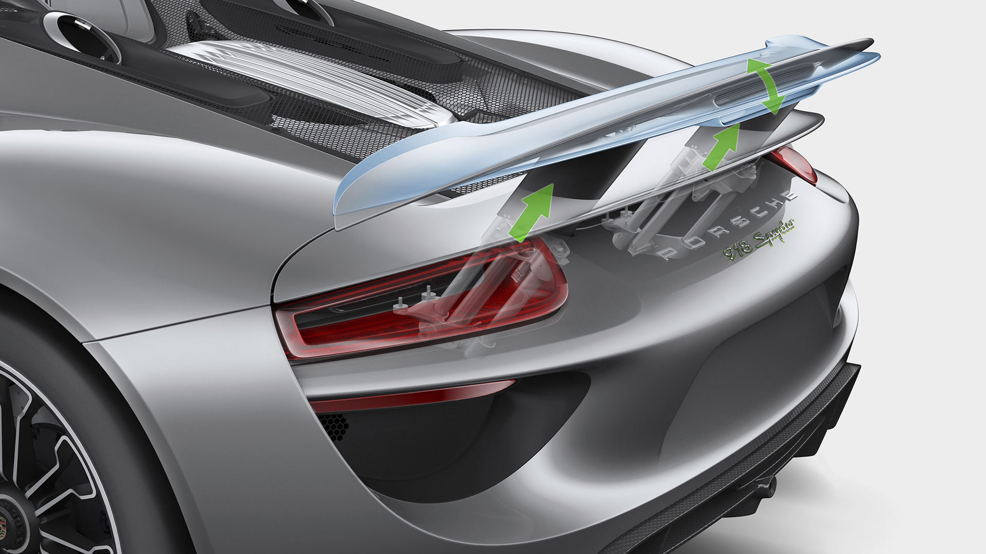 Impossibile però parlare di una vettura di questo calibro senza considerare anche l’attenzione rivolta al comparto aerodinamico. Porsche Active Aerodynamic (PAA, per gli amanti degli acronimi). Dietro a questa definizione si nasconde tutto il core dell’efficienza aerodinamica della Porsche 918 Spyder, ovvero un insieme di elementi regolabili per restituire una risposta variabile in base alle condizioni di guida. Il sistema lavora su tre fasi, passando automaticamente dall’efficienza ottimale alla massima deportanza e interagendo con le modalità operative della trazione ibrida. In modalità “Race”, l’alettone posteriore retrattile si imposta su un angolo di incidenza elevato per generare elevata downforce sull’asse posteriore. Anche lo spoiler – collocato tra i due supporti dell’alettone sul bordo di uscita – si estende. Due alette regolabili si aprono nel sottoscocca davanti all’asse anteriore, indirizzando parte dell’aria nei canali del diffusore per generare effetto suolo e sviluppare quindi carico verticale davanti. In modalità “Sport” il sistema riduce leggermente l’angolo di attacco dell’alettone posteriore, consentendo una maggiore velocità massima. Lo spoiler rimane esteso, ma le alette aerodinamiche nel sottoscocca si chiudono, riducendo la resistenza aerodinamica e aumentando così la top speed. In modalità “E” invece, il sistema si concentra esclusivamente sulla riduzione della resistenza aerodinamica: l’alettone posteriore e lo spoiler sono retratti e i flap sottoscocca sono chiusi. Le prese d’aria regolabili sotto i fari principali completano l’aerodinamica attiva. A vettura ferma e in modalità “Race” o “Sport”, le prese d’aria vengono aperte per consentire il massimo raffreddamento. In modalità “E-Power” e “Hybrid”, le prese d’aria si chiudono non appena la vettura si mette in marcia per ridurre al minimo la resistenza aerodinamica e non vengono riaperte fino a quando la vettura non raggiunge una velocità di circa 130 km/h o quando le esigenze di raffreddamento sono maggiori. Compresi a questo punto messa a punto, powertrain e dotazione aerodinamica (che ne ha ovviamente influenzato il design esterno), è il momento di fare un salto a bordo. Come facile immaginare, è il guidatore ad essere messo al centro dell’esperienza in abitacolo, che viene quindi suddiviso in due sezioni principali: la prima comprende i comandi importanti per la guida e sono ovviamente raggruppati intorno al volante e combinati alle informazioni dedicate al conducente, che vengono mostrate sulla strumentazione a tre indicatori tondi. La seconda comprende il blocco infotainment alloggiato nella consolle centrale rialzata, originariamente introdotta sulla Carrera GT. Sistemi come il climatizzatore, la regolazione degli spoiler, l’illuminazione e il Porsche Communication Management (PCM), insieme all’impianto audio Burmester High-End, possono essere gestiti tramite le funzioni di controllo multi-touch presenti sul display Black Panel. E come il nome Spyder lascia immediatamente intuire, anche l’emozione di avere il vento tra i capelli è stata messa tra gli elementi centrali a cui riservare attenzione nell’esperienza di guida di questa vettura. E per goderne appieno è sufficiente rimuovere i due pannelli in plastica rinforzata con fibra di carbonio (CFRP) che costituiscono il tetto per godere dell’emozione en plein air. Questi, possono essere riposti nel vano bagagli da 100 litri situato nella parte anteriore dell’auto.