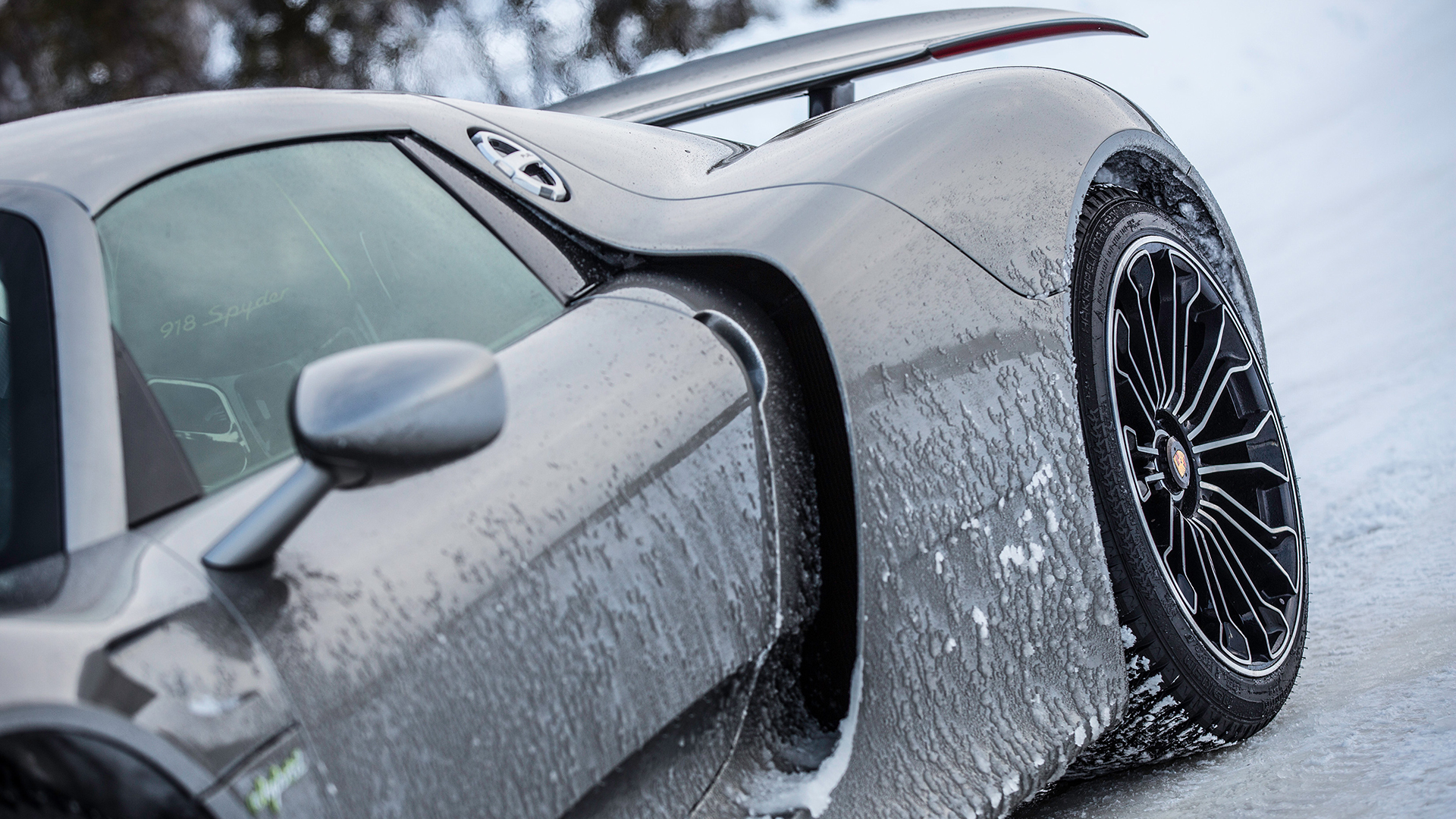 A sublimare la straordinaria dotazione tecnica di questa raffinatissima hypercar ibrida è un telaio multilink ispirato a quello delle auto da corsa e che viene a sua volta completato dal sistema di ammortizzatori adattivi Porsche Active Suspension Management (PASM) e dall’asse posteriore sterzante, che è essenzialmente un sistema di regolazione elettromeccanica per ciascuna ruota posteriore. Questa regolazione è sensibile alla velocità, consentendo angoli di sterzata fino a 3° in ciascuna direzione. Cosa significa tutto ciò? Significa che l’asse posteriore può essere sterzato nella stessa direzione o in direzione opposta a quella delle ruote anteriori. Alle basse velocità il sistema sterza le ruote posteriori in direzione opposta a quelle anteriori, con l’effetto di accorciarne il passo. Questo allo scopo di restituire un inserimento in curva più veloce e preciso, riducendo il diametro di sterzata. A velocità più elevate il sistema sterza le ruote posteriori nella stessa direzione di quelle anteriori, con l’effetto di allungarne il passo e con l’obiettivo di incrementare la stabilità del retrotreno nei cambi di direzione rapidi. Di pari passo con queste caratteristiche dinamiche è quindi andato anche lo sviluppo degli pneumatici specificatamente sviluppati per questa vettura. Una sfida non indifferente, in quanto le coperture dovevano infatti essere in grado di restituire aderenza e maneggevolezza praticamente su ogni tipologia di strada percorribile, pista compresa (una condizione quest’ultima che richiede la minima resistenza al rotolamento possibile). Pertanto gli uomini della Michelin dovettero lavorare fianco a fianco con il team di sviluppo di Zuffenhausen per dare luce ad un prodotto che si concretizzò nei Michelin Pilot Sport Cup 2 (per dare un’idea della portata dell’impresa affrontata, basti pensare che in fase di collaudo vennero prodotti e testati complessivamente 550 prototipi di pneumatici, a cui si aggiunsero 400 prototipi di pre-produzione e 200 esemplari di prova in serie prima che Porsche desse l’approvazione definitiva), che calzano la 918 Spyder nelle misure 265/35 ZR 20 davanti e 325/30 ZR 21 dietro.