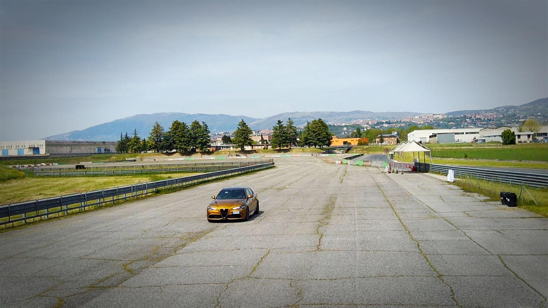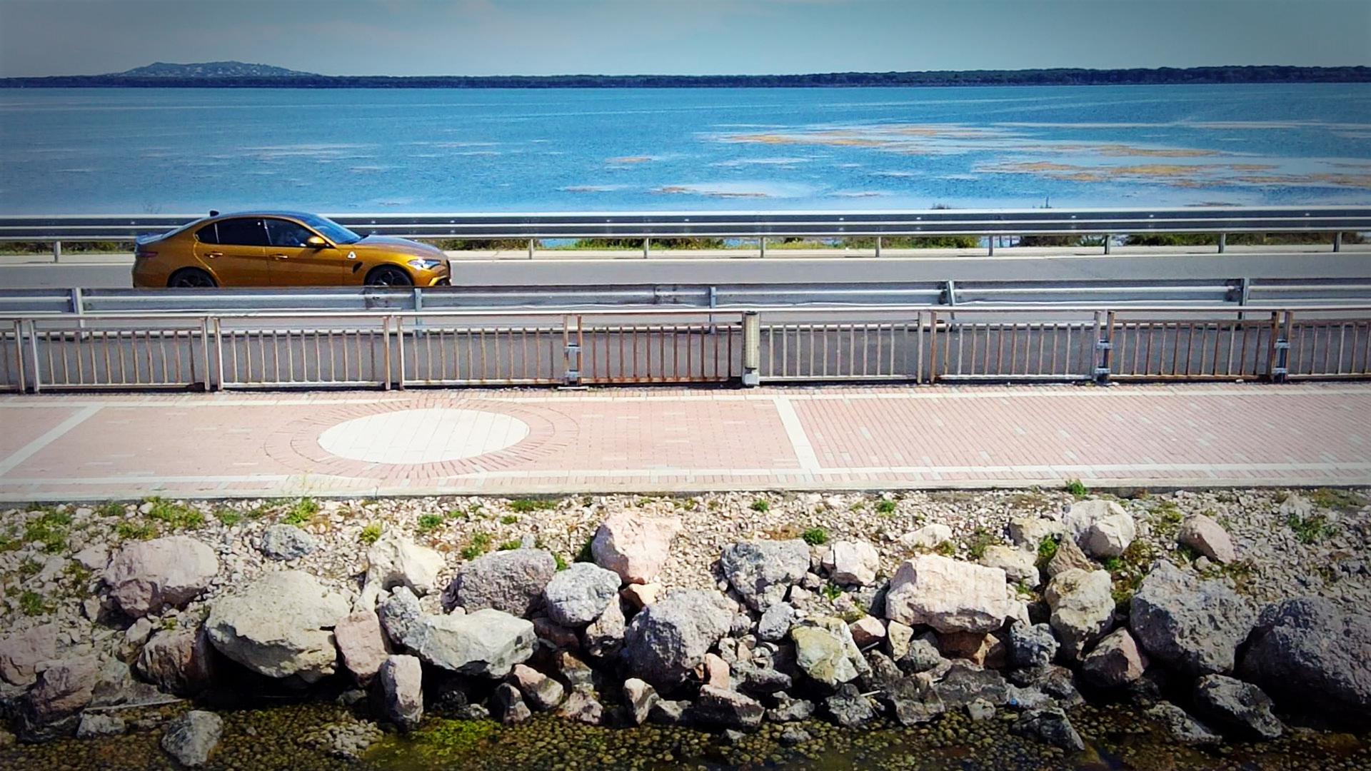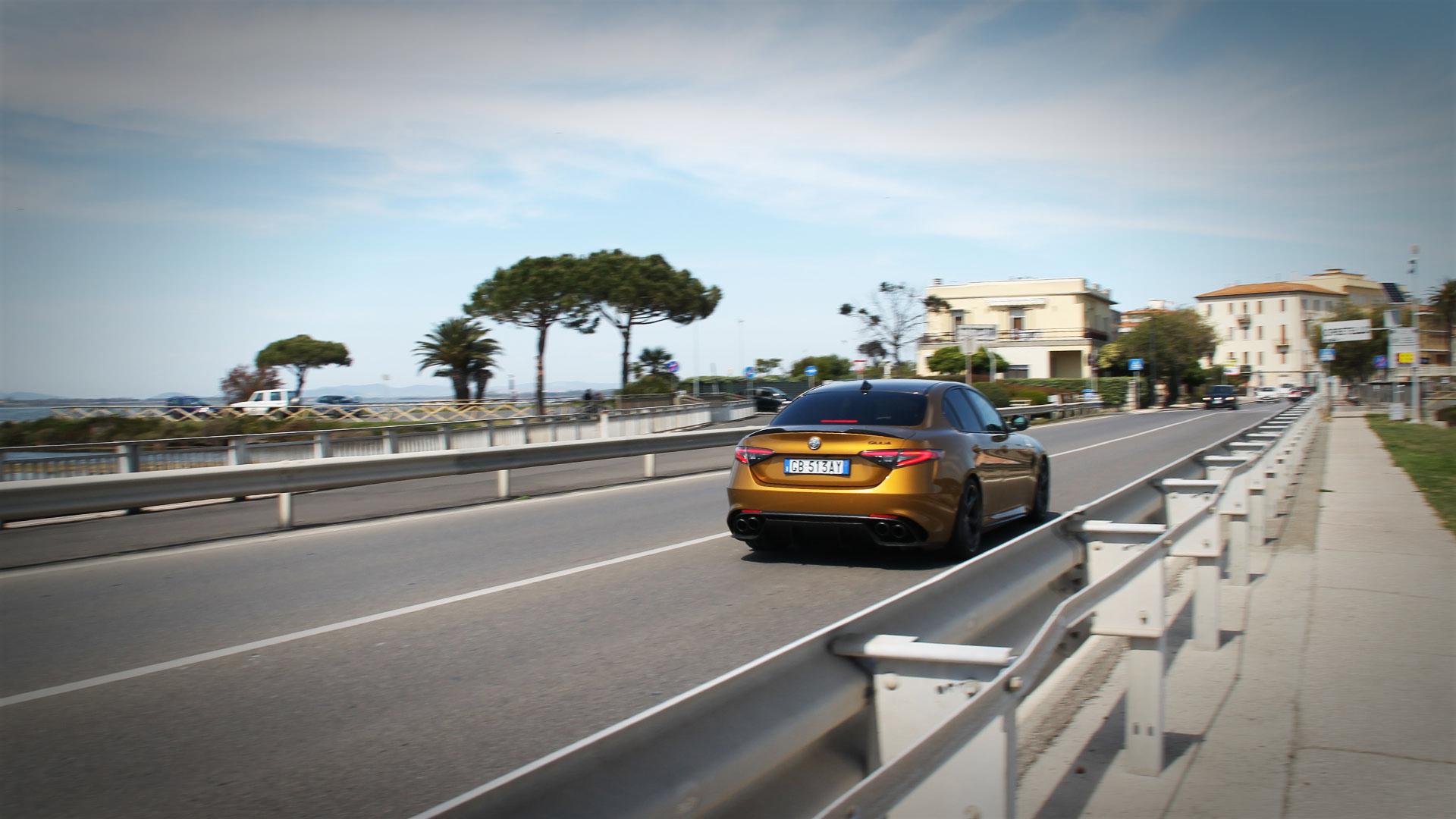 Ma il protagonista assoluto dell’esperienza di guida di Alfa Romeo Giulia Quadrifoglio è in maniera indiscussa uno ed uno solamente: il motore. Si tratta di un’unità piuttosto piccola (solo 2.9 litri di cubatura), ma non per questo non esuberante. Tutt’altro. Il biturbo italiano è un mare in burrasca. E ci pensano i suoi numero a dirlo: 510 CV di potenza, 600 Nm di coppia, da 0 a 100 km/h in soli 3.9 secondi e 307 km/h di velocità massima. Valori impressionanti e che vengono trasmessi alle ruote posteriori da un cambio automatico a 8 rapporti capace di cambiare marcia in soli 150 millisecondi (in modalità Race). E che vi assicuriamo essere un vero e proprio prodigio d’ingegneria per rapidità di passaggio marcia e per fluidità d’innesto. E lo scarico Akrapovic non manca di demarcare, con tutta una serie di scoppiettii, innesti e rilasci, nonché di esaltare il timbro vocale del propulsore. Soli 1.695 kg di peso in ordine di marcia (ripartiti al 50:50 tra davanti e dietro) e uno schema sospensioni AlfaTM Link a quadrilateri sovrapposti con asse di sterzo semi-virtuale davanti e AlfaTM Link con braccio verticale dietro completano la caratterizzazione tecnica di questa vettura, che monta cerchi da 19” gommati 245/35 all’anteriore e 285/30 al posteriore, e che, nella versione da noi provata, sfoggiano alle loro spalle un impianto frenante carboceramico che davvero lascia a bocca aperta per potenza ed efficacia. Lunga 4.643 mm, larga 1.860 mm e alta 1.450 mm, nonché con un passo di 2.820 mm, Giulia Quadrifoglio (che dispone di Torque Vectoring per ripartire la coppia tra le ruote dell’assale posteriore) non sorprende solo sotto il profilo tecnico, ma anche sotto quello tecnologico. Il sistema infotainment si relaziona con gli occupanti tramite uno schermo touch da 8.8” e mette a disposizione praticamente ogni informazione e servizio, compresi Apple Car Play e Android Auto. E, ciliegina sulla torta, una quantità esagerata di dispositivi ADAS, tra cui: Lane keeping Assist, Active Blind Spot Assist, Traffic Jam Assist e Highway Assist, Intelligent Speed Control, Traffic Sign Recognition, Driver Attention Assist. Insomma: di tutto e di più.