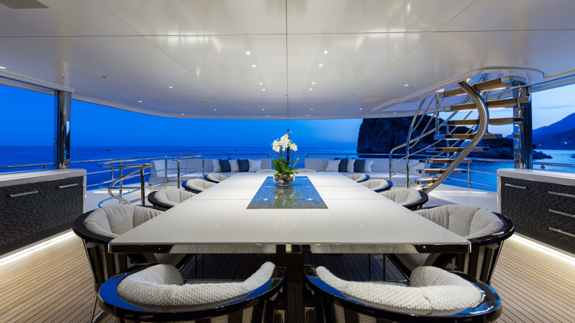 Dotato di un solarium di 93 mq, l’Alia Yachts Rüya dispone di vasca idromassaggio in grado di accogliere al suo interno fino a 10 persone, mentre un bar completo di sala da pranzo assicura comfort e relax per pasti e aperitivi. Il ponte di poppa mette a disposizione degli occupanti un’area in cui godere del massimo relax per la cena, mentre il ponte di prua è interamente dedicato al relax. Il beach-club consente invece di relazionarsi con le attività acquatiche grazie anche ad una scala sommergibile a comando idraulico (e che funge anche da passerella quando ormeggiati).