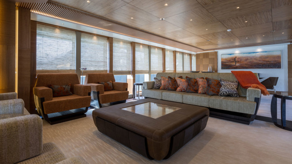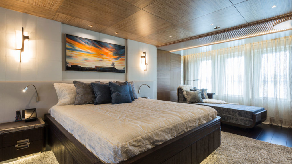 Pensato per essere pratico e funzionale, l’Alia Yachts Rüya mette a disposizione degli occupanti degli ambienti dominati da inserti in bambù e in legno di Ebano (e che nascondono al loro interno gli altoparlanti e i condotti dell’aria condizionata), oltre che in Rovere della Tasmania, mentre una serie di elementi in acciaio spazzolato e verniciato completano la caratterizzazione estetica di questa imbarcazione, insieme a pellet ultra-sottili (con finitura liscia a stucco), a dettagli in marmo della Foresta Pluviale e a fasce in pelle intrecciata.