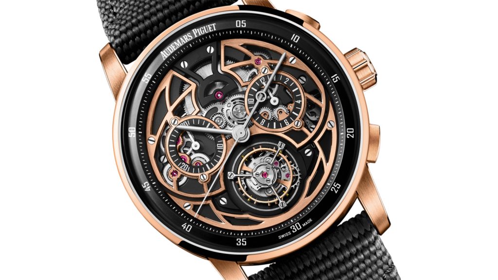 La maison elvetica presenta l’Audemars Piguet Code 11.59 Selfwinding Flying Tourbillon Chronograph, cronografo scheletrato in oro rosa e ceramica nera