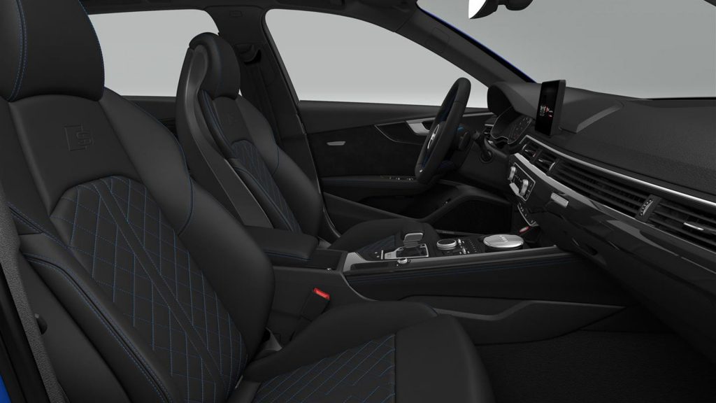 Il pacchetto Audi exclusive edition Blu Nogaro si caratterizza per l’omonima tinta (introdotta per la prima volta nel 1994 su Audi RS 2): un colore che si distingue per il suo tono acceso e brillante, esaltato dai dettagli in nero titanio della cornice del single frame e dei profili finestrini. All’interno troviamo rivestimenti in pelle Nappa nera con cuciture Blu Nogaro su sedili, volante, leva del cambio e altri elementi. Gli inserti in lacca lucida nera richiamano i dettagli esterni in nero titanio.