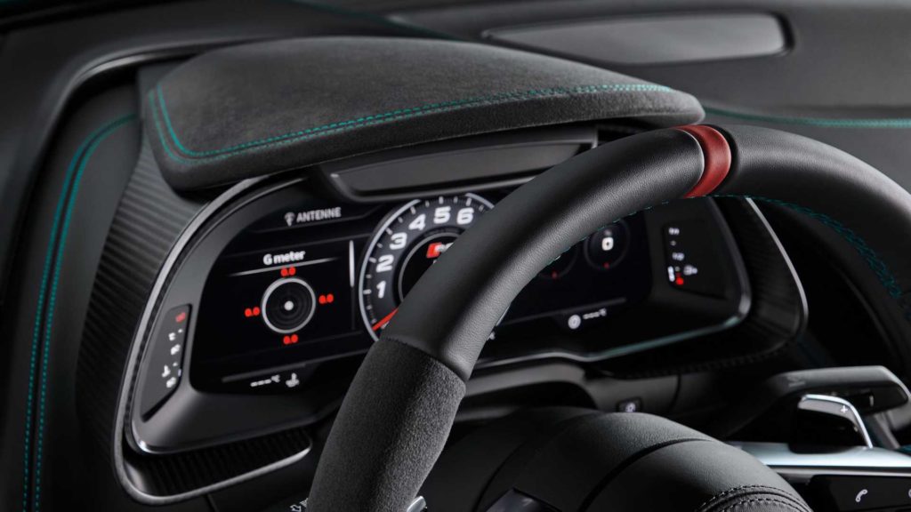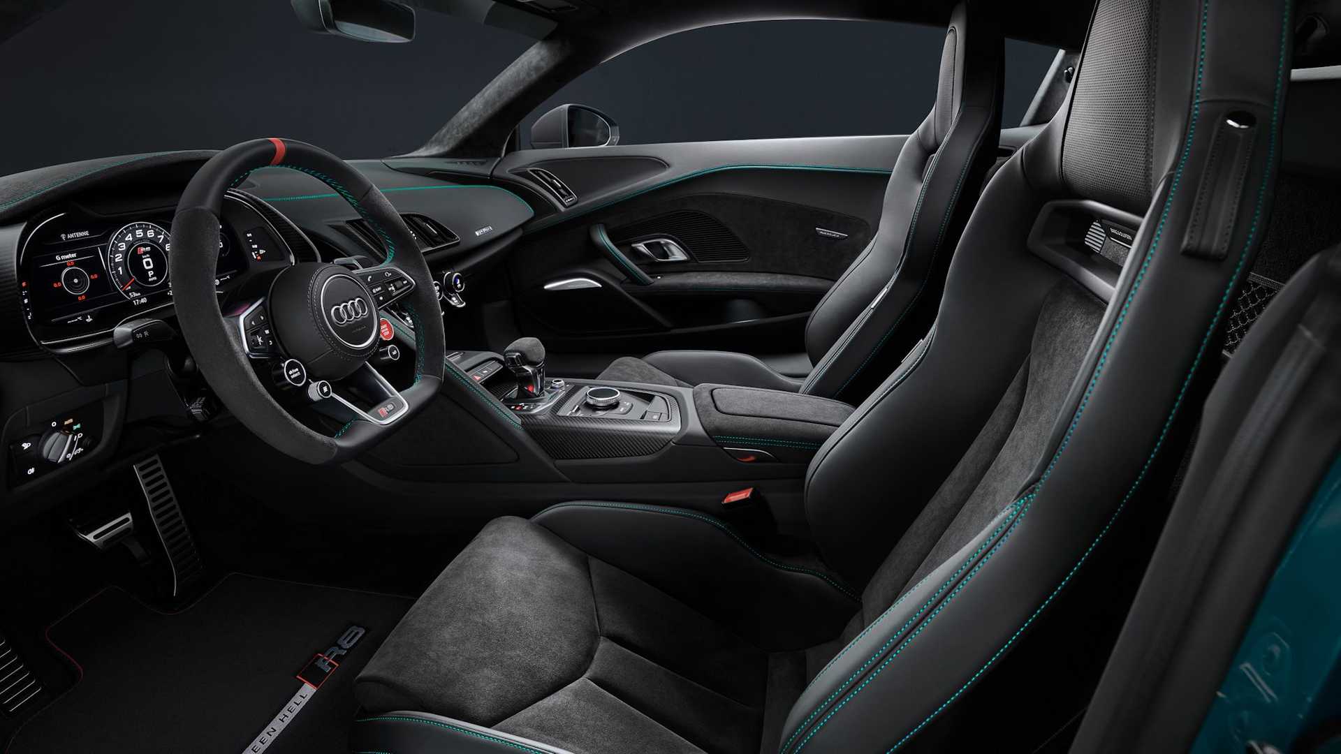 Aperta la portiera, l’Audi R8 Green Hell Edition mette in mostra un ambiente prevalentemente nero fatto di rivestimenti in Alcantara, di impunture blu e verdi a contrasto e di sedili avvolgenti e badge dedicati (notare il logo “GREEN HELL R8”).
