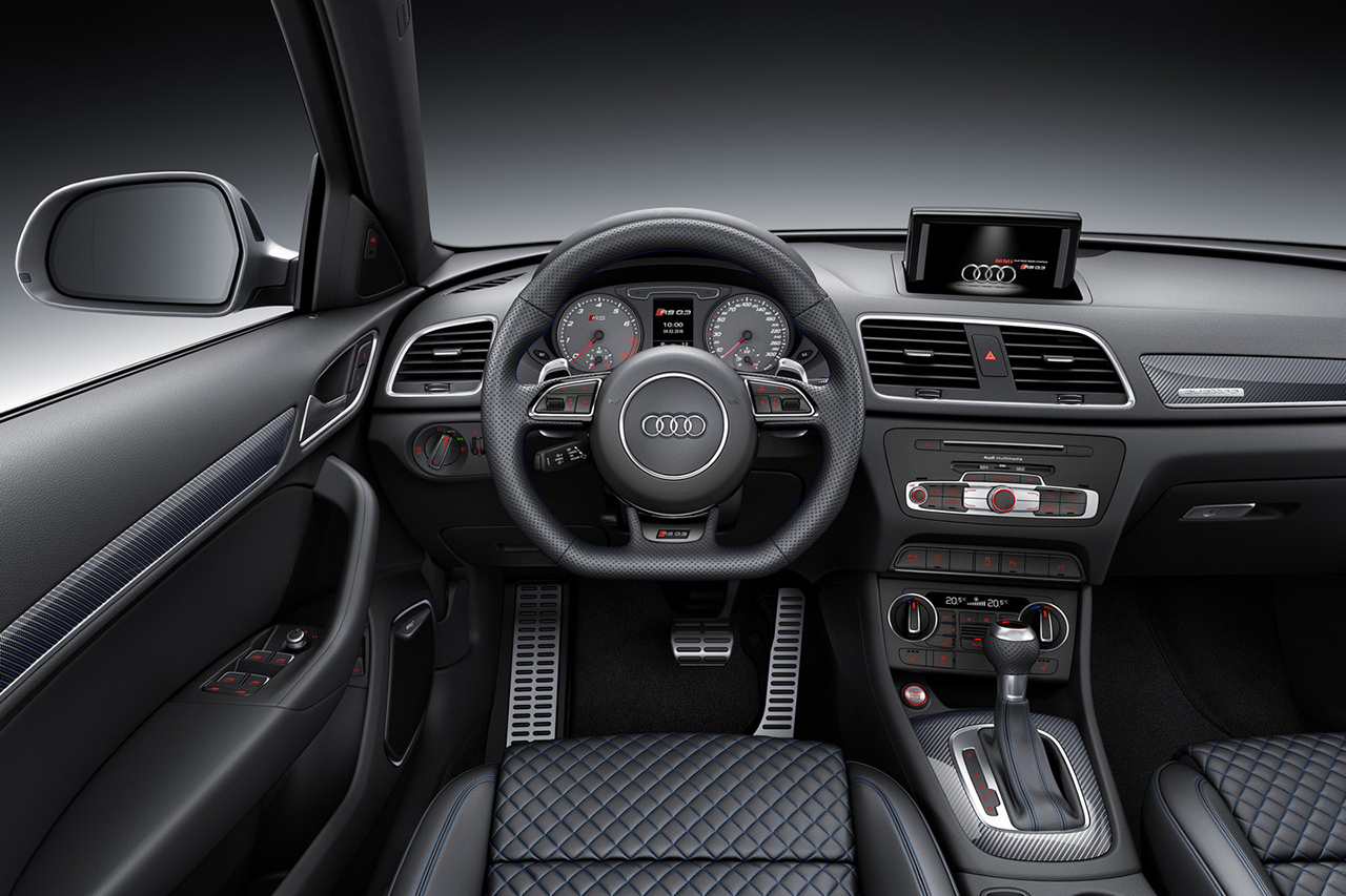 Connotata esteriormente da una serie di particolari in titanio opaco dedicati (come i cerchi in lega da 20” ad esempio), oltre che dall’ingresso all’interno della tavolozza colori dell’esclusivo Blu Ascari metallizzato, l’Audi RS Q3 performance mette a disposizione degli occupanti un cockpit connotato da rivestimenti in pelle e in Alcantara, da sellerie sportive con logo “RS Q3” in rilievo, da impunture blu a contrasto, da inserti in fibra di carbonio e da un volante a fondo piatto.