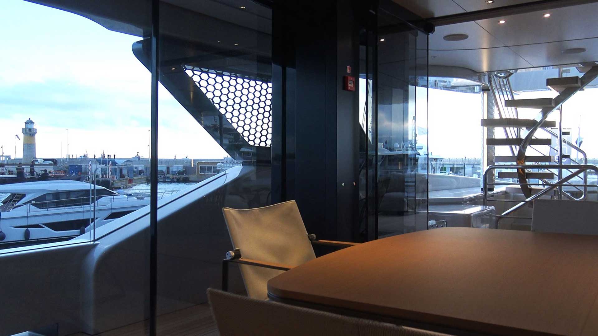 Le grandi finestrature a tutta altezza e apribili su 3 lati del ponte superiore creano una zona lounge “al fresco” con area conversazione e zona pranzo godibili con qualsiasi situazione atmosferica. Il ponte sole inoltre è lungo circa 24 metri.