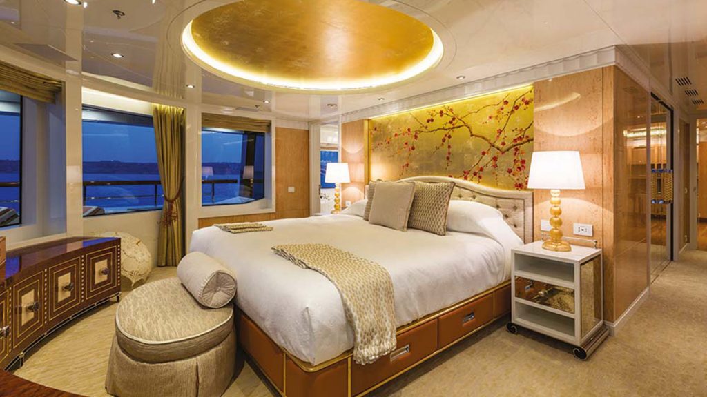 Uno spazio quest’ultimo che è in grado di accogliere al suo interno sino a 12 ospiti, che trovano alloggio in sei cabine – di cui una Master Suite (dotata di studio, salotto e plancia di poppa privata), una cabina VIP e quattro cabine doppie – e altrettanti membri dell’equipaggio. Cinema a sette posti, palestra, beach club e salone superiore convertibile completano la dotazione di questa imbarcazione.