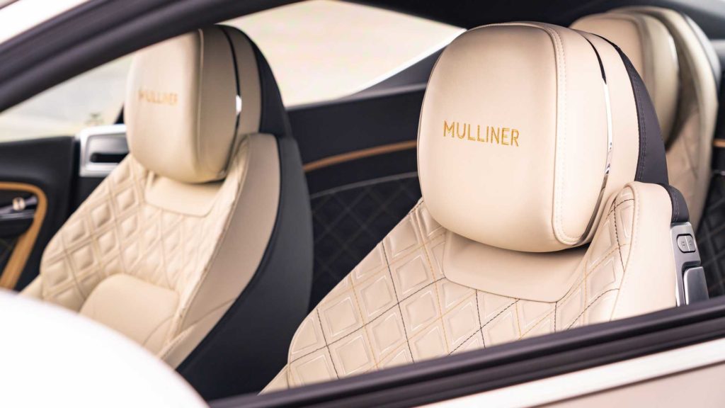 A completare la dotazione della Bentley Continental GT Mulliner troviamo i cerchi da 22” con logo autolivellante al centro, con sezioni centrali verniciate e bordi in metallo lucidato. Ma è all’interno che questa vettura punta a stupire. Mulliner offre ai clienti otto diverse combinazioni di colori degli interni a tre toni. Le impunture richiamano il motivo a doppio diamante delle griglie, mentre i bordi dei tappetini vanno in pendant con i cromatismi del cockpit.