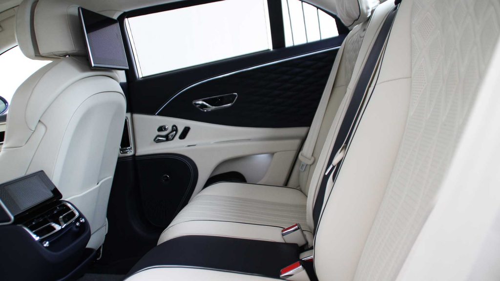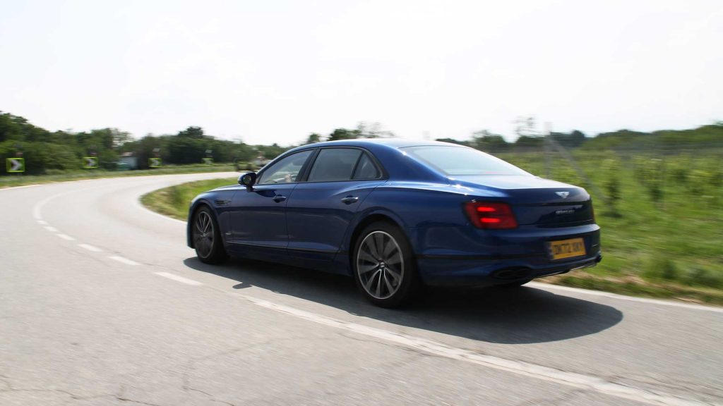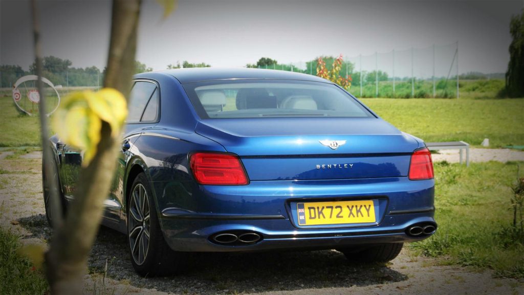 Come abbiamo detto, è dall’interno che si gode maggiormente dell’esperienza di bordo di Bentley Flying Spur V8 Azure. Da appena si viene accolti in delle confortevolissime e comode sedute. Da non appena i nostri sensi vengono ammaliati dal raffinatissimo e ricercatissimo ambiente interno. Ci si sente un po’ come a bordo di un curatissimo private-jet o di un sontuosissimo superyacht. Sì, perché dacché si accede a bordo, si ha la sensazione di immergersi quasi in un’altra dimensione, fatta di ricercatezza per il dettaglio, di comodità, di serenità e di relax. Ed in particolar modo dall’istante in cui si va a premere il pulsante start. Di primo acchito si fatica infatti a comprendere che la vettura abbia il motore acceso per via dell’elevata insonorizzazione in abitacolo. I materiali a contrasto sono una gioia per il tatto e i cromatismi tenui e “morbidi” avvolgono driver e occupanti come all’interno di una soffice e calda coperta in inverno. Ci si sente a casa; immediatamente a proprio agio una volta a bordo della berlina di Crewe. Tutti i comandi sono comodamente a portata di mano (grazie anche ad un volante che mette a disposizione praticamente tutto il necessario e che restituisce un feeling allo sterzo molto preciso e diretto) e tutti gli occupanti, che siedano davanti o dietro, sono coccolati in un’esperienza immersiva come non mai: tutti dispongono di regolazioni per le sedute, di schermi touch e di funzioni di massaggio che allietano – e non di poco – la permanenza a bordo nel corso dei lunghi trasferimenti. Ed in particolar modo chi sta seduto dietro può lasciarsi viziare da poggiatesta più comodi che mai e da tantissimo spazio a disposizione: spazio che non manca anche per piccoli oggetti e bagagli, che trovano davvero ampio posto per essere riposti. E il tutto senza mai trascurare, ovviamente, anche l’attenzione riservata ai device mobili, che possono disporre di prese USB e di ricarica wireless. Il motore è silenzioso da dentro, elastico, “pastoso” e pieno di sostanza. Risponde molto bene a ogni richiamo del gas e la trasmissione automatica funziona con la precisione della lama di un bisturi, effettuando cambiate con logiche impeccabili. È dai 4.000 giri/min circa che l’8 cilindri inglese esprime il meglio della propria sostanza, trasmettendo al pilota una sensazione di corposità che mai si trasforma in brutale veemenza.