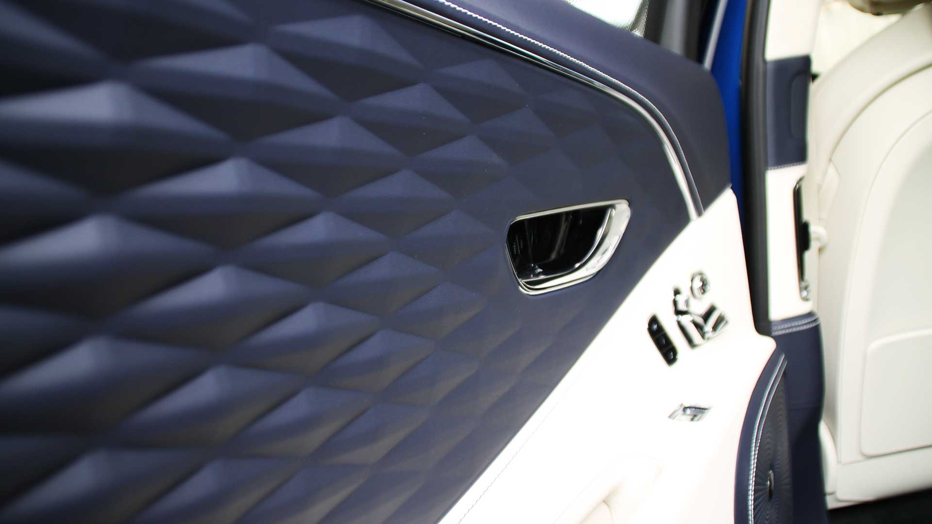Come dicevamo però, è l’ambiente interno qui a fare la voce del leone. Sì, perché l’abitacolo di Flying Spur V8 Azure si pone come obiettivo (centrato) di ridurre lo stress alla guida lavorando sul benessere di guidatore e occupanti. A partire dai cromatismi interni, che sono stati appositamente studiati per permettere al cervello di rilasciare le sostanze chimiche necessarie (tra cui la dopamina) a generare senso di tranquillità e di serenità. E a garantire il comfort di marcia – come piaceva al Fondatore della Casa inglese – è anche l’insonorizzazione in abitacolo, resa possibile, tra le altre cose, anche dal ricorso a doppi vetri. Le sellerie coccolano pilota e passeggeri in triangolazioni comode e confortevoli, impreziosite da pregiatissimi rivestimenti in pelle (i clienti possono scegliere tra 15 tonalità) con impunture a vista e riscaldabili e ventilabili, nonché dotati di 22 regolazioni disponibili e di sei impostazioni di massaggio. Inoltre gli occupanti delle file posteriori dispongono di poggiatesta particolarmente imbottiti che restituiscono un comfort paragonabile a quello di un soffice cuscino. Lettering ricamati e motivi a rombo corredano inoltre l’abitacolo, insieme a tutta una serie di materiali contrastanti, tra cui il legno. E la gamma Azure permette di scegliere fino a tre impiallacciature a poro aperto: Dark Walnut, Crown-Cut Walnut, e Koa. A questo si deve aggiungere anche un infotainment che si relaziona con gli occupanti tramite un touch-screen rotante da 12,3”, che dispone di tutte le funzionalità necessarie, come ad esempio Apple Car Play, connettività Bluetooth, WiFi streaming e molto altro ancora. Il tutto in altissima risoluzione e in grado di dialogare con i device mobili (anche se quest’ultima funzionalità, come quella di navigazione, può essere migliorata). Completamente digitale, e molto ben leggibile, anche la strumentazione, che tiene informati su tutti i parametri necessari alla guida. A completare la dotazione troviamo delle cinture di sicurezza con regolazione elettrica (che intervengono ogni qual volta necessario con un tensionamento) e il top in termini di sistemi di assistenza alla guida, che lavorano con rigore e precisione, tra cui l’Adaptive Cruise Control, il Lane Assist, il Traffic Assist e il Bentley Safeguard. E il tutto è coadiuvato dall’Head-Up-Display, dal Night Vision e dal Traffic Sign Recognition, solo per citare alcuni dei tanti ADAS disponibili. A chiudere il cerchio troviamo un volante (molto bello da impugnare) perfettamente ergonomico, con comandi integrati e con alle sue spalle paddles e satelliti – mettendo così tutto il necessario a immediata portata di mano – ed una illuminazione ambientale che svolge a sua volta un importante ruolo nell’esperienza di bordo e nel relax in abitacolo, che accoglie a partire dal logo proiettato sul pavimento dalle portiere, nonché un doppio tetto in vetro (diviso tra davanti e dietro), l’impianto audio Naim for Bentley e schermi e regolazioni dedicati per gli occupanti delle file posteriori.