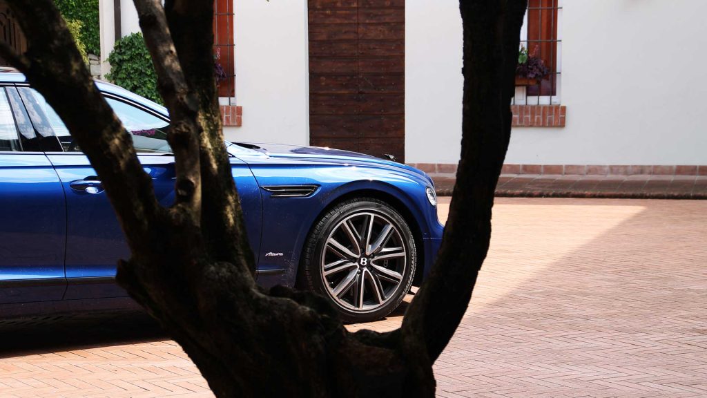 E per un viaggio di questo genere non potevamo richiedere una compagna d’avventura migliore di Bentley Flying Spur V8 Azure, il top del comfort nella visione del costruttore inglese in termini d’allestimento. È infatti il benessere di bordo ad essere stato messo al centro delle attenzioni in questo caso, più che le prestazioni, anche se queste non mancano. I dati tecnici ci parlano di un V8 biturbo da 4.0 litri al di sotto del maestosissimo cofano. Un’unità affiancata da una trasmissione ZF a doppia frizione a 8 rapporti (con paddles al volante) che sviluppa 550 CV di potenza a 6.000 giri/min e 770 Nm di coppia tra 2.000 e 4.500 giri/min e che scarica tali valori su tutte e quattro le ruote motrici – e sterzanti, allo scopo di incrementare la maneggevolezza: obiettivo che centra in pieno – al fine di far scattare la vettura verso i 100 km/h con partenza da fermo in 4.1 secondi di tempo, raggiungendo inoltre una top speed di 318 km/h. Il tutto anche grazie ad un coefficiente di resistenza di 0,298 e ad un peso di 100 kg inferiore rispetto a quello fatto segnare dalla sorella con motorizzazione W12; quest’ultima ferma l’ago della bilancia a quota 2.437 kg a vuoto e 3.000 kg in ordine di marcia. Come nel caso della Continental GT Speed che abbiamo provato lo scorso anno (e con motorizzazione W12), anche questa berlina sfrutta il Bentley Dinamic Ride per migliorare il comfort di marcia. Questa tecnologia si basa su un sistema di controllo antirollio attivo a 48 V che limita, appunto, tale movimento su quest’asse. E lo fa disaccoppiando elettronicamente le barre antirollio, quando necessario, per applicare fino a 1.300 Nm di coppia antirollio in un tempo di 0,3 secondi, in curva, allo scopo di mantenere il corpo vettura piatto e stabile. Lunga 5.316 mm, larga 2.220 mm, alta 1.483 mm e con 3.194 mm di passo, sfrutta dei cerchi da 22” (gommati Pirelli di primo equipaggiamento nelle misure 275/35 davanti e 315/30 dietro) alle cui spalle lavorano degli impianti frenanti ventilati da 420 x 40 mm davanti (nonché lavorati da pinze a 10 pistoncini) e 380 x 30 mm dietro (e lavorati da pinze a 4 pistoncini) e alle cui spalle lavorano delle sospensioni in alluminio con barre anti-rollio attive da 48 Volt, come detto poc’anzi, e di tipo a doppio braccio all’anteriore e multi-link al posteriore. Quattro i driving mode messi a disposizione dal sistema: Bentley, Comfort, Sport e Custom. Il primo è pensato per ottimizzare la trazione della vettura e permette di sfruttare al massimo, in perfetto equilibrio dinamico, tutte le potenzialità di Flying Spur preservandone comunque la fruibilità; il secondo è ovviamente quello più vocato a coccolare gli occupanti, soprattutto nel corso dei lunghi trasferimenti; il terzo massimizza le prestazioni e la risposta motore. Incrementa la reattività del sistema, ma è qui pensata per rendere il tutto più pronto senza stravolgerne il balance; il quarto invece è quello più orientato ad assecondare le specifiche esigenze dell’individuo, consentendo quindi al driver, letteralmente, di cucirsi addosso la vettura.