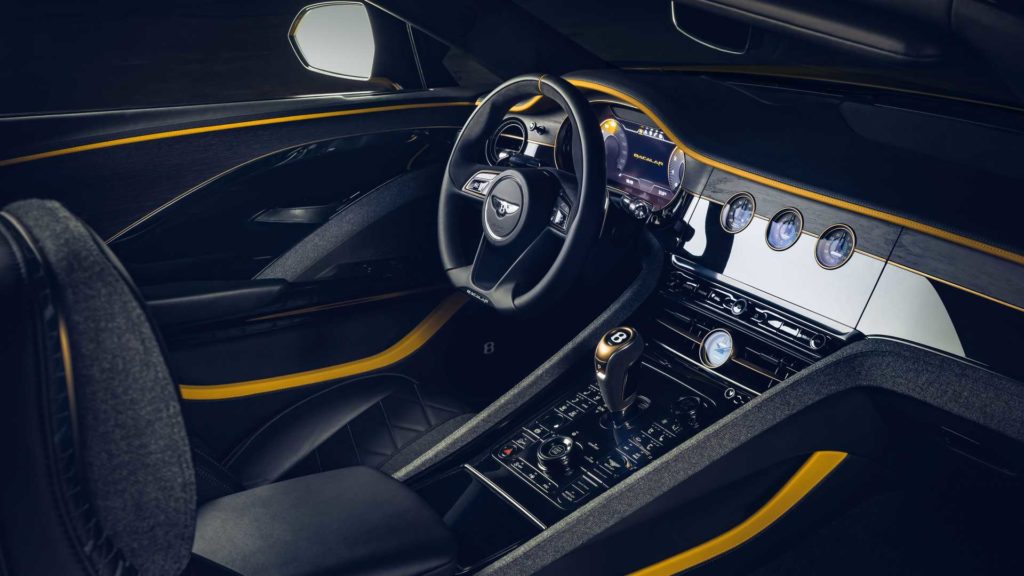 Rivestimenti in Riverwood estremamente raro (ovvero un legno sostenibile ricavato da alberi caduti naturalmente e rimasti per 5.000 anni nei laghi e nei fiumi delle Fenlands dell’East Anglia, in Inghilterra) e inserti di schienali e poggiatesta in tessuto di lana naturale caratterizzano l’ambiente interno della Bentley Mulliner Bacalar, insieme a degli elementi lana intrecciata Wilton, mentre il set di valige presenta lo stesso ricamo impiegato per i sedili.