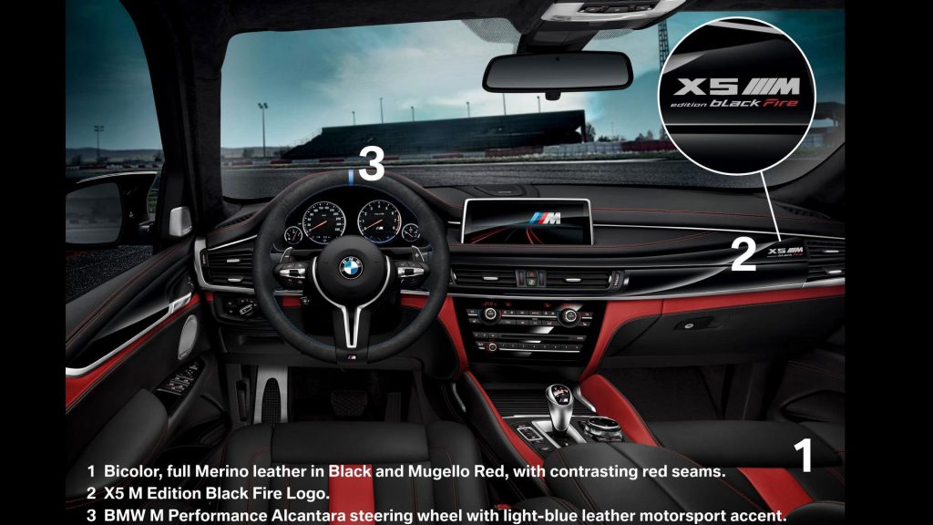 Cerchi in lega da 21” di diametro neri (cromatismo quest’ultimo impiegato anche per la griglia frontale), colorazione Sapphire Black Metallic, pinze freno e cover degli specchietti retrovisori blu caratterizzano l’impatto visivo di BMW X5 M e X6 M Black Fire Edition, che mette in mostra, all’interno dell’abitacolo, anche dei rivestimenti in pelle Merino e degli inserti in Rosso Mugello, oltre a degli elementi in color antracite, a dei badge dedicati e a un volante sportivo M rivestito in cuoio nero con impunture rosse a vista (ma chi lo vorrà potrà anche optare per lo sterzo BMW M Performance in Alcantara con dettagli blu).