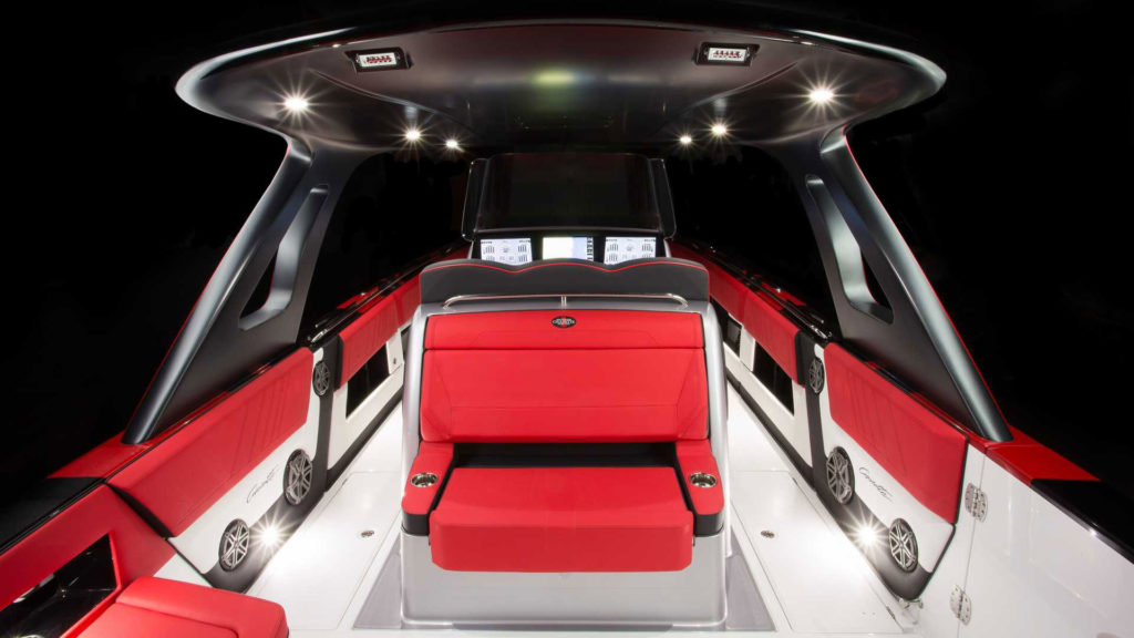 In grado di ospitare a bordo sino a 20 persone (ad una velocità di crociera; è tollerato invece un massimo di 8 occupanti per il raggiungimento della top speed), il Cigarette Racing 41′ AMG Carbon Edition dispone di una plancia con tre display ad alta definizione da 17” e si caratterizza per una colorazione in Designo Graphite Gray ‘spezzata’ unicamente dalle già menzionate bande rosse.