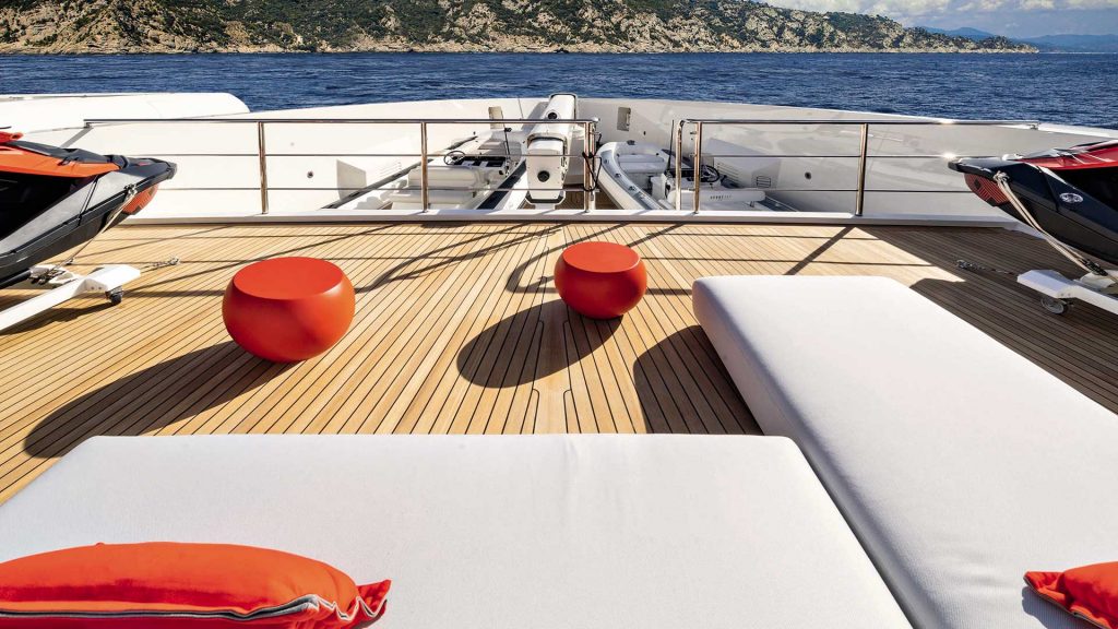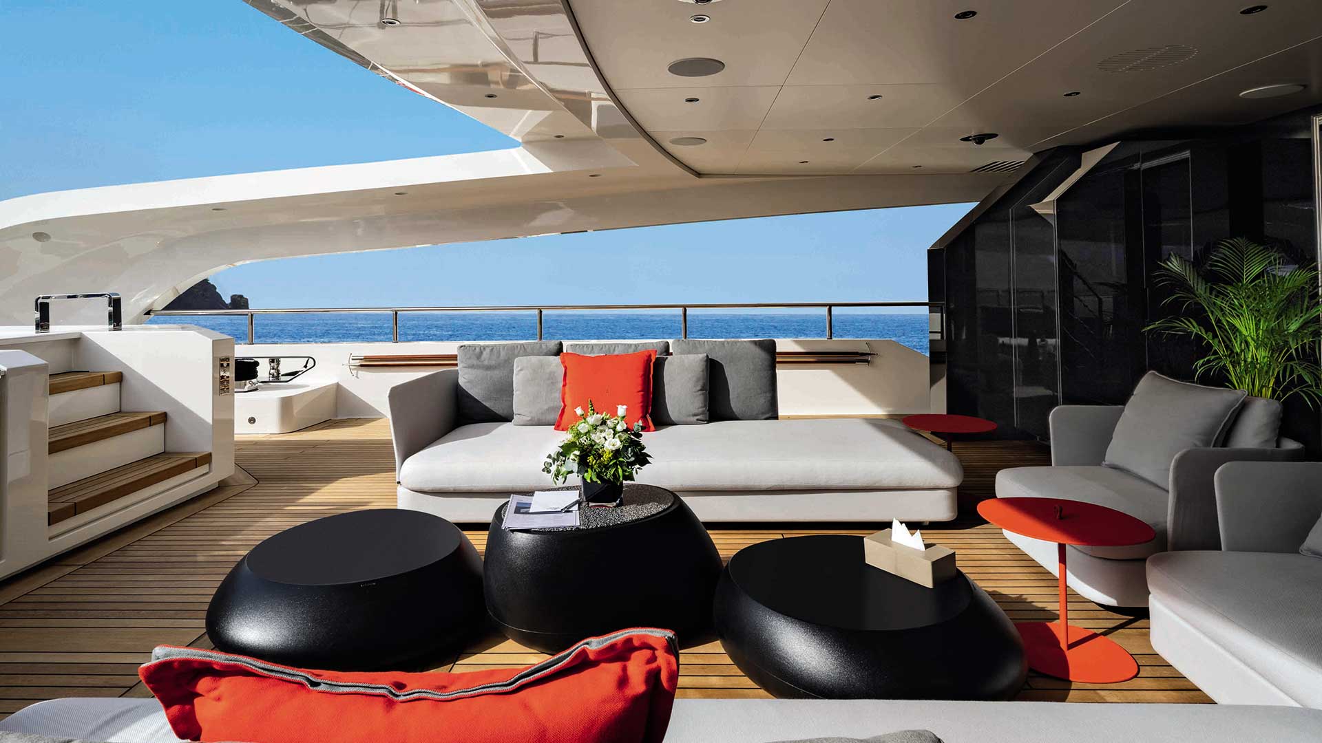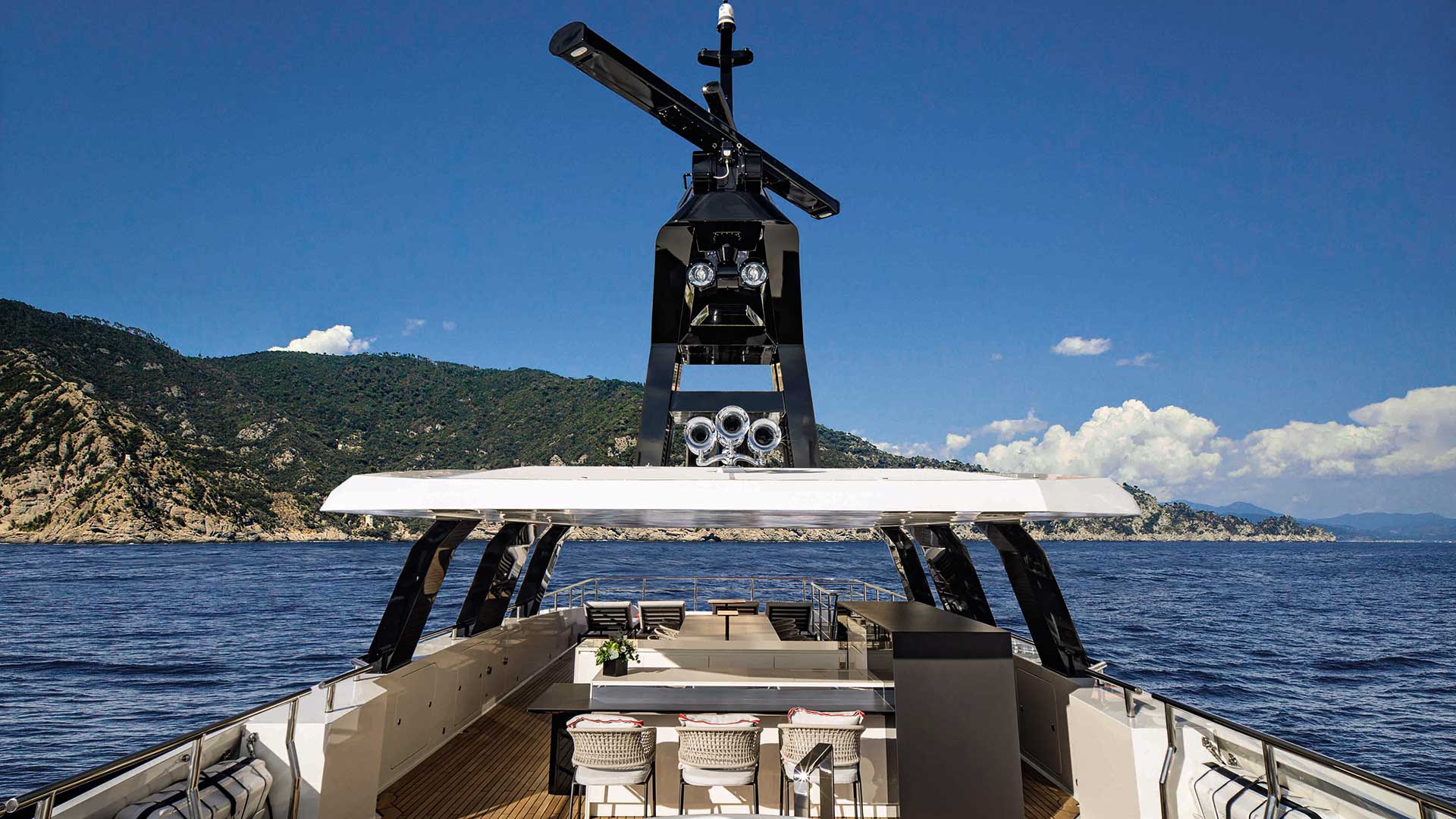 Il Sun Deck è un luogo multifunzionale. Verso poppa, prende vita un’area lounge totalmente dedicata alla convivialità. Al centro spicca un tavolo full custom, gemello di quello che si trova nella zona dining dell’Upper Deck, che può ospitare fino a 10 commensali; il tavolo può essere diviso e ancorato nelle zone laterali per creare uno spazio per feste serali. Elemento protagonista del ponte è il lounge-bar a ferro di cavallo, che si apre sia verso prua che verso poppa e che fa da diaframma alla zona solarium con piscina idromassaggio circolare all’estrema prua. Grazie ai due motori Caterpillar C32 ACERT SCAC 1230kW @ 2000 – 2300 rpm, lo yacht può raggiungere una velocità massima di 16,5 nodi e una velocità di crociera di 14 nodi.
