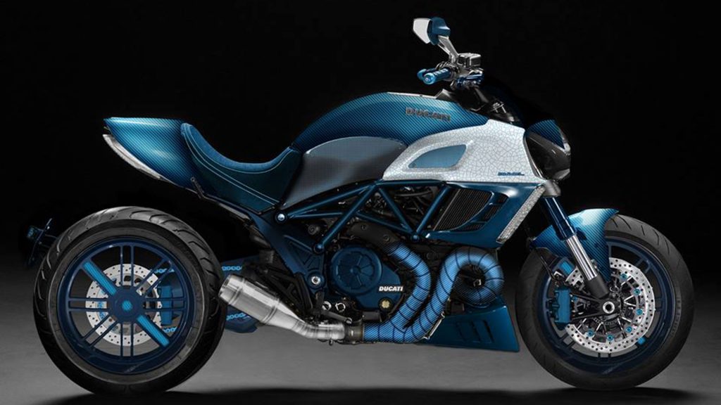 Caratterizzata da una livrea bicromatica blu e argento con elementi in fibra di carbonio a vista commisti ad Alutex e Alcantara, la Ducati Diavel by Garage Italia Customs presenta anche inediti cerchi a razze sdoppiate dal disegno abbastanza originale e un impianto di scarico aftermarket a singola uscita sul lato destro che si avvale di collettori rivestiti di blu.