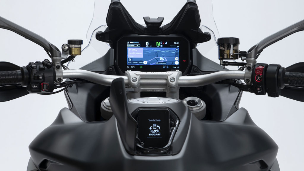 Con la Multistrada V4, Ducati introduce inoltre un’anteprima assoluta nel mondo delle moto: il radar anteriore e posteriore (sviluppati in collaborazione con la Bosh), che permette l’utilizzo del Cruise Control Adattivo (ACC) e del Blind Spot Detection (BSD).