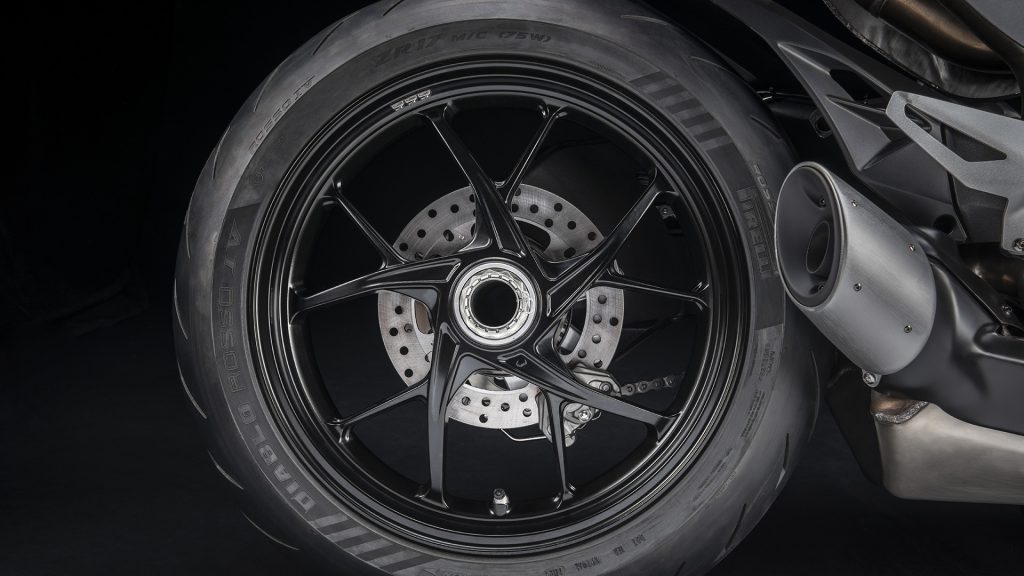 Lo Streetfighter V2 monta cerchi a 5 razze e i nuovi pneumatici Pirelli Diablo Rosso IV nelle misure di 120/70 ZR17 all’anteriore e 180/60 ZR17 al posteriore. L’impianto frenante è uguale a quello della Panigale V2, dotato di pinze monoblocco Brembo M4.32 con dischi da 320 mm di diametro, fatta eccezione per la scelta di pastiglie meno aggressive e quindi più adatte per l’uso stradale.