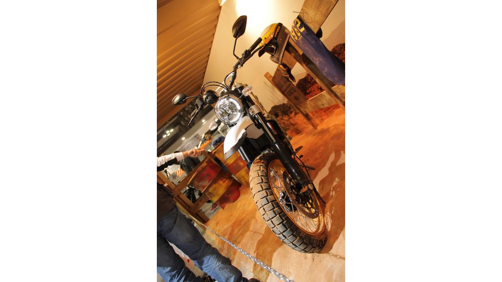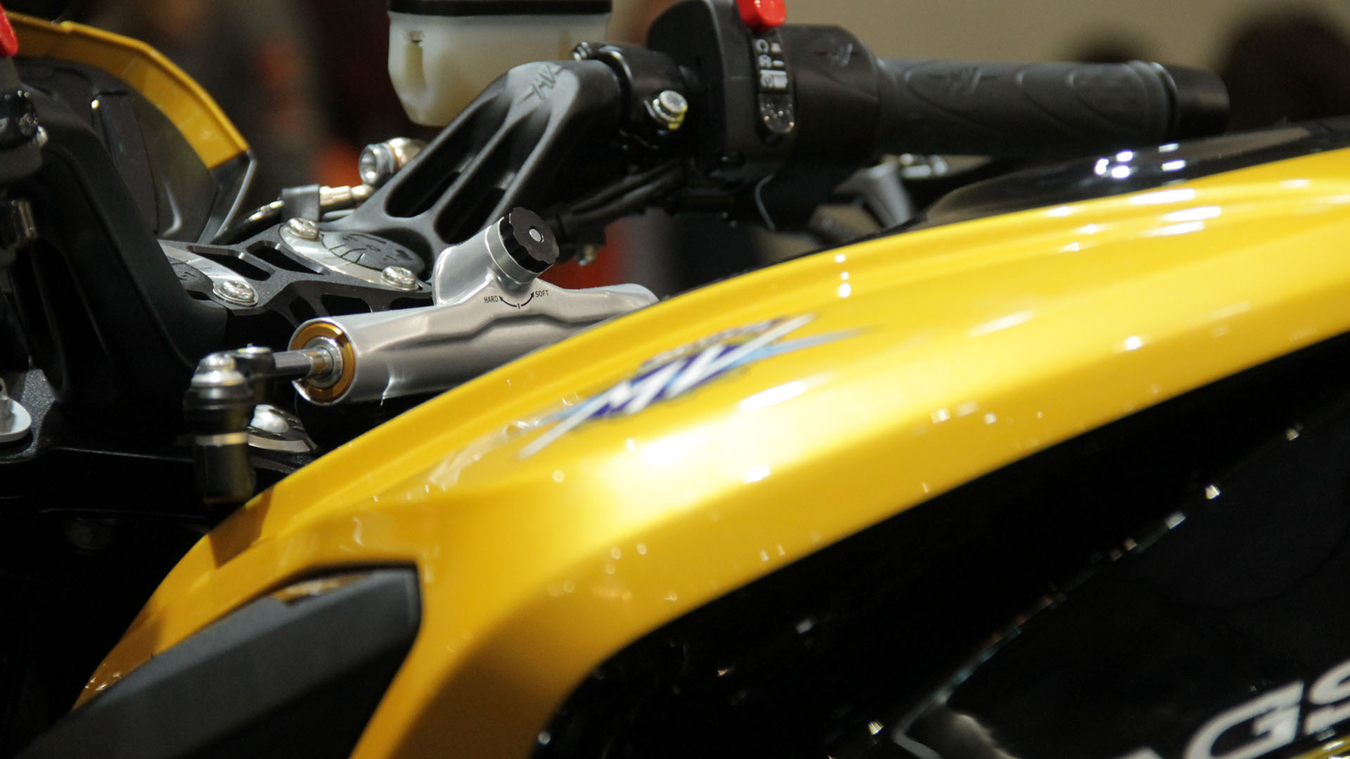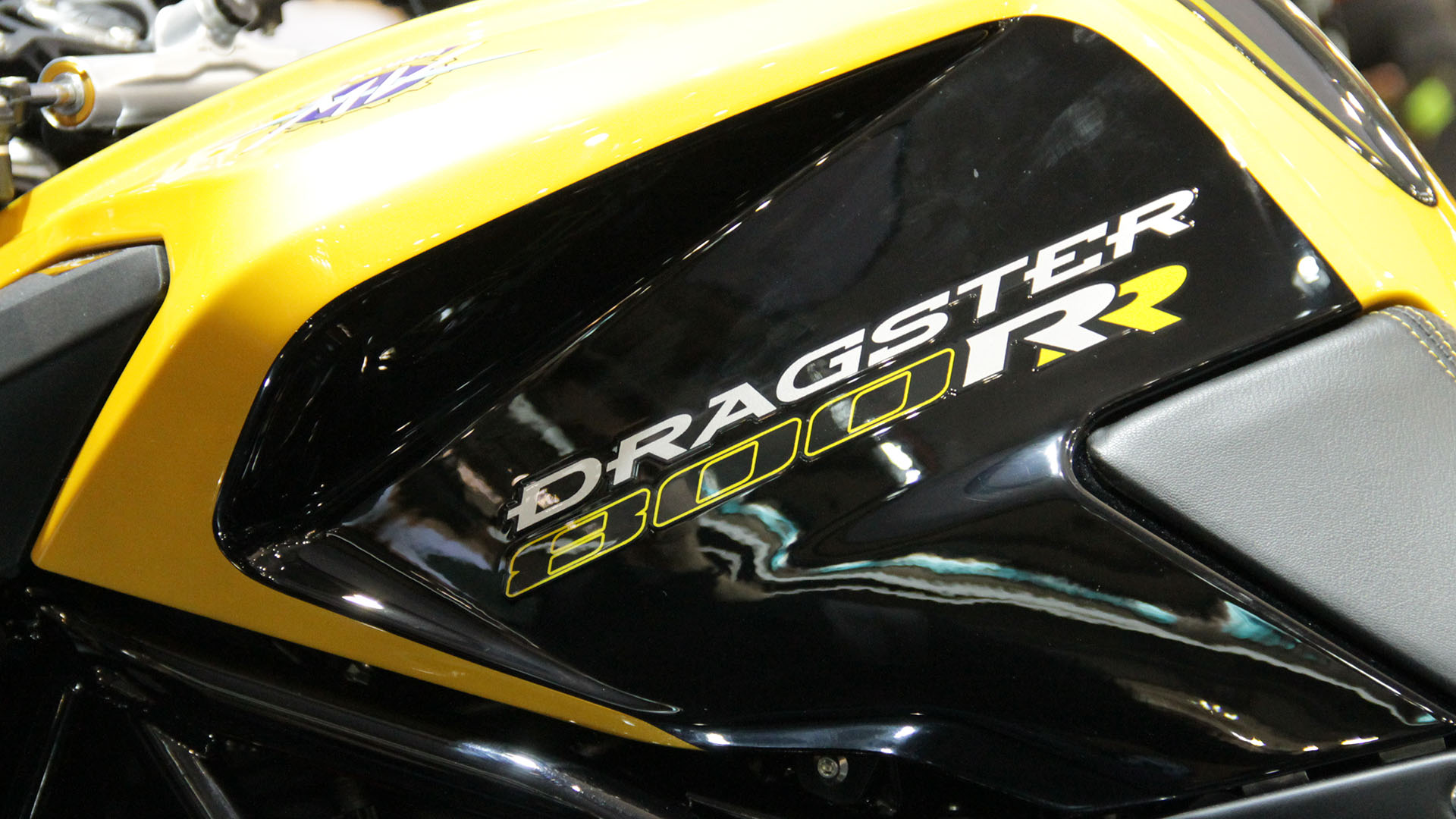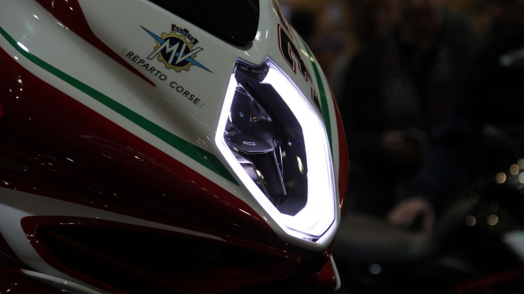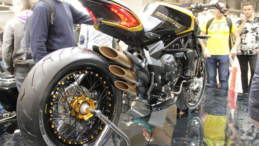 Appena a lato sullo stand della Casa di Schiranna la MV Agusta Dragster 800 RC (affiancata sul palco da una inedita colorazione per Dragster RR), edizione speciale della tricilindrica italiana connotata da una dotazione esclusiva dedicata e dotata di propulsore a tre cilindri da 798 cc (il cui blocco motore ferma l’ago della bilancia entro 52 kg di peso) in grado di sviluppare 140 CV di potenza ad un regime di 13.100 giri/min e dotato, come tutte le tricilindriche varesine, di albero controrotante per abbattere l’inerzia della moto in fase di inserimento in curva.