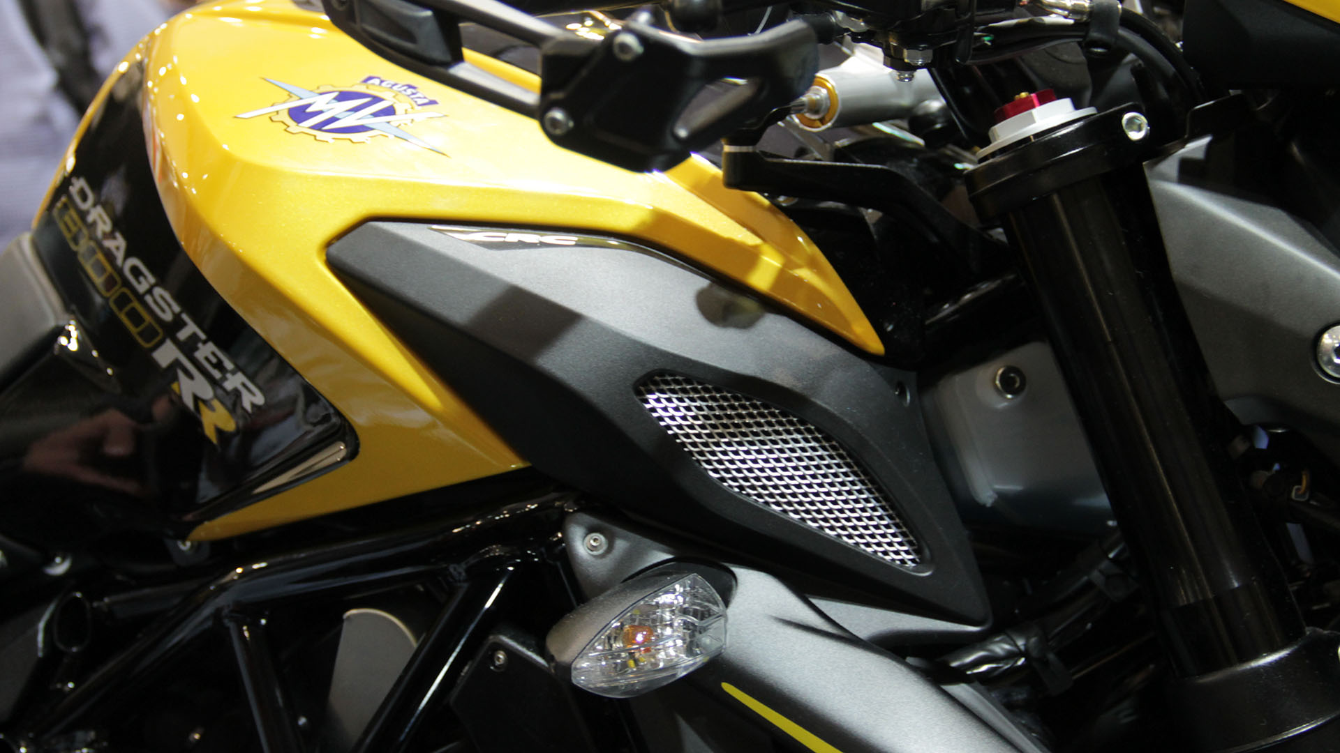 Non mancano ovviamente le dotazioni specifiche. A caratterizzare in maniera inequivocabile la MV Agusta Dragster 800 RC (che verrà prodotta in tiratura limitata a 350 unità), insieme ad una colorazione dedicata, sono una lunga serie di particolari in fibra di carbonio (come ad esempio parafango anteriore, paratie di sfogo dell’aria calda dal radiatore e cupolino); i cerchi forgiati RC e la finitura anodizzata dei foderi della forcella a steli rovesciati (completamente regolabile come l’ammortizzatore Sachs), che fanno il paio alla consueta componentistica di prim’ordine, all’interno della quale spiccano, tra le altre cose, il telaio a struttura mista e i dischi freno Brembo da 320 mm all’anteriore su cui lavorano delle pinze radiali a 4 pistoncini.